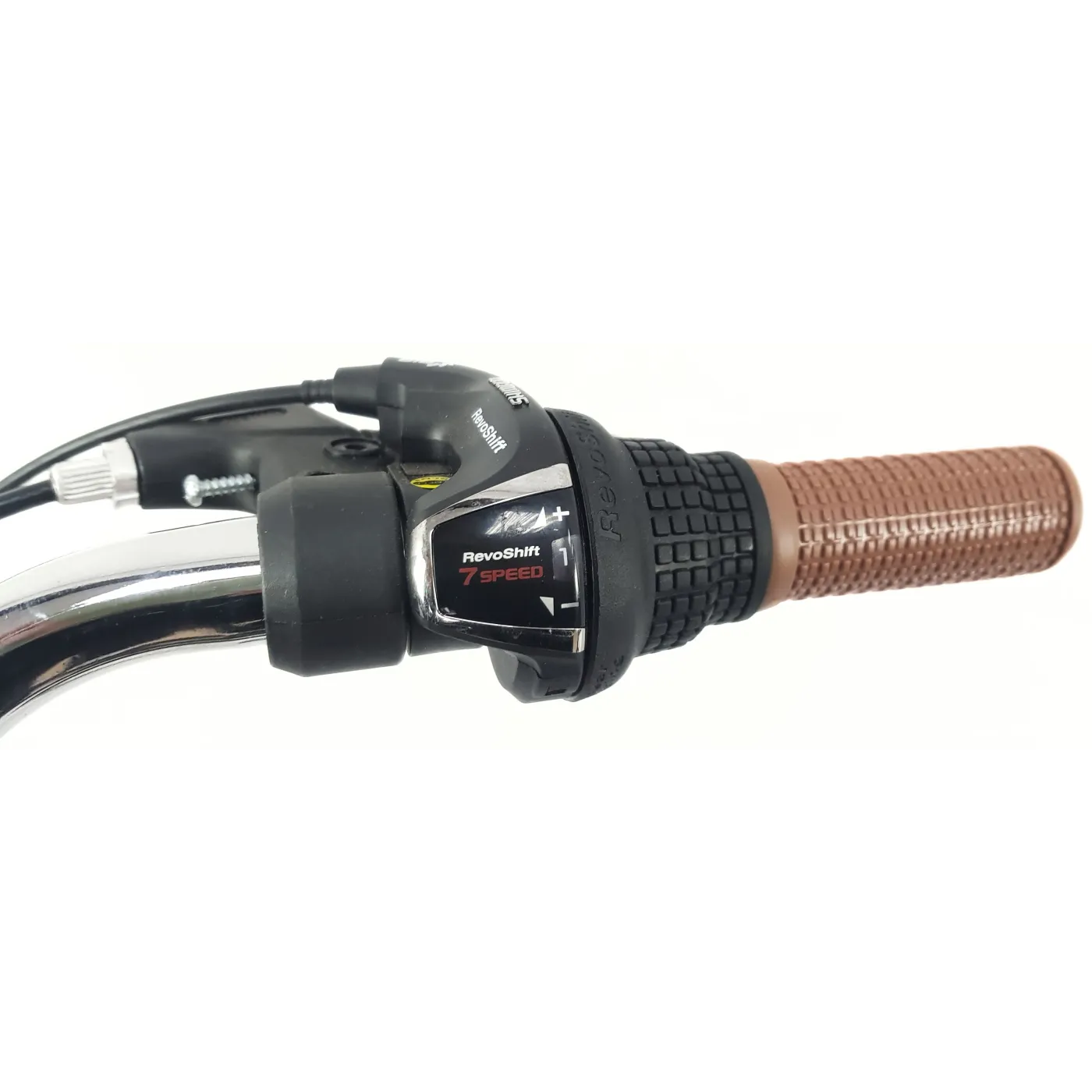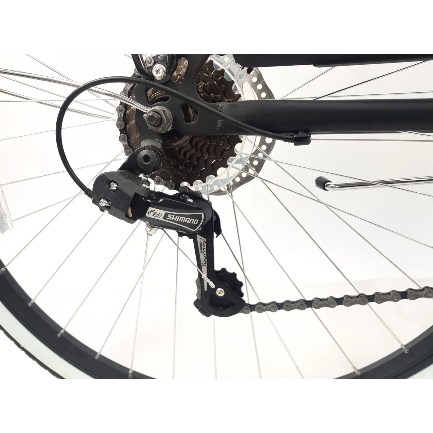 ⚙️ Serce układu napędowego stanowi 7-biegowa przerzutka Shimano Tourney, sterowana sprawdzoną obrotową manetką Shimano Revoshift. Dzięki takiemu rozwiązaniu zmiana przełożeń jest intuicyjna i płynna, co pozwala na łatwe dostosowanie do warunków jazdy. W połączeniu z jednorzędową korbą rower oferuje prostotę, która idealnie sprawdza się w ruchu miejskim.