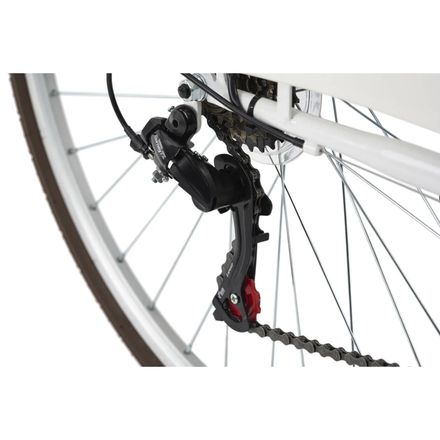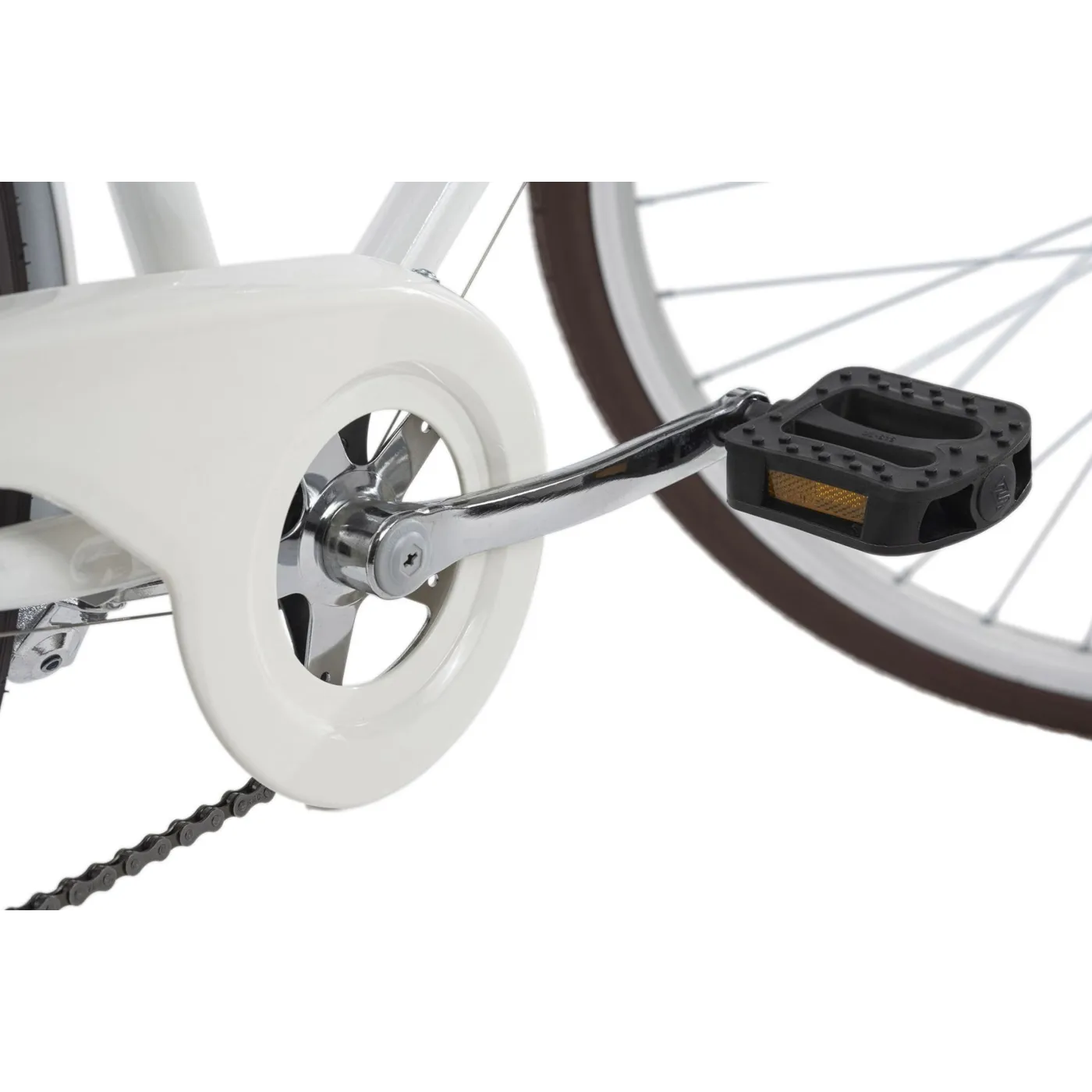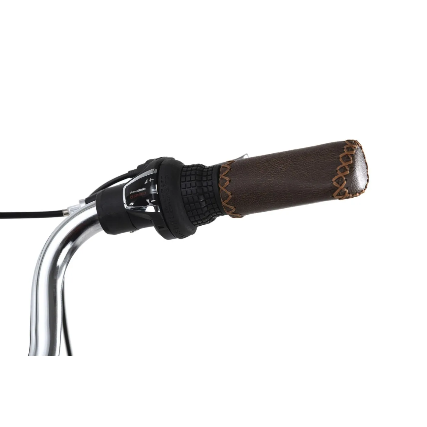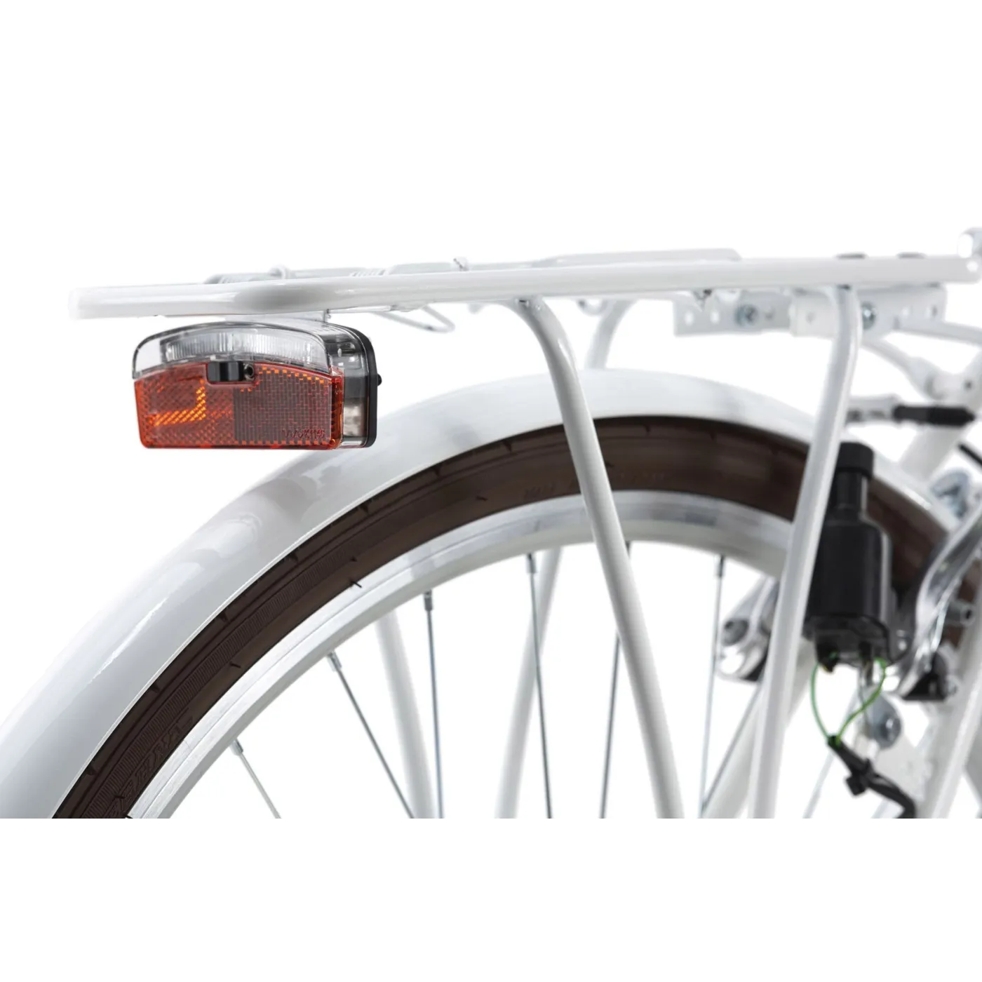 Klasyczny rower miejski w kolorze białym dla kobiet, które na co dzień funkcjonują w mieście. Stowage jest praktyczny i stylowy. Wysoka kierownica i wygodne siodełko zapewnią komfort jazdy, a szyte gripy i brązowe wykończenie dodają uroku. Rower wyposażony jest w hamulce V-brake oraz 6 biegów, dzięki którym dopasuje się do warunków miejskich. Oświetlenie zasilane przez dynamo pozwoli na podróżowanie nawet po zmroku!