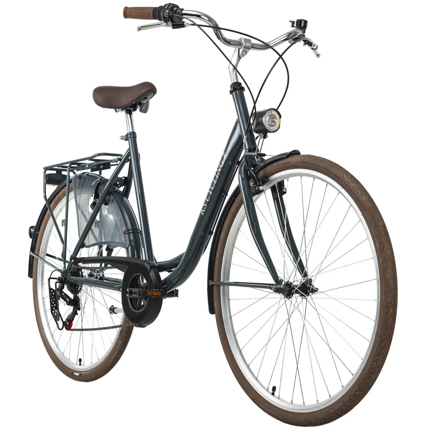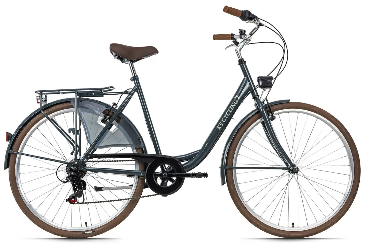 28-calowy damski rower miejski City Six to klasyczny rower do miasta. Jest skierowany do wszystkich, którzy szukają niezawodnego, nieskomplikowanego i łatwego w utrzymaniu i roweru miejskiego. Rower w klasycznym kolorze, brązowe opony, siodełko i chwyty kierownicy nadają mu elegancki wygląd w retro stylu.