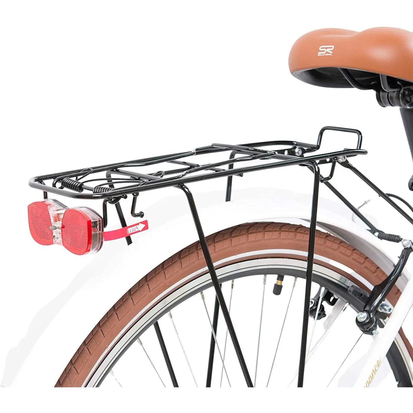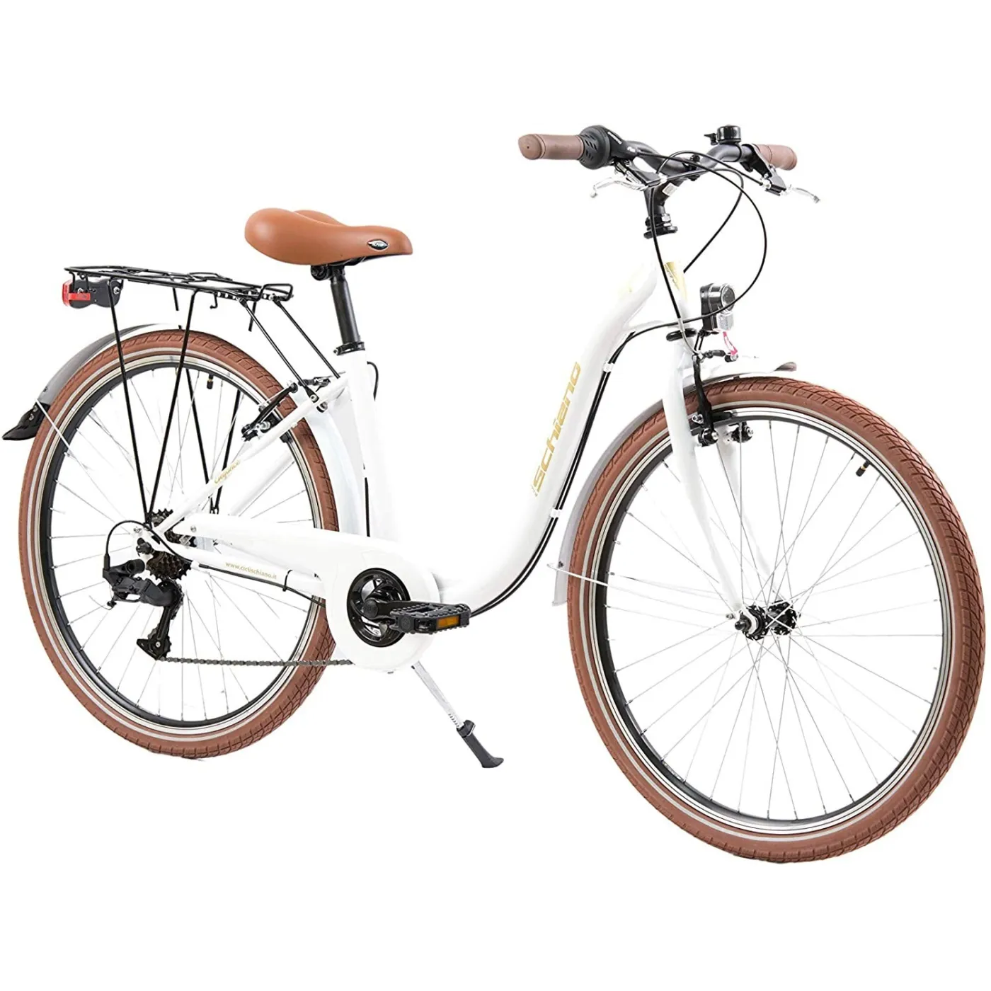 Wysoka kierownica i wygodne siodełko zapewnią komfort jazdy, a gripy, koszyk i brązowe wykończenie dodają uroku. Rower wyposażony jest w hamulce v-brake oraz 7 biegów, dzięki którym dopasuje się do warunków miejskich. Oświetlenie zasilane przez dynamo pozwoli na podróżowanie nawet po zmroku!