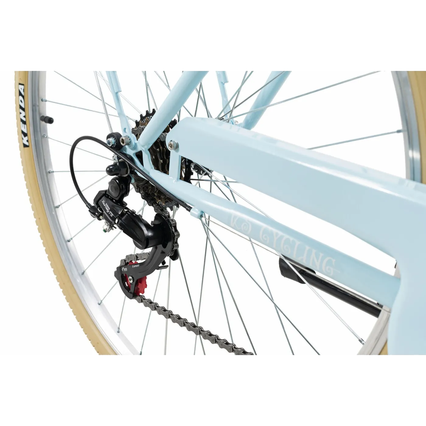 Pastelowy błękitny kolor nadaje mu wyjątkowego charakteru. Do tego kremowe opony, siodełko i chwyty kierownicy oraz stylowa lampa w stylu retro dopełniają elegancki wygląd. W koszyku na kierownicy bez problemu przewieziesz swoje zakupy. Miejska wysoka kierownica pozwoli idealnie dopasować pozycję jazdy do każdego rowerzysty. 6-biegowa przerzutka SHIMANO Tourney oferuje wygodną i płynną jazdę dostosowaną do Twoich potrzeb. Biegi możesz łatwo zmieniać dzięki intuicyjnej manetce obrotowej.
