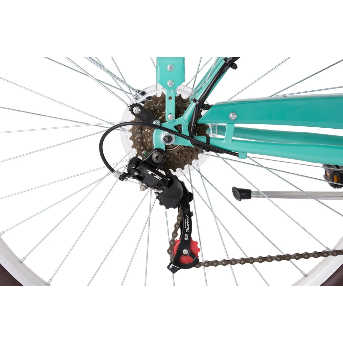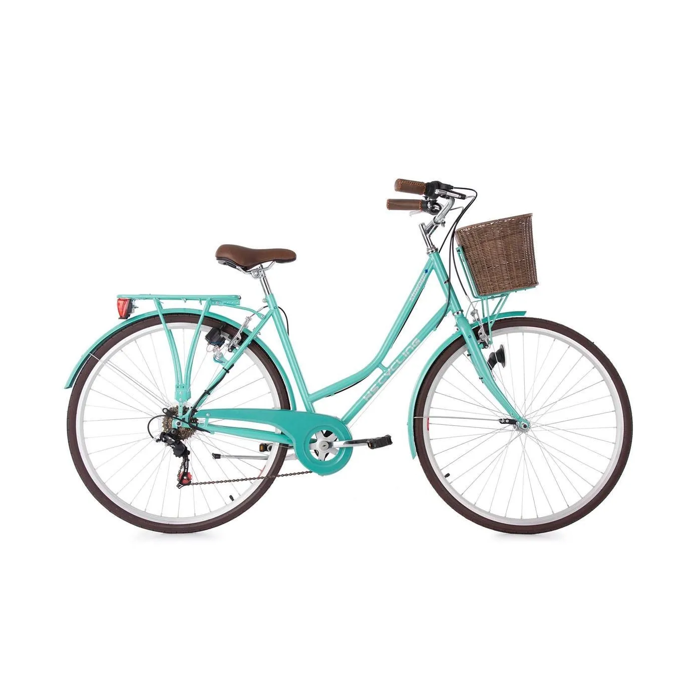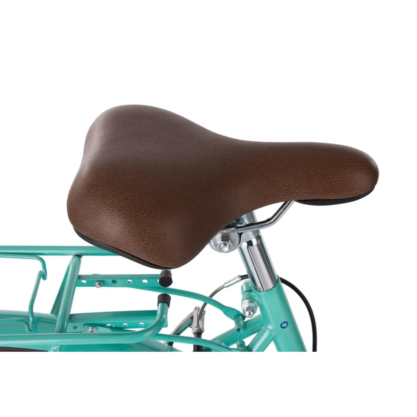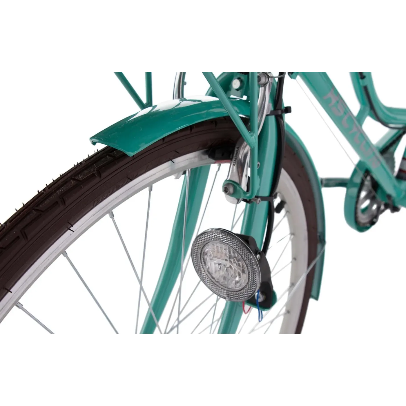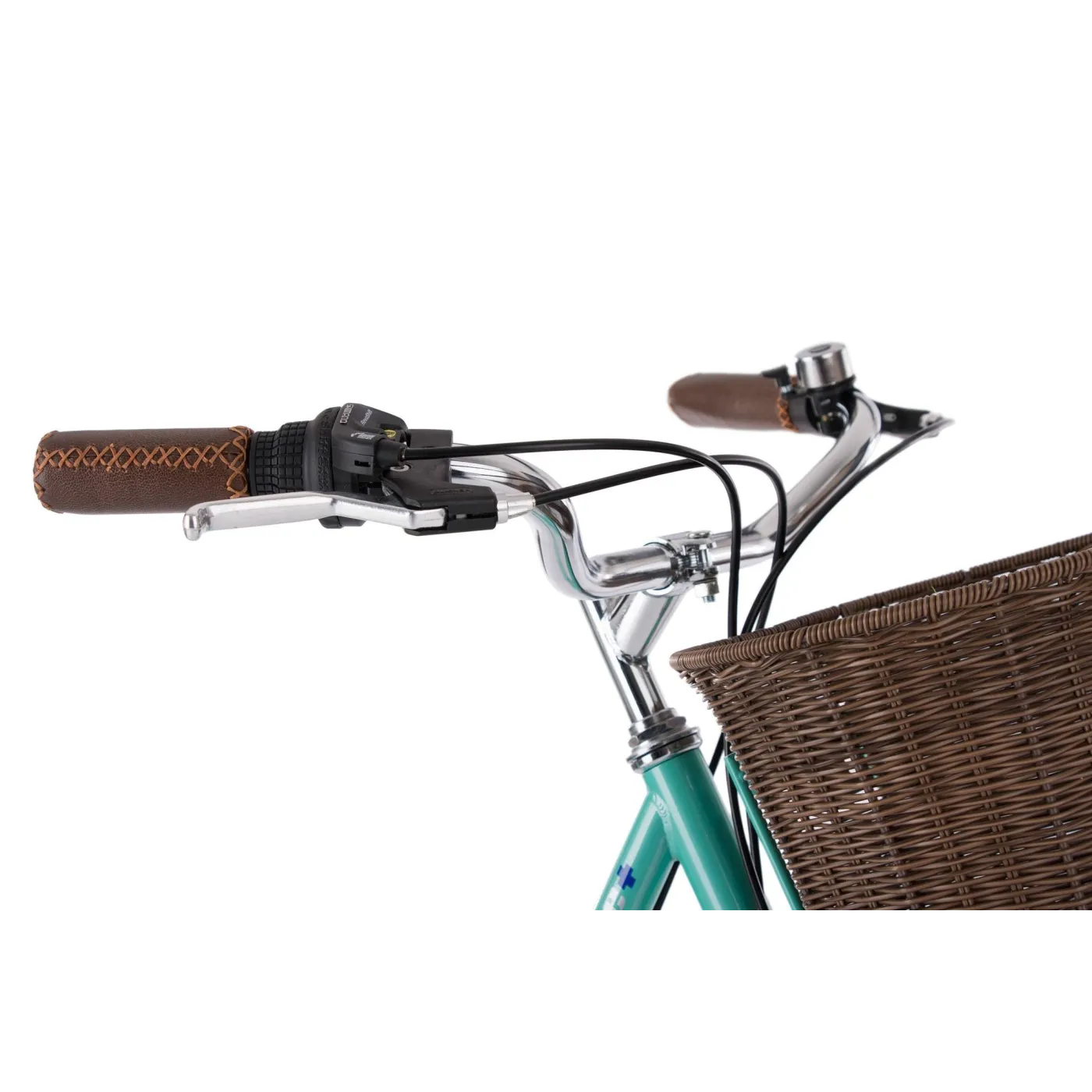 Jego świeży, wyjątkowy miętowy kolor dodaje mu niepowtarzalnego uroku, zaś odpowiednio wyprofilowana kierownica zapewnia wysoki komfort jazdy. Rower wyposażony został w bagażnik, koszyk, nóżkę oraz reflektory zasilane dynamo, czyli we wszystko, co jest potrzebne do odbywania zarówno dłuższych, jak i krótszych wycieczek.