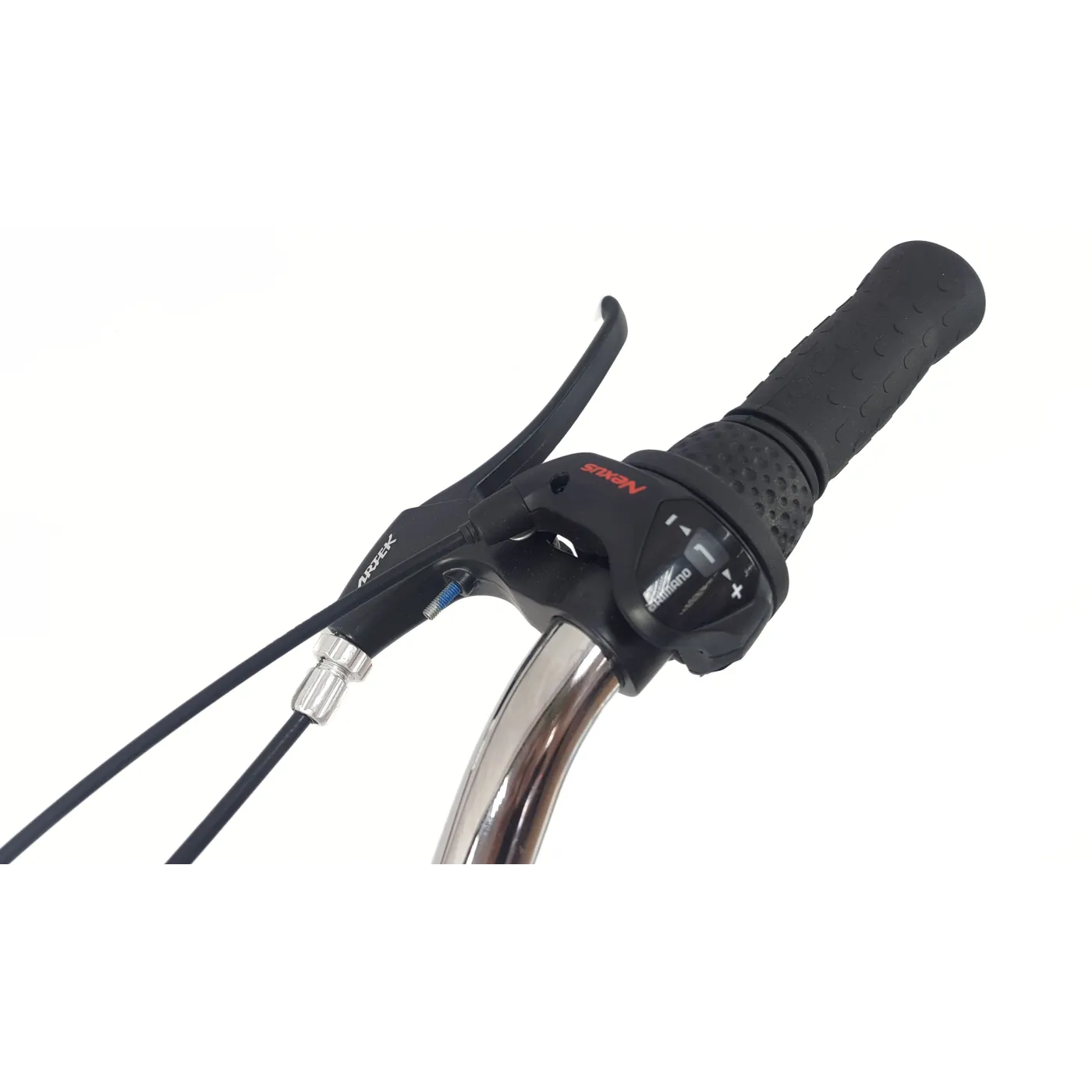 👉 Rower damski zdobywa również punkty pod względem parametrów technicznych. Przerzutka w piaście Shimano Nexus z 3 biegami i hamulcem nożnym jest wypróbowana i przetestowana i nie wymaga prawie żadnej konserwacji. Hamulec szczękowy na przednim kole zapewnia bezpieczne hamowanie. Opony 28 cali wyposażone są w profil optymalny do jazdy po mieście oraz pasek odblaskowy.