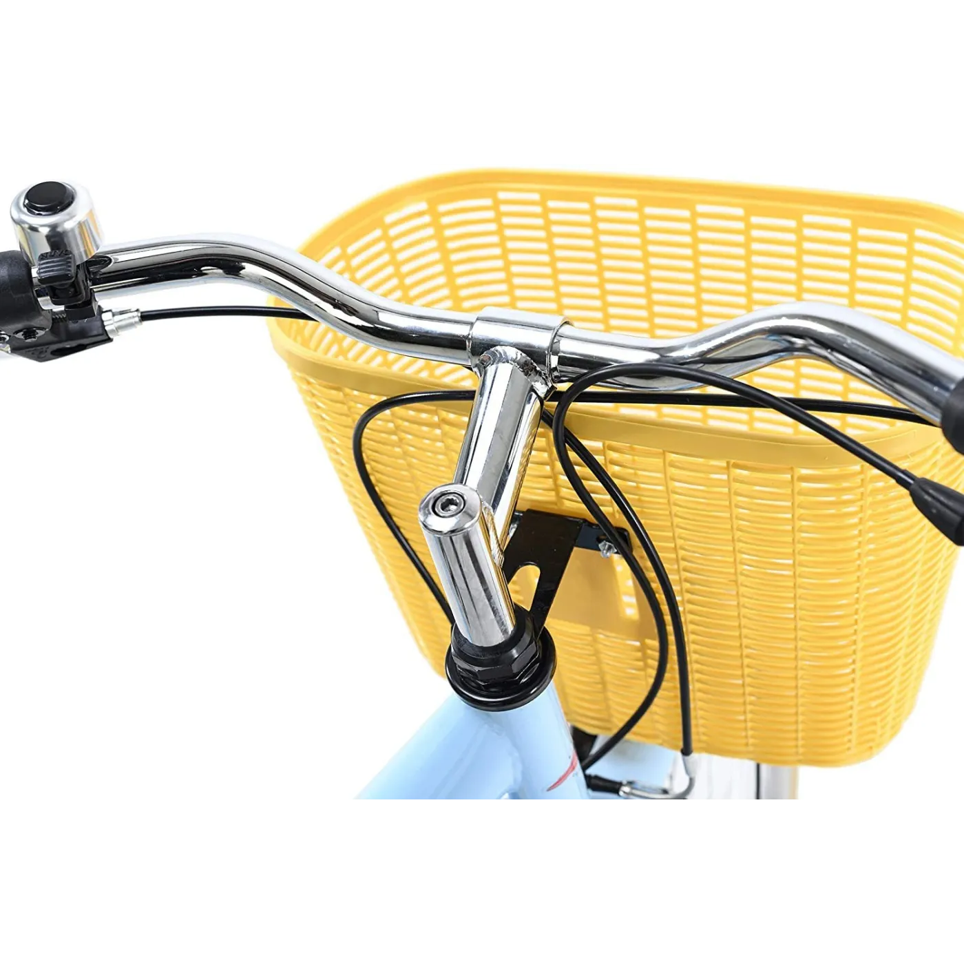 Rower wyposażony jest w niezbędne akcesoria, takie jak bagażnik, błotniki, osłona łańcucha oraz oświetlenie, które pozwoli na bezpieczną jazdę nawet po zmroku. Żółty kosz znajdujący się przy kierownicy jest nie tylko stylowym dodatkiem ale jest również bardzo praktyczny do przechowywania np. zakupów lub torebki. Pełny pakiet akcesoriów sprawia, że jest to idealny partner na codzienne wycieczki.