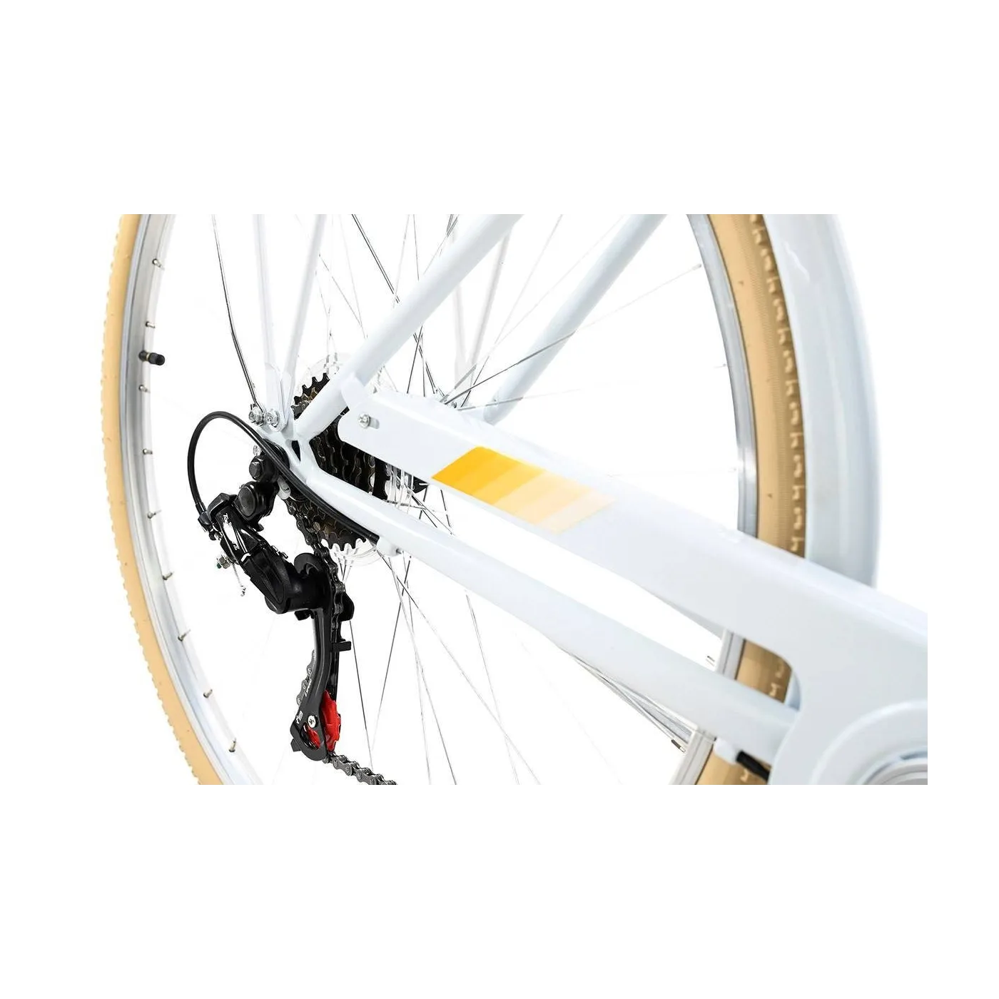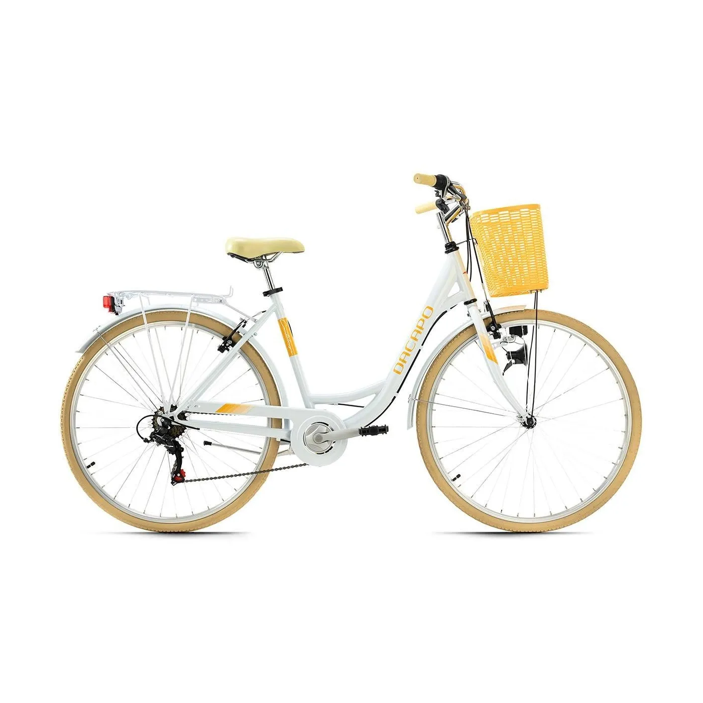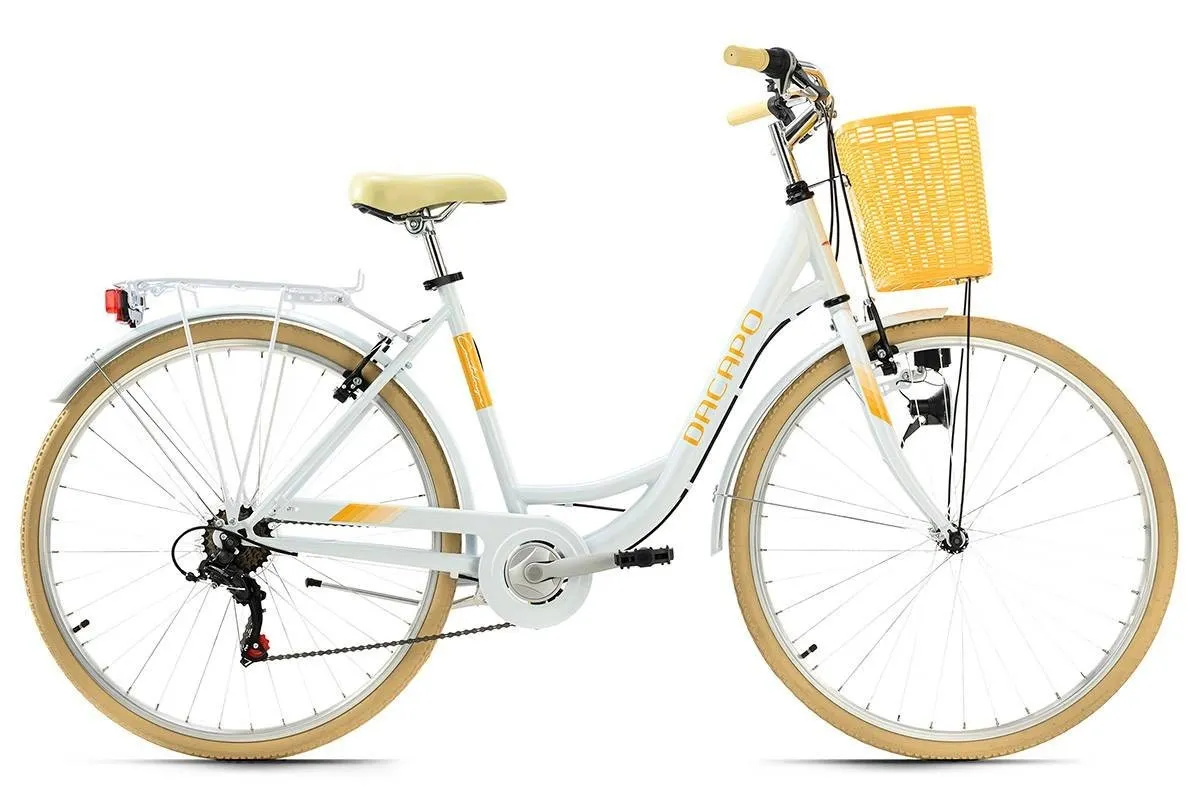 Rower wyposażony jest w niezbędne akcesoria, takie jak bagażnik, błotniki, osłona łańcucha oraz oświetlenie, które pozwoli na bezpieczną jazdę nawet po zmroku. Żółty kosz znajdujący się przy kierownicy jest nie tylko stylowym dodatkiem ale jest również bardzo praktyczny do przechowywania np. zakupów lub torebki. Pełny pakiet akcesoriów sprawia, że jest to idealny partner na codzienne wycieczki.