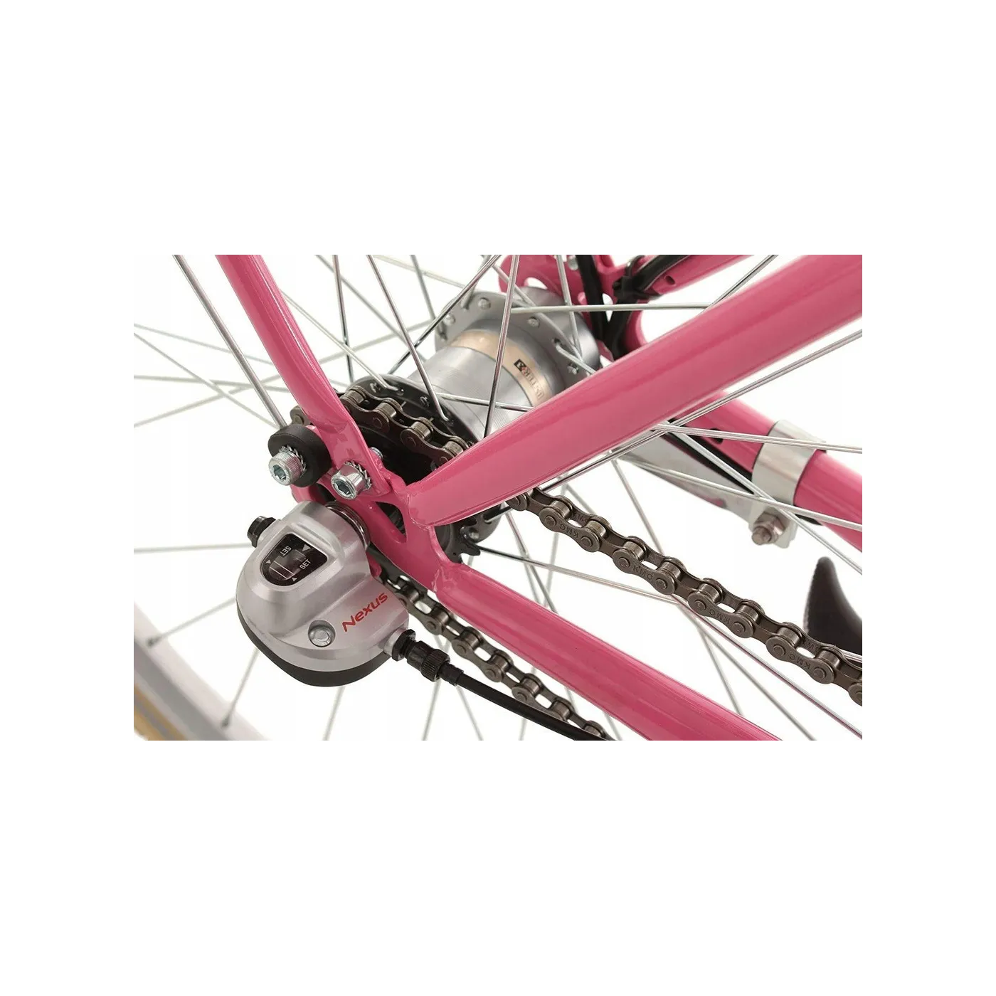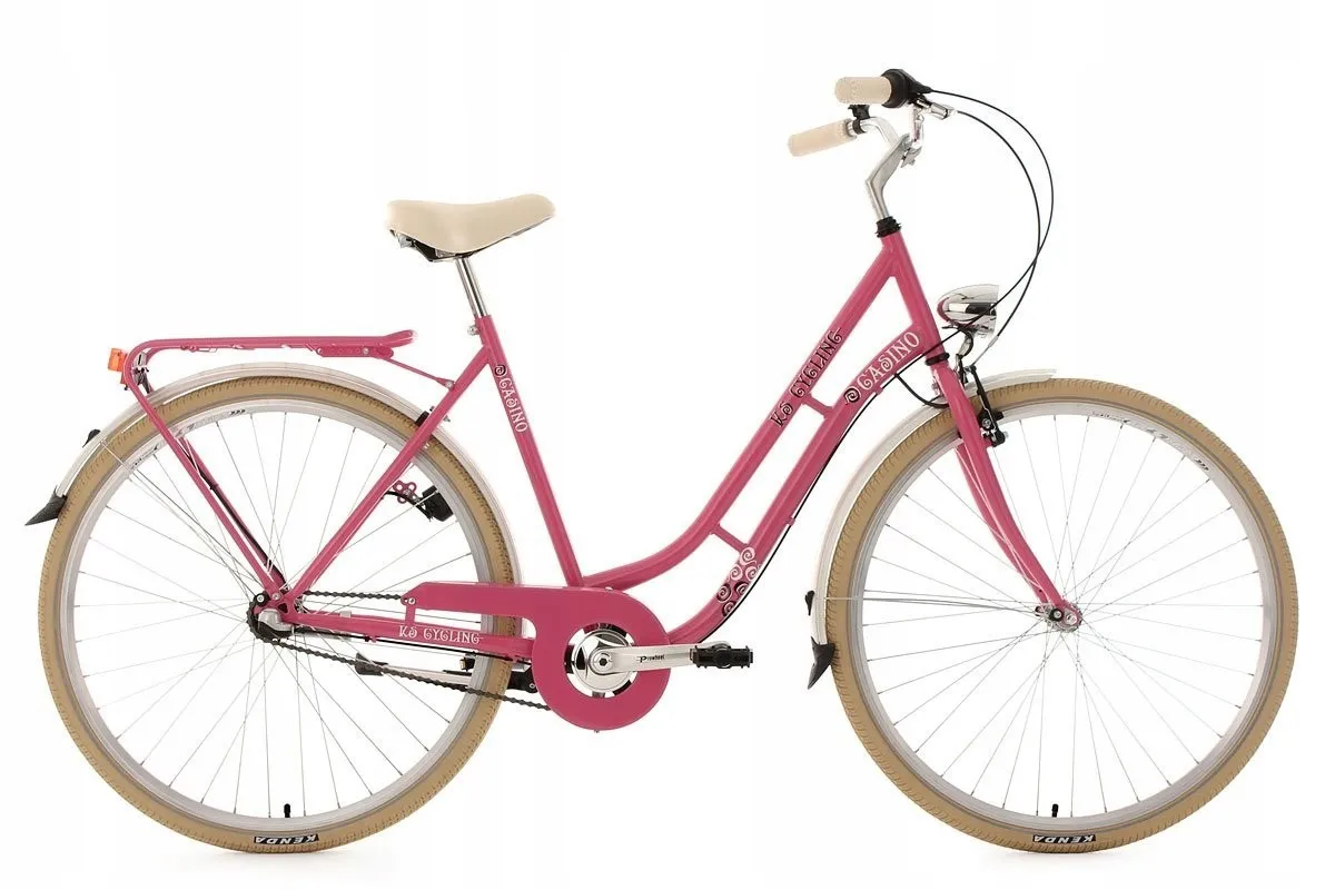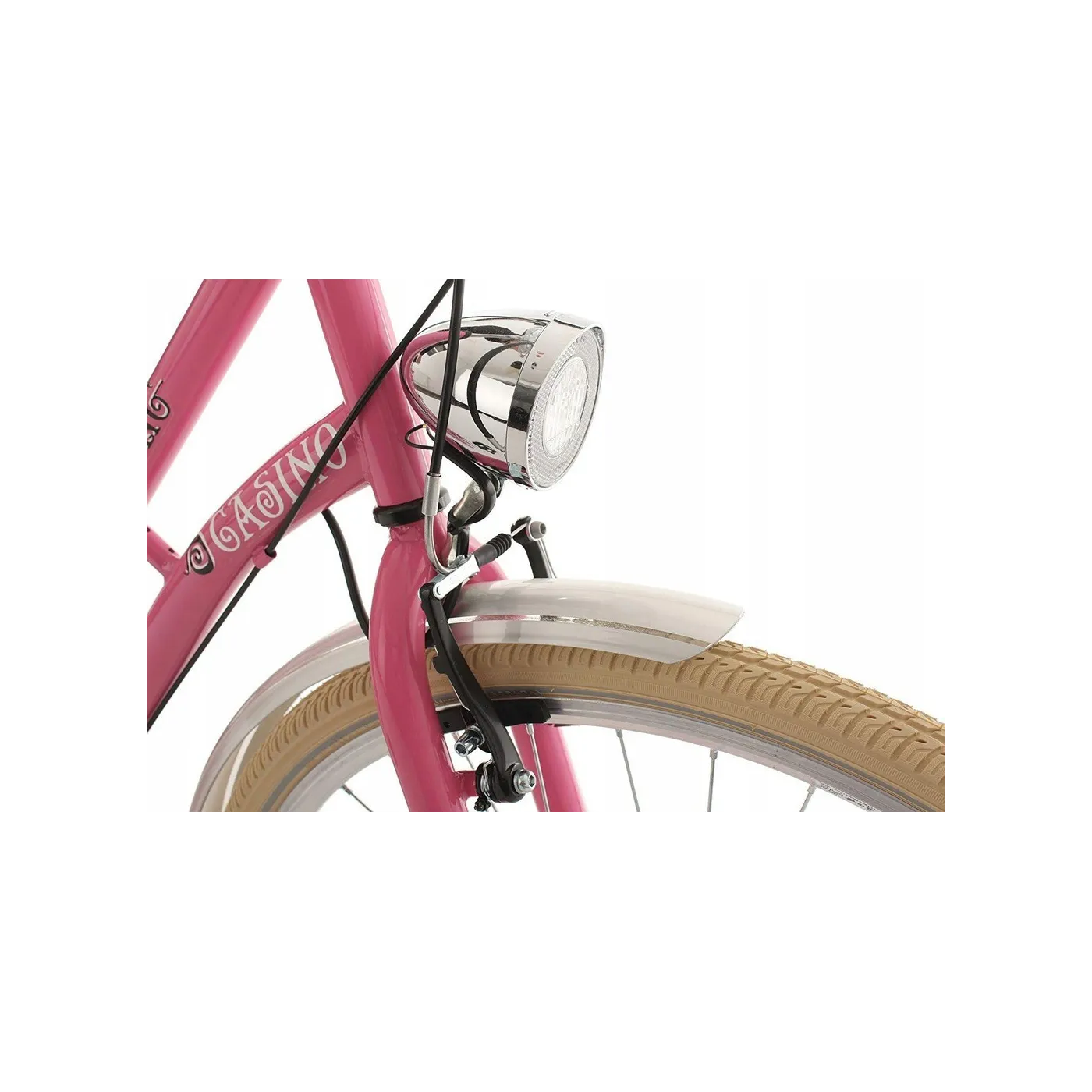 Casino firmy Ks Cycling to stylowy towarzysz na wszystkie, piękne letnie dni. Rama o nowoczesnym różowym kolorze w połączeniu z dopasowanym uchwytem, siodełkiem oraz oponami w kolorze kremowym nadają mu niepowtarzalny wygląd retro. Wyposażenie w 3 biegową przerzutkę Shimano Nexus umożliwia łatwą kontrolę pojazdu podczas codziennych wypadów. Pamiętając natomiast o Twoim bezpieczeństwie zamontowano oświetlenie napędzane zasilane dynamo oraz hamulce V-Brake wraz z torpedo, dzięki czemu jazda po zmroku nie będzie trudnością, a zatrzymanie w nagłych sytuacjach będzie bezproblemowe.