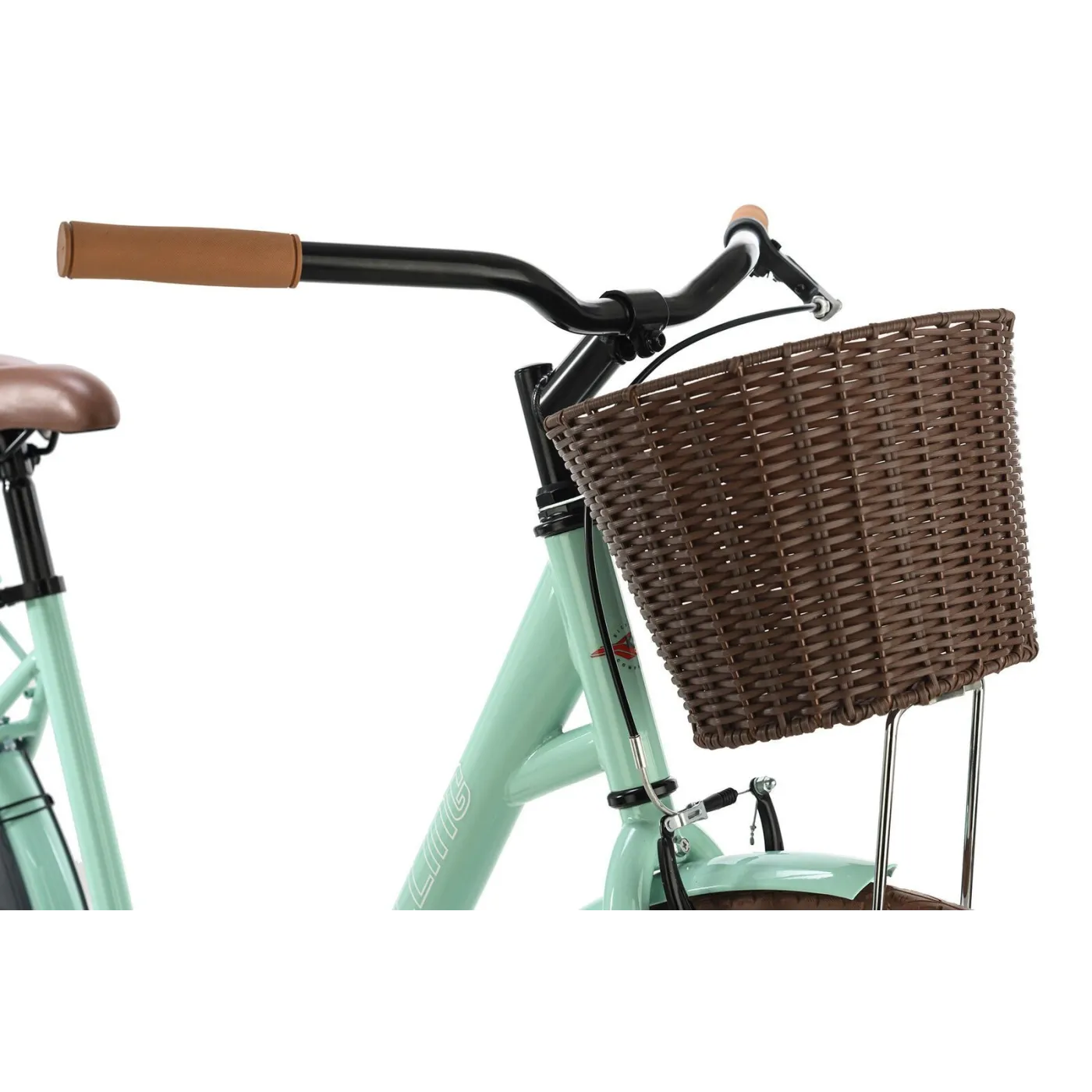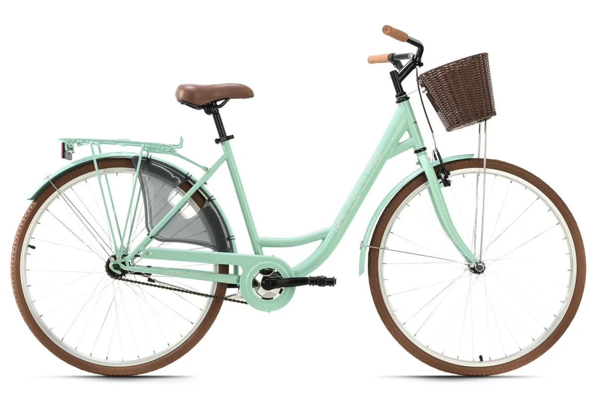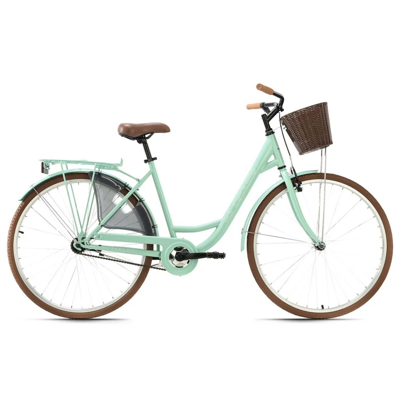 28-calowy damski rower miejski ZEELAND to klasyczny rower do miasta pozbawiony zbędnych Jest skierowany do wszystkich, którzy szukają niezawodnego, nieskomplikowanego i łatwego w utrzymaniu i roweru miejskiego. Rower w świeżych, pastelowych kolorach przywodzi na myśl wiosenne i letnie dni, natomiast brązowe opony, siodełko i chwyty kierownicy nadają rowerowi elegancki wygląd w retro stylu.