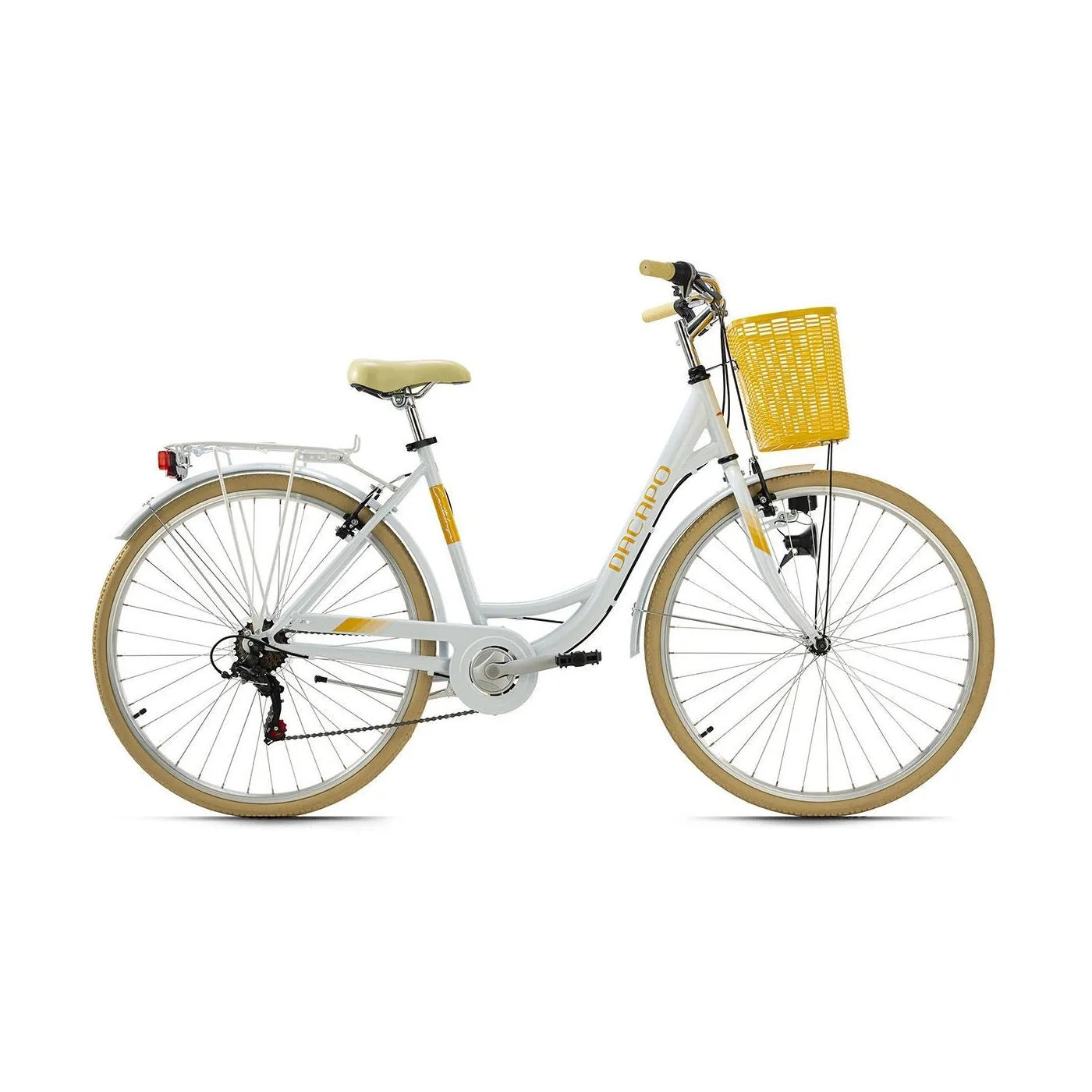 Rower wyposażony jest w niezbędne akcesoria, takie jak bagażnik, błotniki, osłona łańcucha oraz oświetlenie, które pozwoli na bezpieczną jazdę nawet po zmroku. Żółty kosz znajdujący się przy kierownicy jest nie tylko stylowym dodatkiem ale jest również bardzo praktyczny do przechowywania np. zakupów lub torebki. Pełny pakiet akcesoriów sprawia, że jest to idealny partner na codzienne wycieczki.