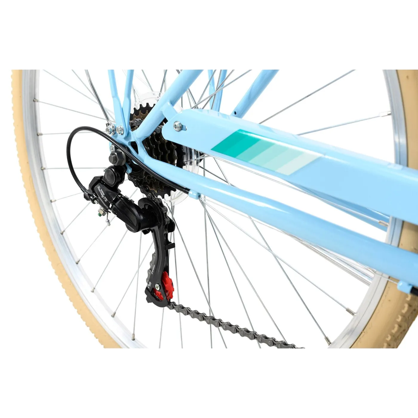 Rama w modnych pastelowych kolorach i jasne dodatki sprawiają, że rower przyciąga wzrok. Dzięki 6-biegowej przerzutce możesz spokojnie jeździć po mieście - osprzęt marki Shimano to niezawodność i płynność jazdy.