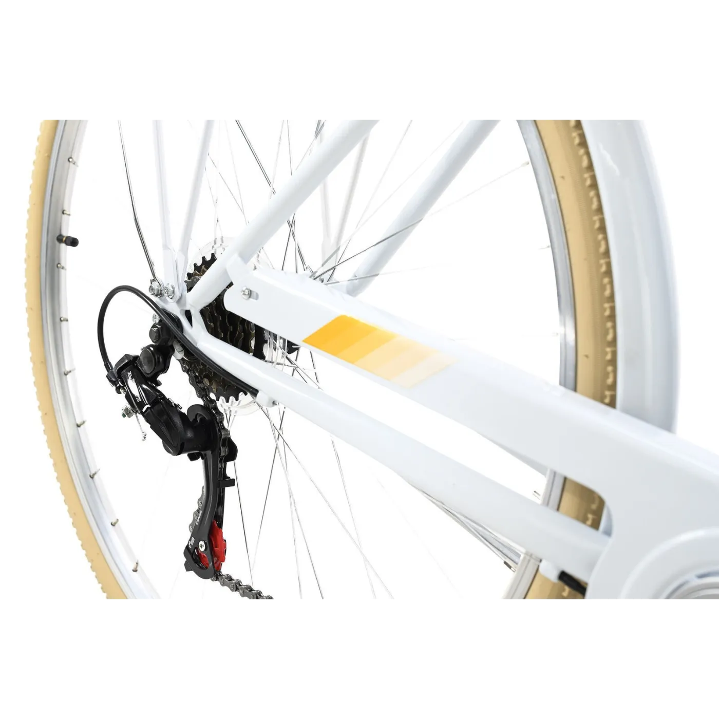Rower wyposażony jest w niezbędne akcesoria, takie jak błotniki, osłona łańcucha oraz oświetlenie, które pozwoli na bezpieczną jazdę nawet po zmroku. Tylny bagażnik jest bardzo praktyczny do przechowywania np. zakupów lub torebki. Pełny pakiet akcesoriów sprawia, że jest to idealny partner na codzienne wycieczki.