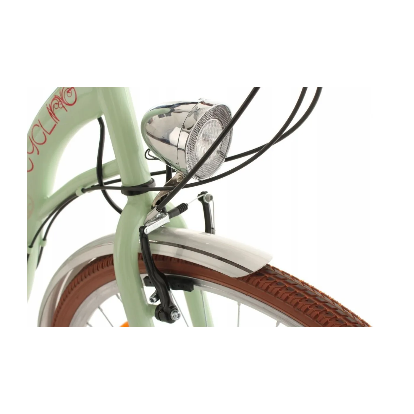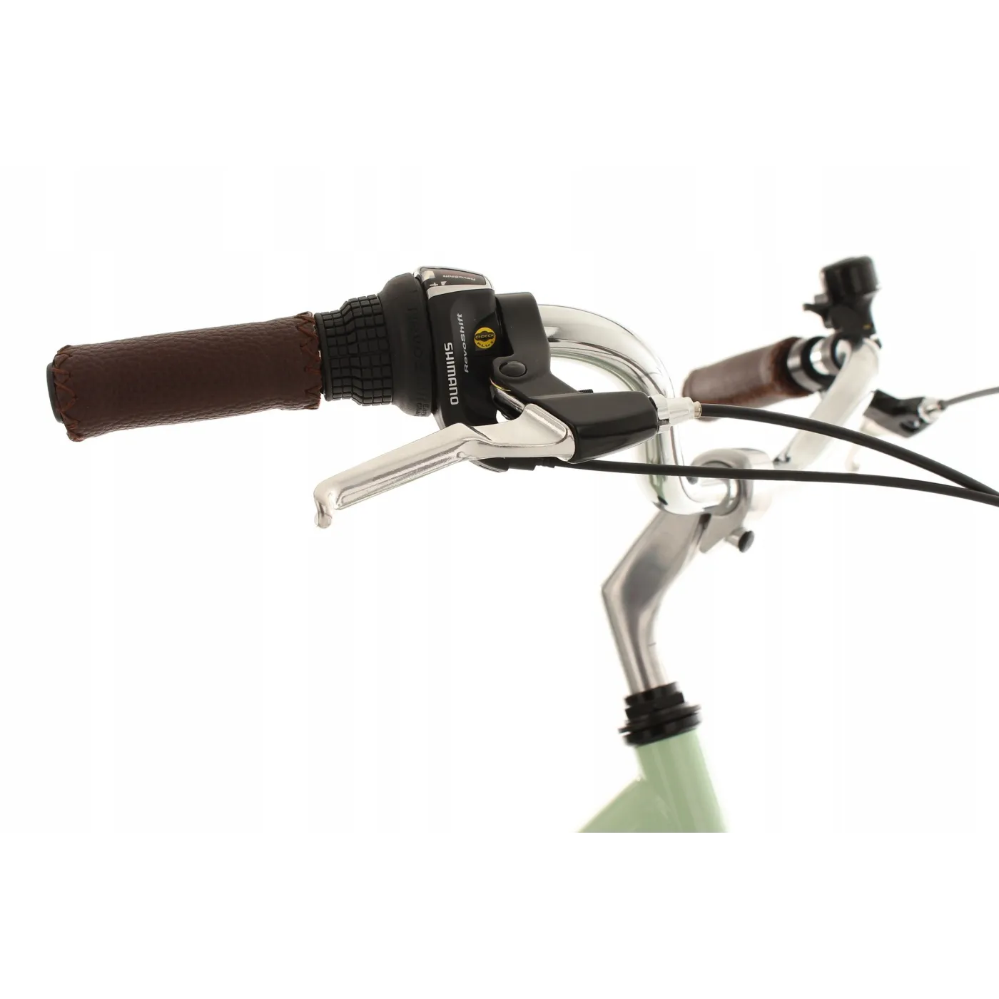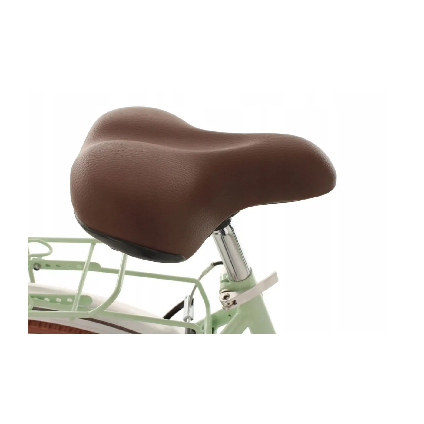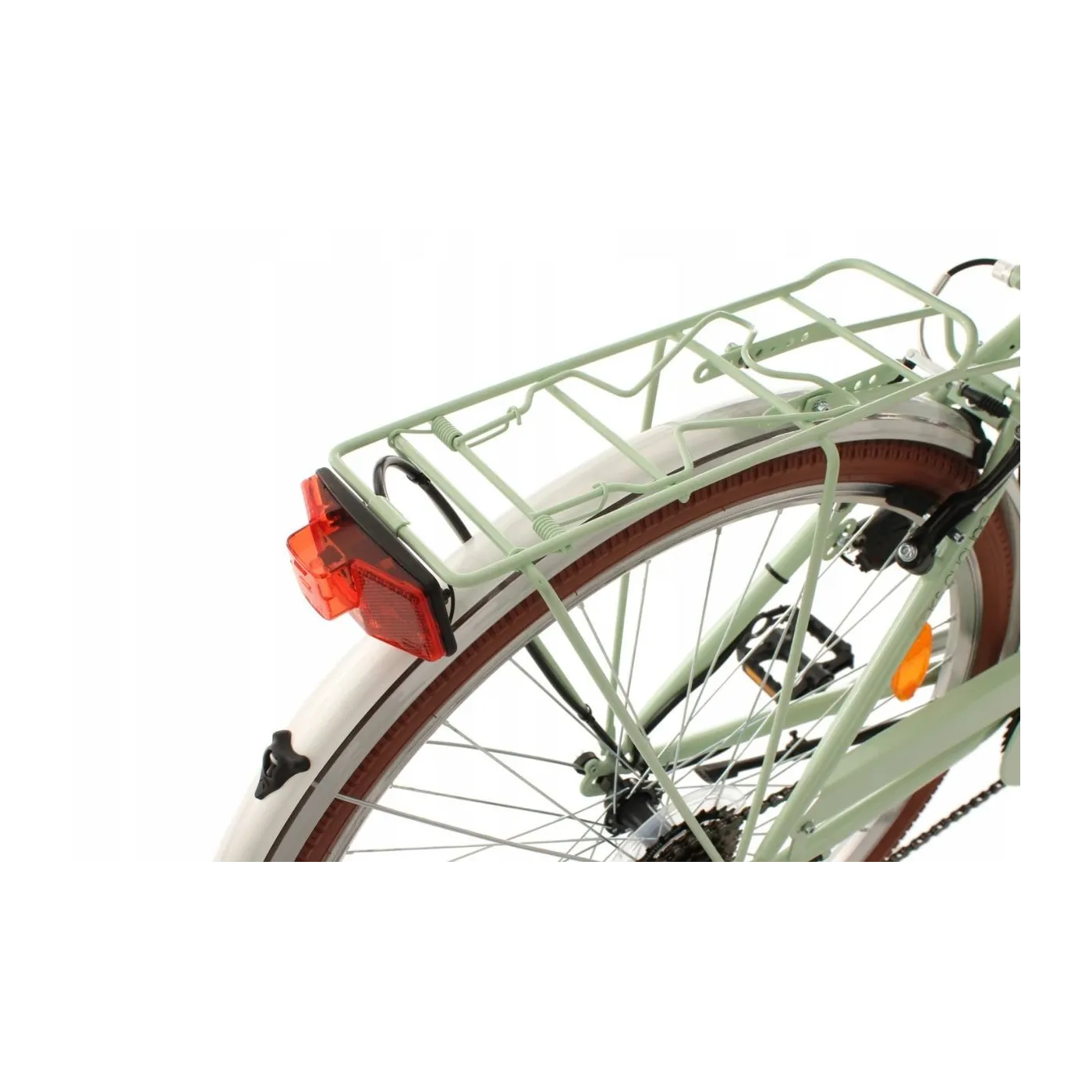 Rower miejski Eden zachwyca swoją świeżą, miętową barwą, oraz doskonale komponującą się czekoladową barwą opon i dodatków. Posiada bagażnik oraz wyjątkowo wygodne siodełko, które sprawi że Twoja miejska przejażdżka będzie komfortowa. Rower wyposażony został w wysokiej klasy przerzutki Shimano, zapewniające pełen komfort użytkowania, niezależnie od rodzaju trasy, którą wybierzemy. Dzięki halogenowym reflektorom zasilanym przez dynamo, możemy mieć pewność, że będziemy doskonałe widoczne i podróż po zmroku będzie bezpieczniejsza.