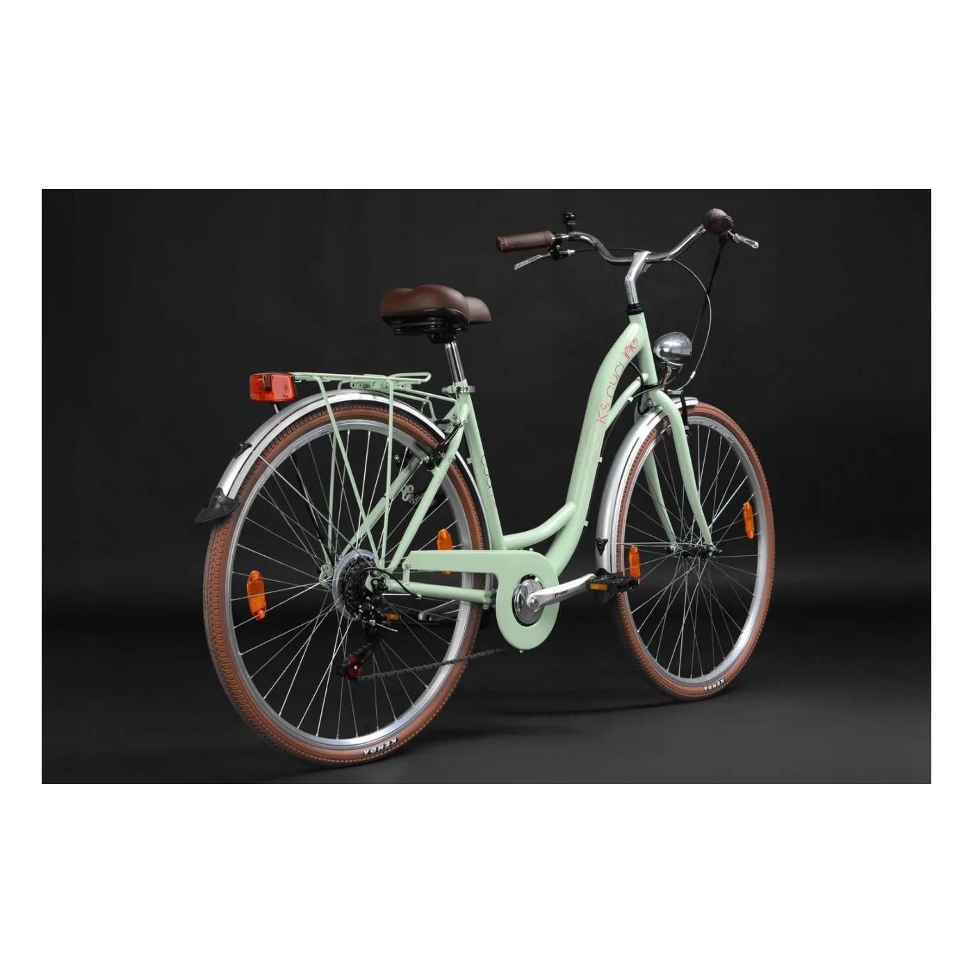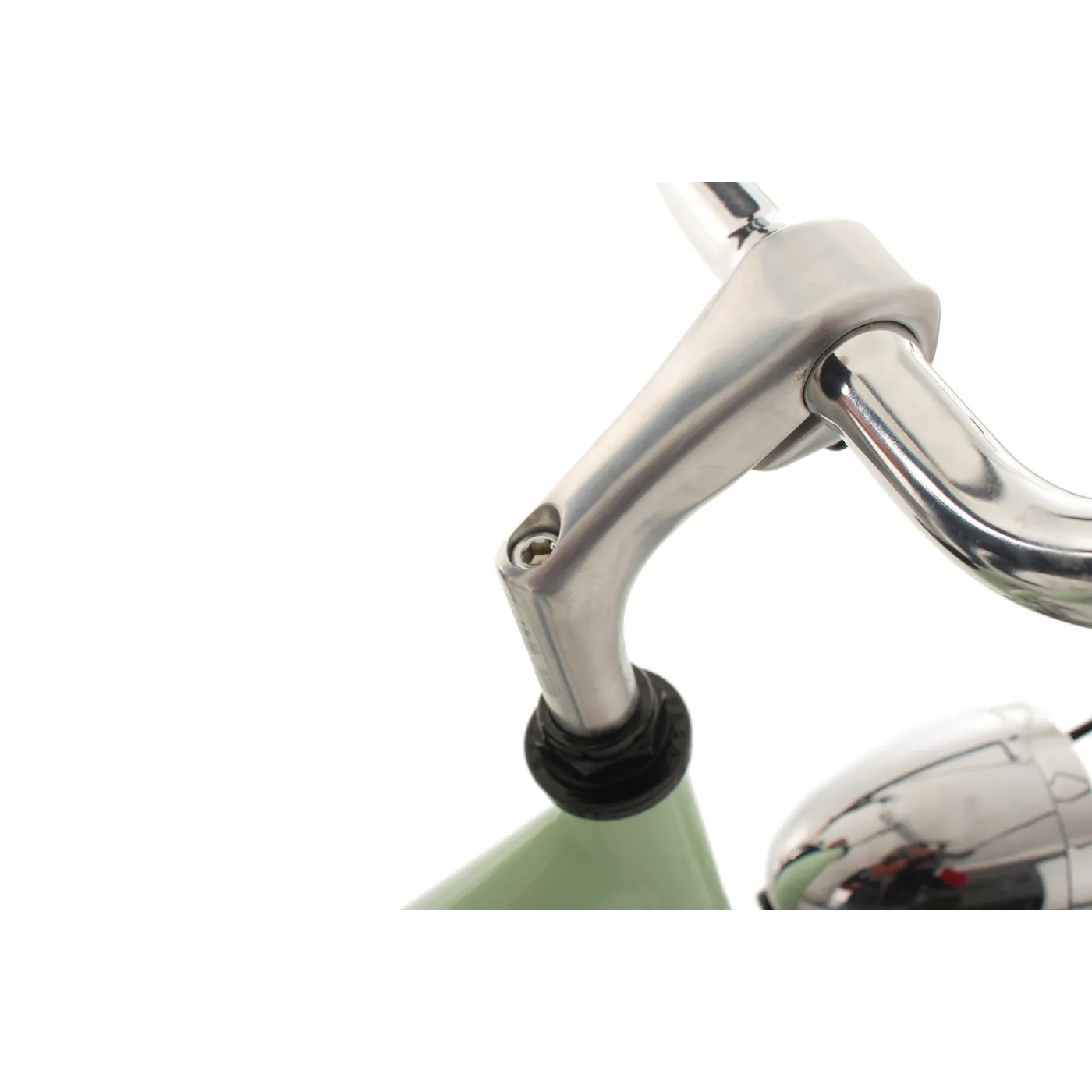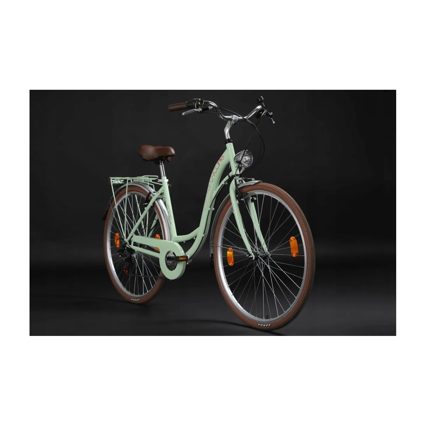 Rower miejski Eden zachwyca swoją świeżą, miętową barwą, oraz doskonale komponującą się czekoladową barwą opon i dodatków. Posiada bagażnik oraz wyjątkowo wygodne siodełko, które sprawi że Twoja miejska przejażdżka będzie komfortowa. Rower wyposażony został w wysokiej klasy przerzutki Shimano, zapewniające pełen komfort użytkowania, niezależnie od rodzaju trasy, którą wybierzemy. Dzięki halogenowym reflektorom zasilanym przez dynamo, możemy mieć pewność, że będziemy doskonałe widoczne i podróż po zmroku będzie bezpieczniejsza.