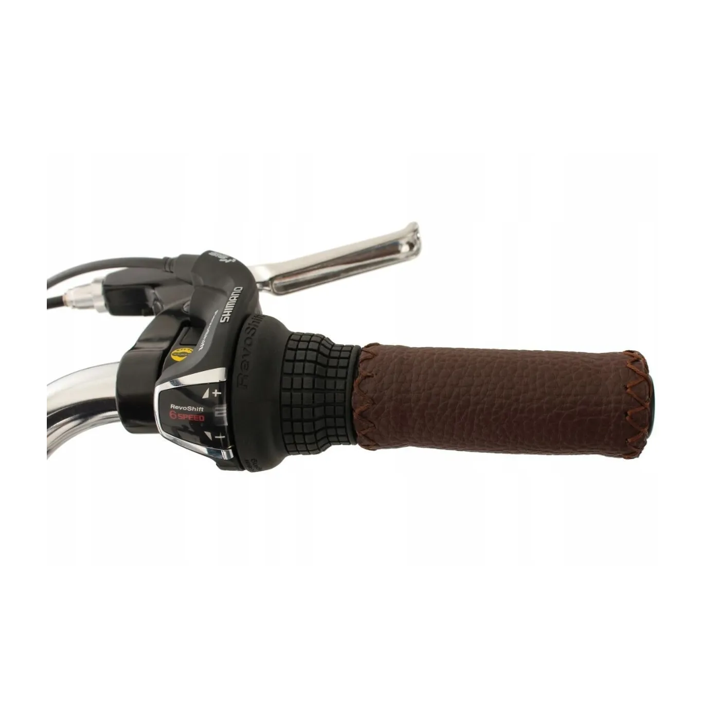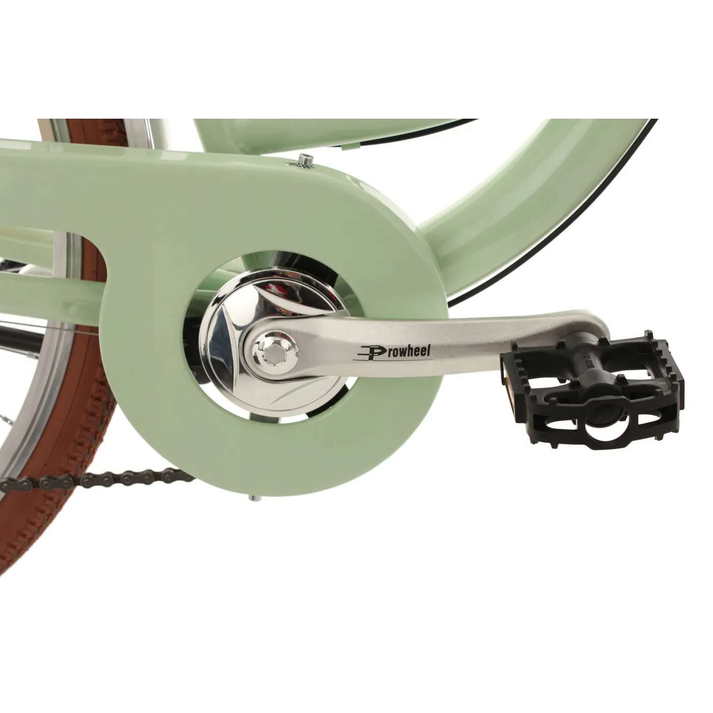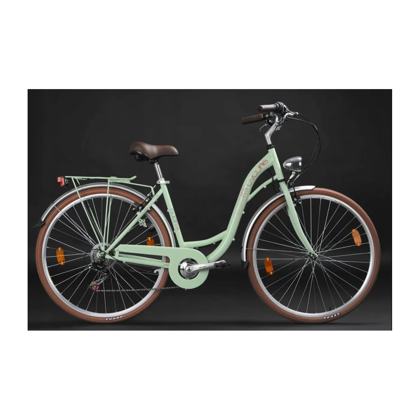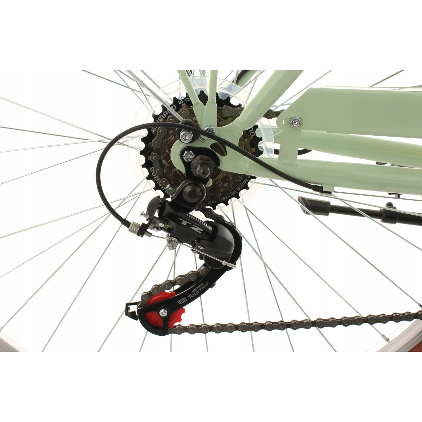 Rower miejski Eden zachwyca swoją świeżą, miętową barwą, oraz doskonale komponującą się czekoladową barwą opon i dodatków. Posiada bagażnik oraz wyjątkowo wygodne siodełko, które sprawi że Twoja miejska przejażdżka będzie komfortowa. Rower wyposażony został w wysokiej klasy przerzutki Shimano, zapewniające pełen komfort użytkowania, niezależnie od rodzaju trasy, którą wybierzemy. Dzięki halogenowym reflektorom zasilanym przez dynamo, możemy mieć pewność, że będziemy doskonałe widoczne i podróż po zmroku będzie bezpieczniejsza.