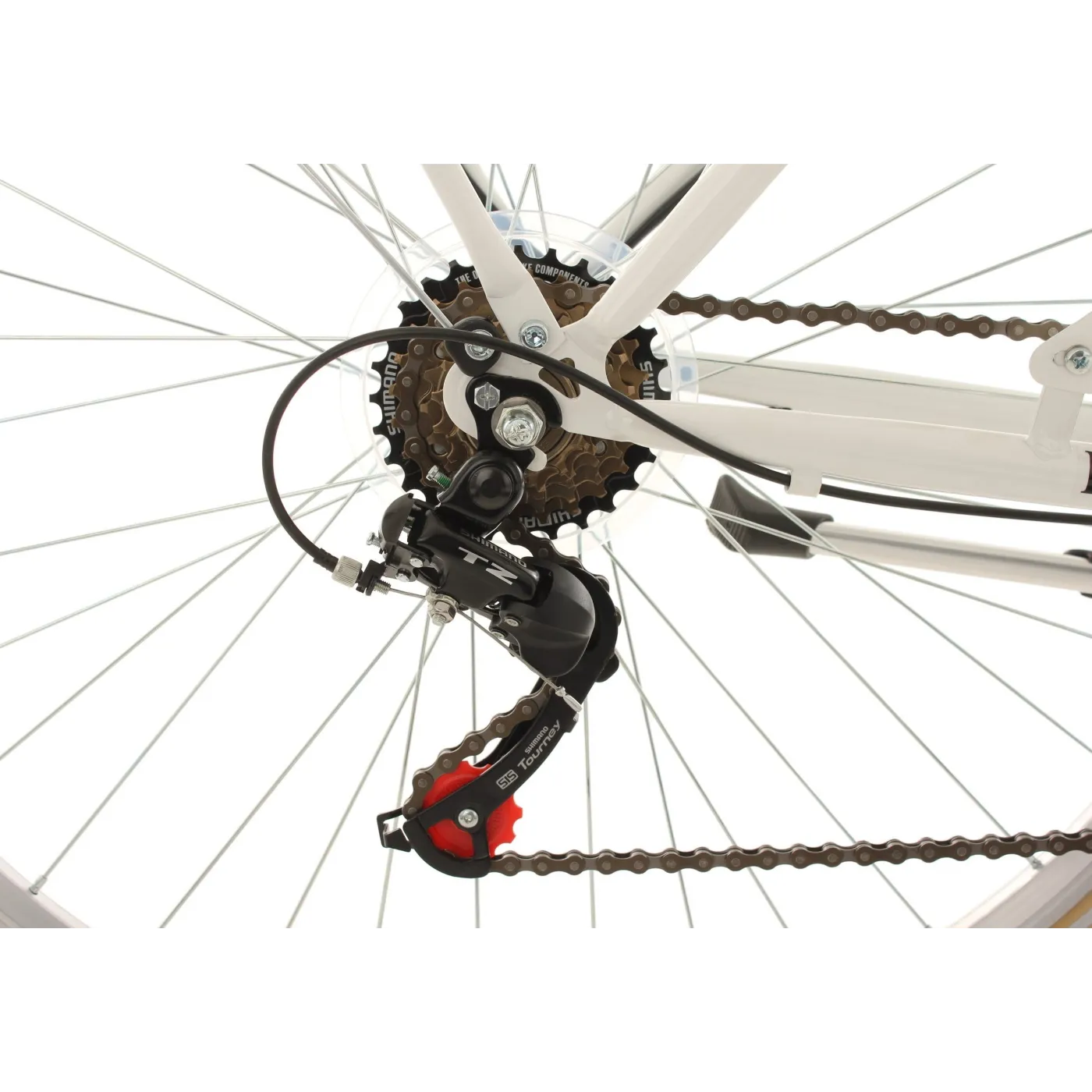 Jasne siodełko i chwyty kierownicy nadają mu elegancki wygląd i świetnie komponują się z białym kolorem ramy. Całość dopełnia przednia lampka w stylu retro, która jest nie tylko walorem estetycznym ale również przydatna podczas jazdy po zmroku. 6-biegowa przerzutka SHIMANO Tourney oferuje wygodną i płynną jazdę dostosowaną do Twoich potrzeb, natomiast biegi z łatwością zmienisz dzięki intuicyjnej manetce obrotowej RevoShift.
