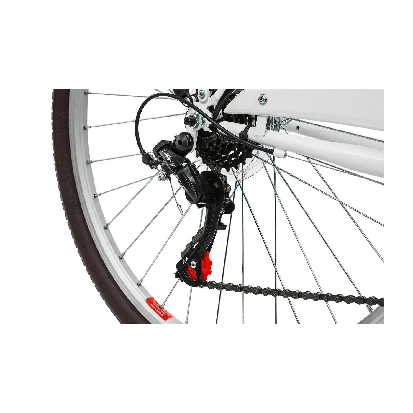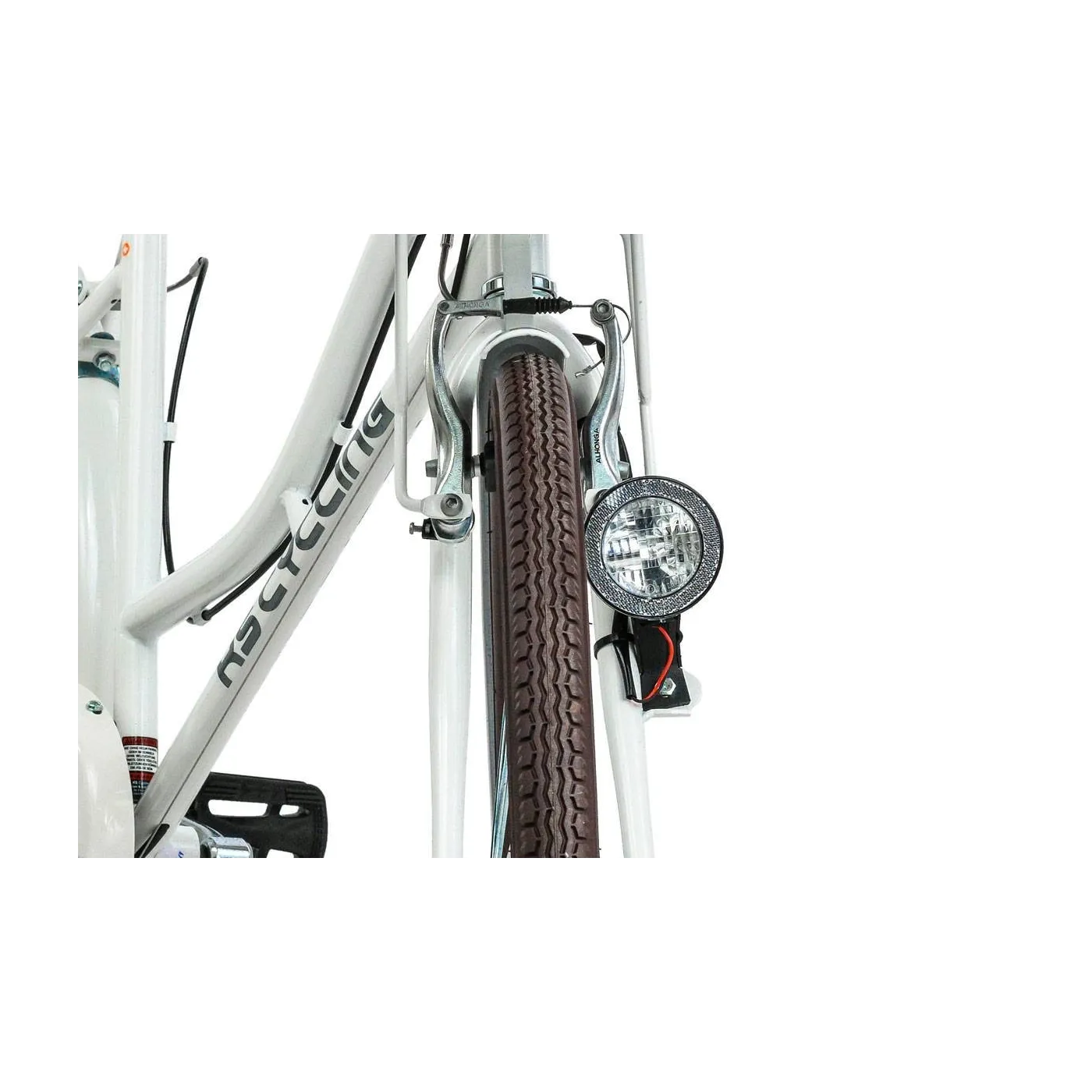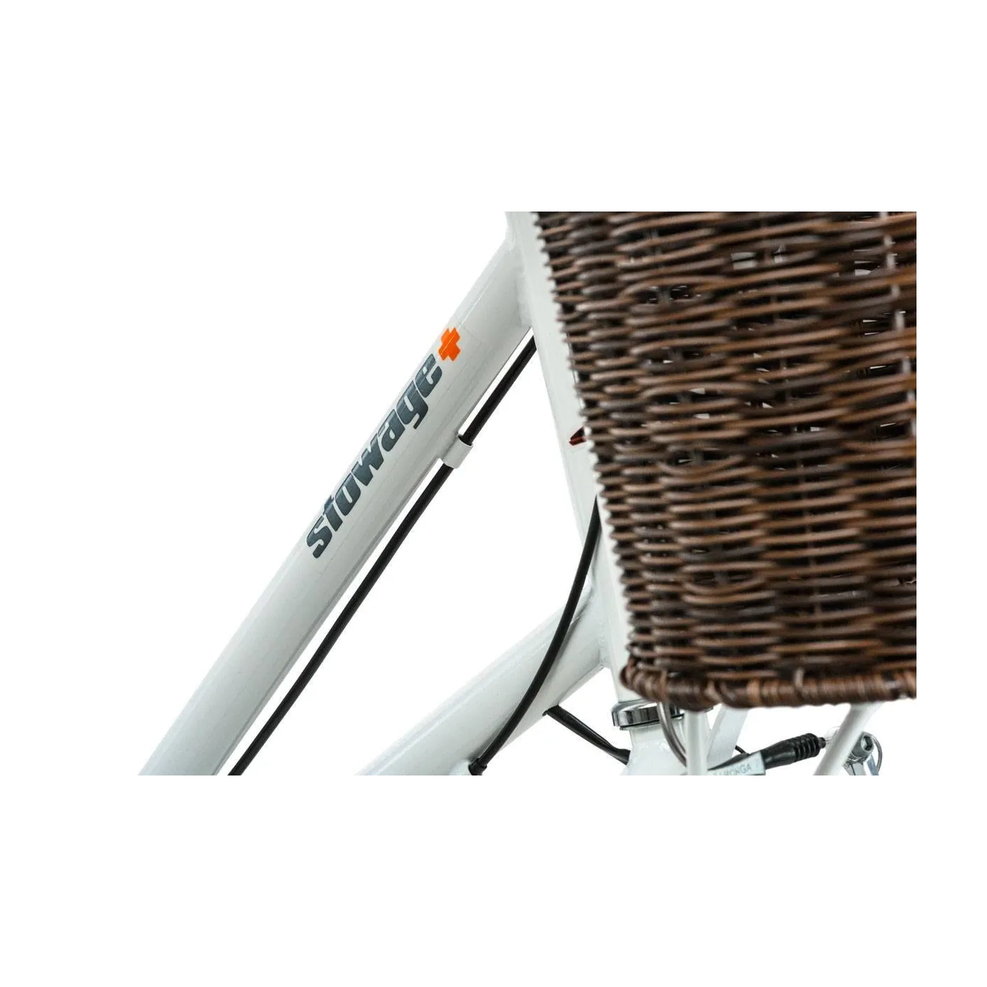 Klasyczny rower miejski w kolorze białym dla kobiet, które na co dzień funkcjonują w mieście. Stowage jest praktyczny i stylowy. Wysoka kierownica i wygodne siodełko zapewnią komfort jazdy, a szyte gripy i brązowe wykończenie dodają uroku. Rower wyposażony jest w hamulce V-brake oraz 6 biegów, dzięki którym dopasuje się do warunków miejskich. Oświetlenie zasilane przez dynamo pozwoli na podróżowanie nawet po zmroku!