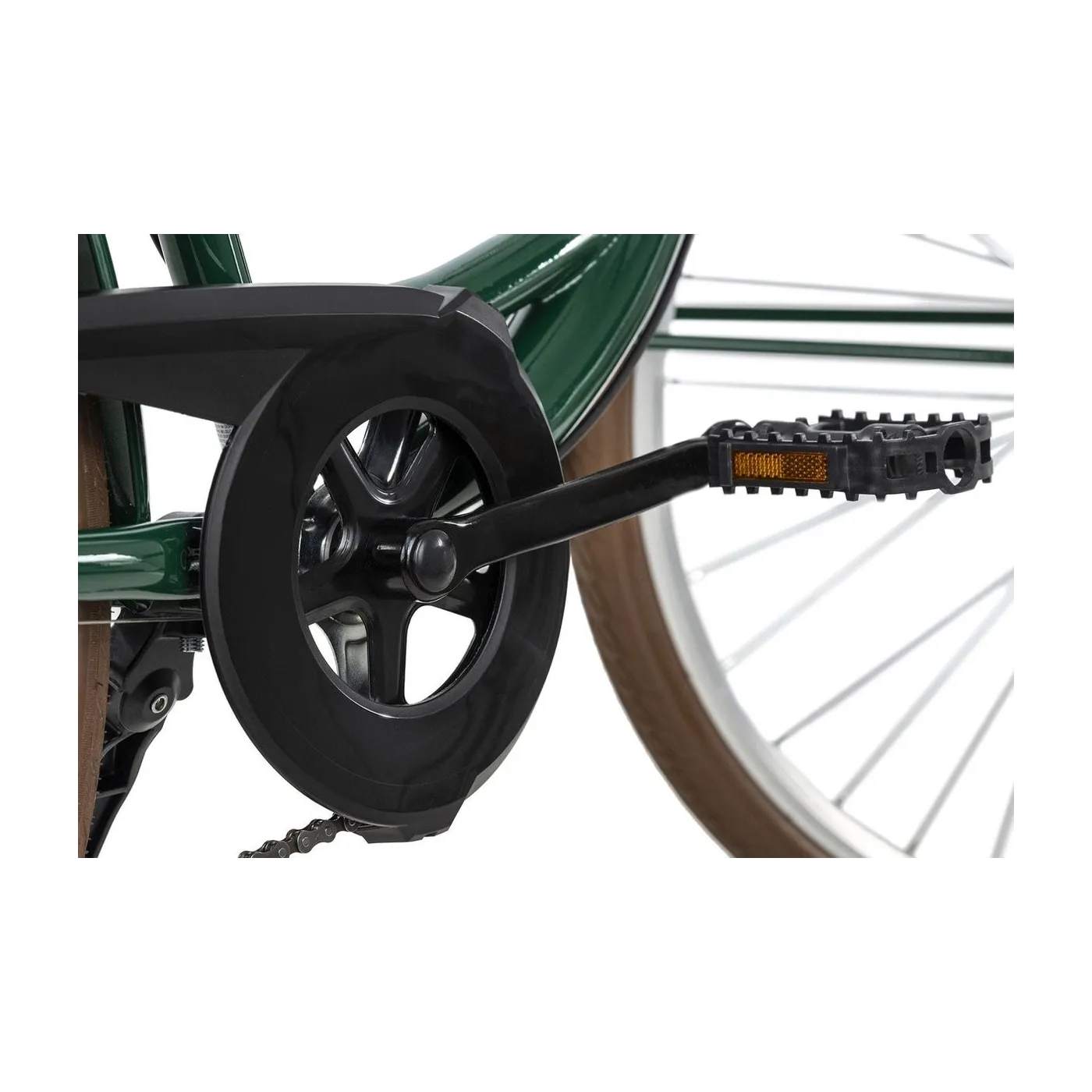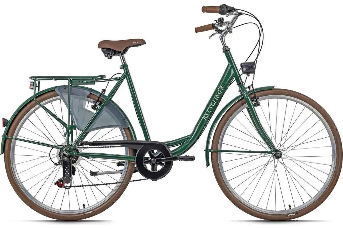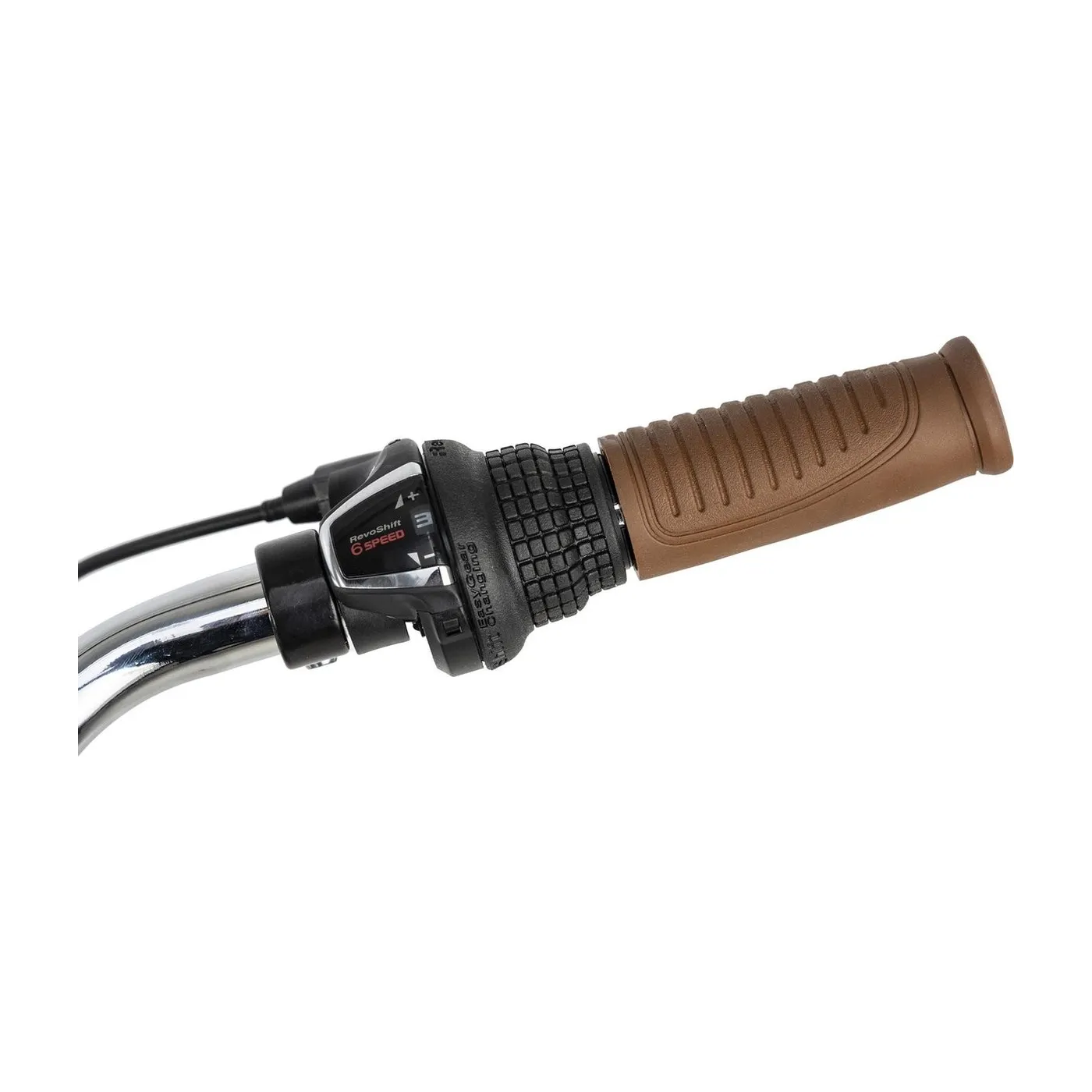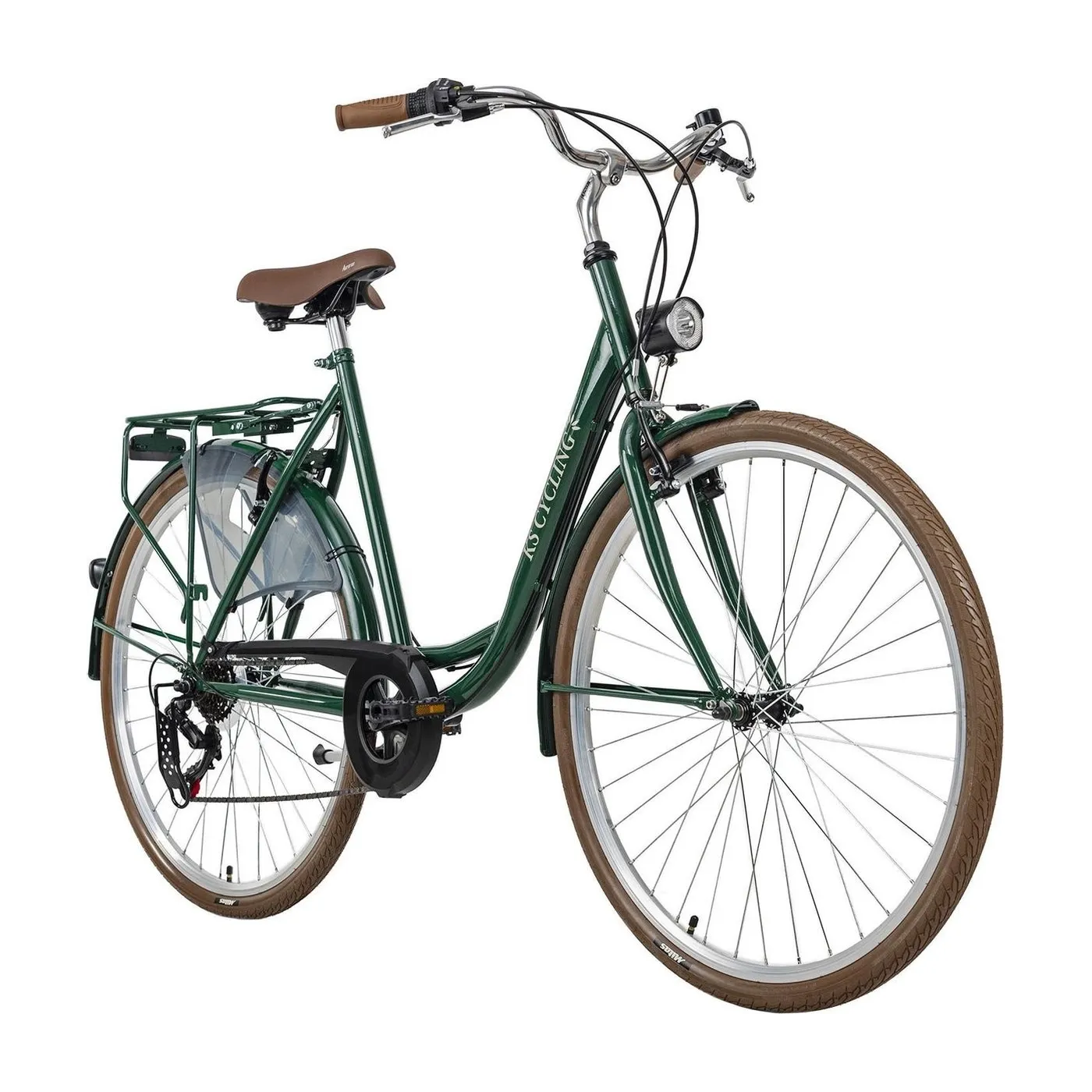 28-calowy damski rower miejski City Six to klasyczny rower do miasta. Jest skierowany do wszystkich, którzy szukają niezawodnego, nieskomplikowanego i łatwego w utrzymaniu i roweru miejskiego. Rower w wyjątkowym kolorze, brązowe opony, siodełko i chwyty kierownicy nadają mu elegancki wygląd w retro stylu.