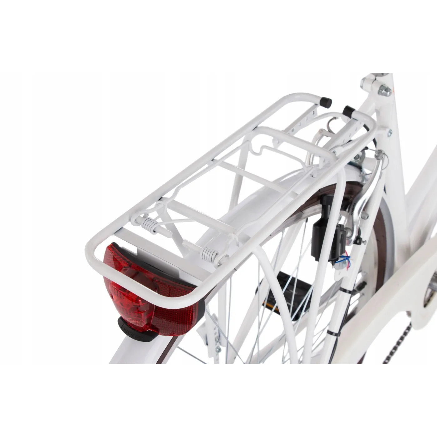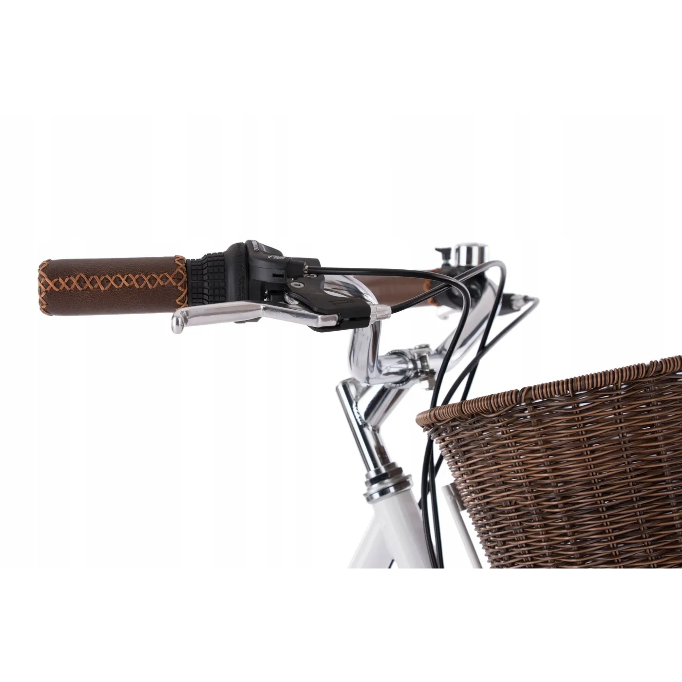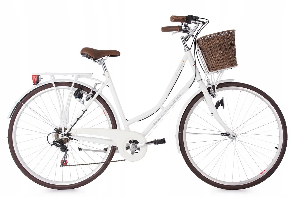 Wysoka kierownica i wygodne siodełko zapewnią komfort jazdy, a szyte gripy, koszyk i brązowe wykończenie dodają uroku. Rower wyposażony jest w hamulce v-brake oraz 6 biegów, dzięki którym dopasuje się do warunków miejskich. Oświetlenie zasilane przez dynamo pozwoli na podróżowanie nawet po zmroku!