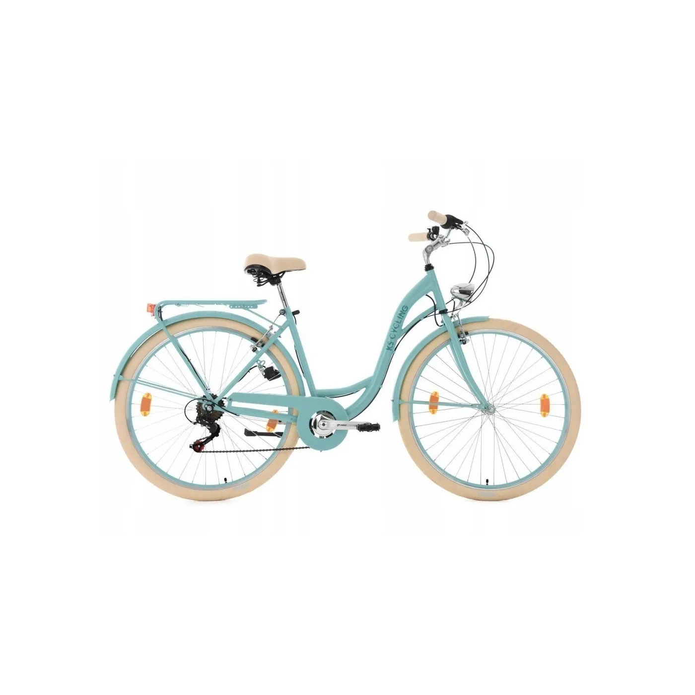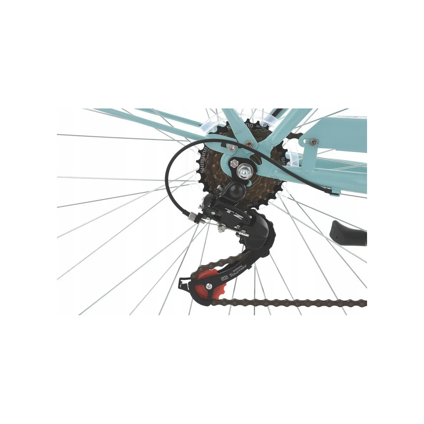 Śliczny rower miejski, w kolorze turkusowym z pewnością przyciągnie wzrok niejednej mijanej osoby. Wyposażony w "balonowe" opony ze specjalnym pneumatycznym zawieszeniem! Dzięki temu niwelowane są wstrząsy i tym samym zwiększa się komfort jazdy. Ponadto rower wyposażony jest w 6-biegową przerzutkę Shimano, oświetlenie zasilane dynamo oraz bagażnik.