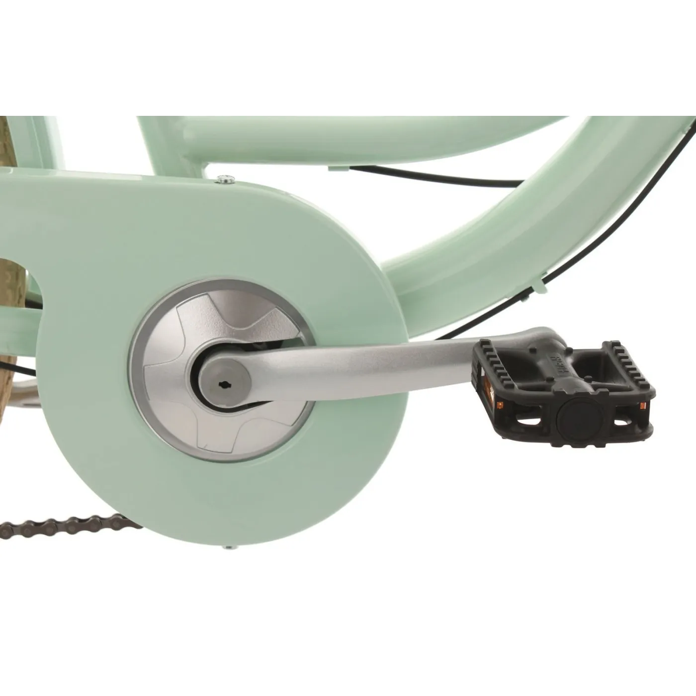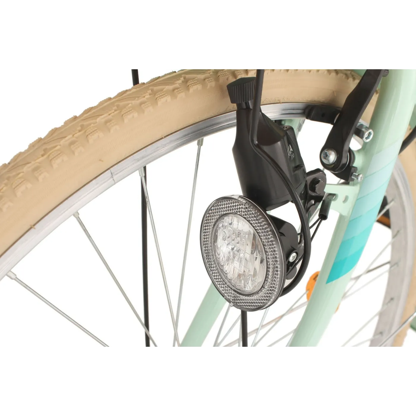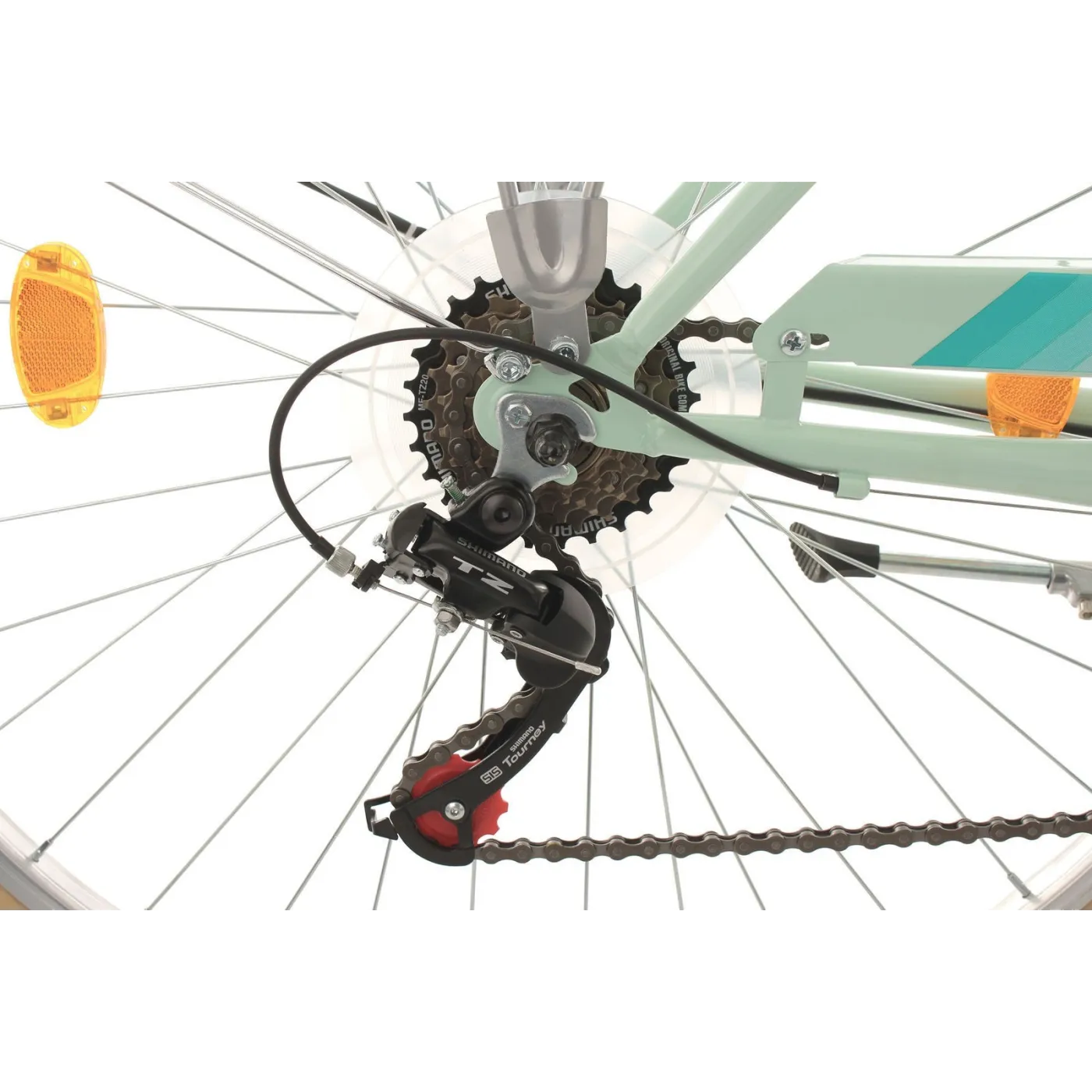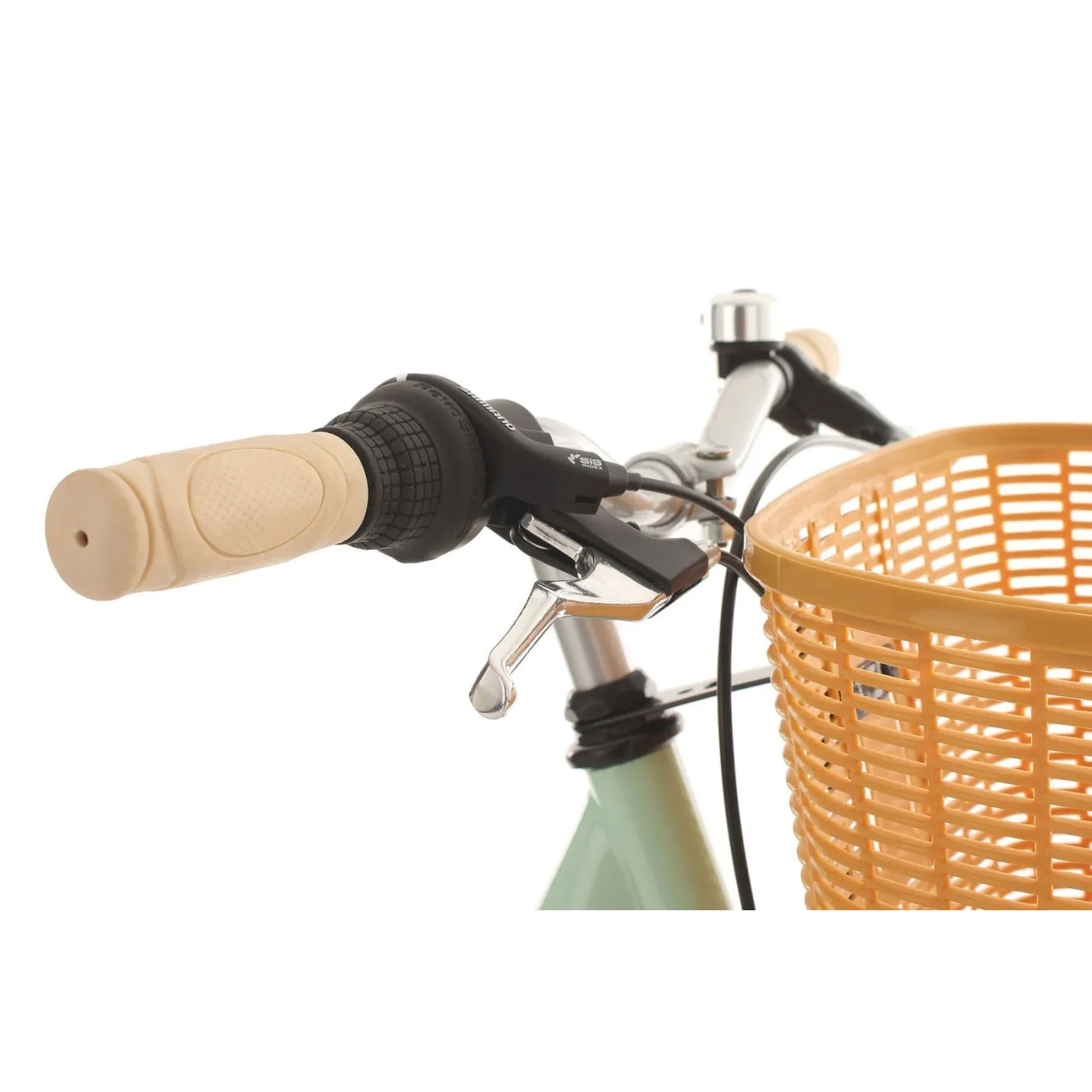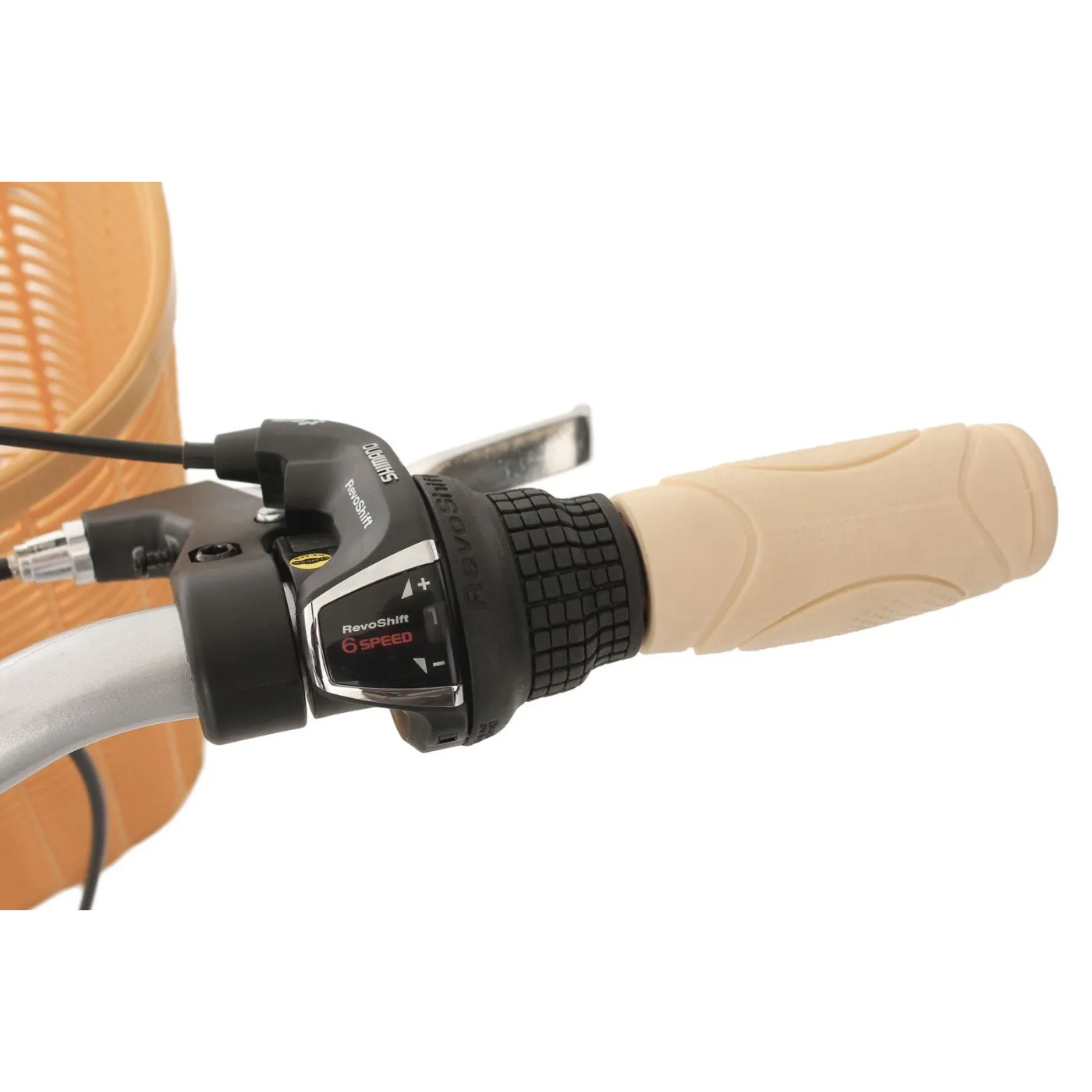 Wyjątkowa kolorystyka ramy z gustownymi jasnymi elementami przypadnie do gustu każdej kobiecie. Za zmianę biegów odpowiada niezawodna przekładnia Shimano. Ponadto w zestawie otrzymujesz spory bagażnik oraz koszyk na zakupy i najpotrzebniejsze rzeczy, a do tego błotniki, praktyczny podnóżek i oświetlenie dla większego bezpieczeństwa.