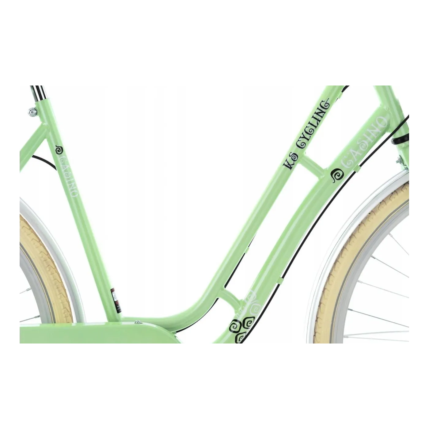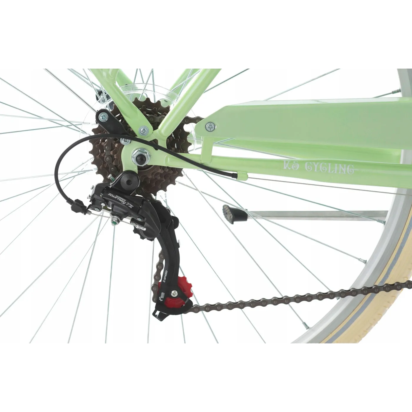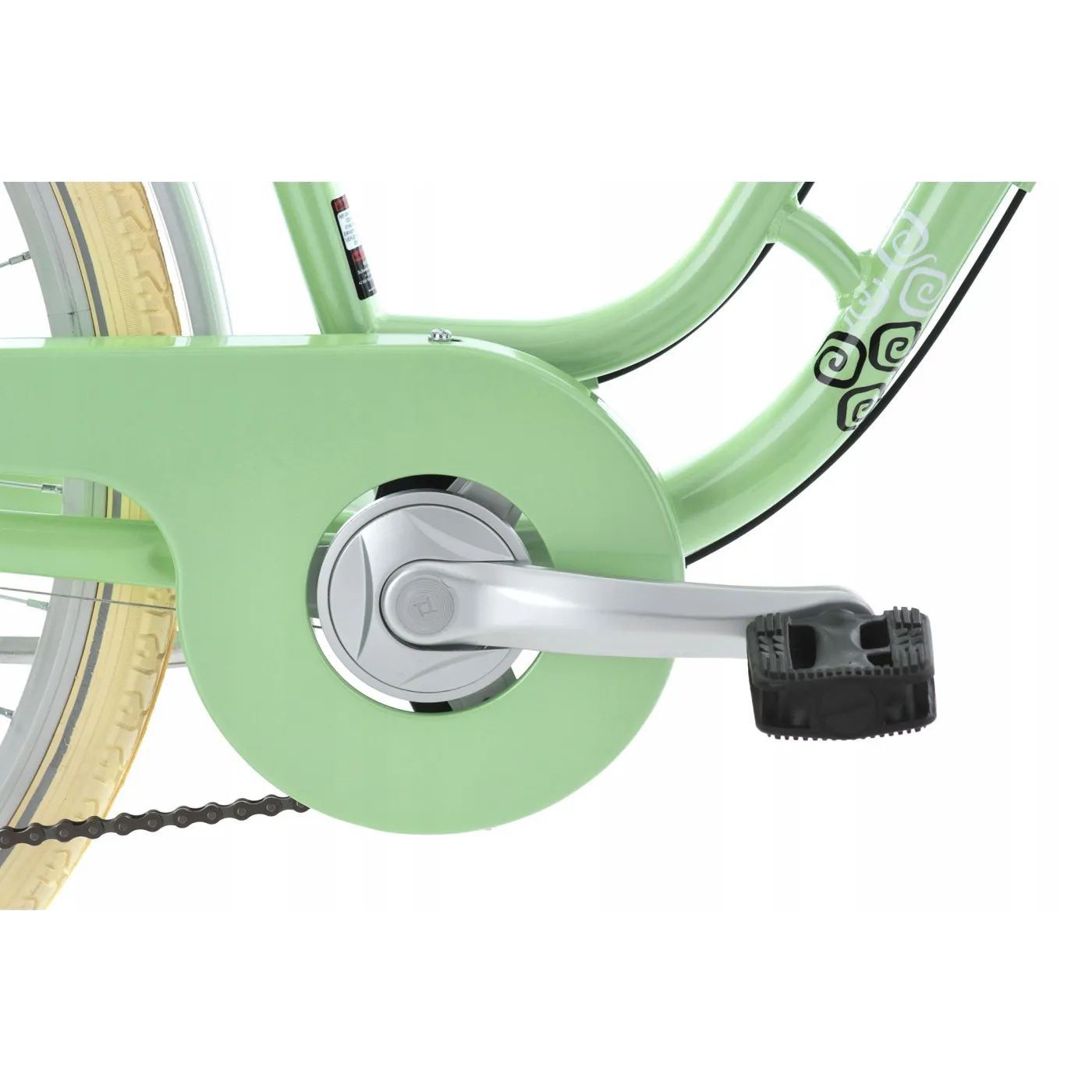 OpisKlasyczny rower miejski, w wyjątkowym zielonym kolorze sprawi, że wyróżnisz się pośród miejskiego tłumu. Wygodne siodełko, wysoka kierownica oraz duże koła zapewnią komfortową jazdę. Rower posiada hamulce V-brake oraz 6 biegów, dzięki czemu dostosuje się do każdych warunków. Ledowe światła zasilane przez dynamo pozwolą na bezpieczną jazdę nawet po zmroku.