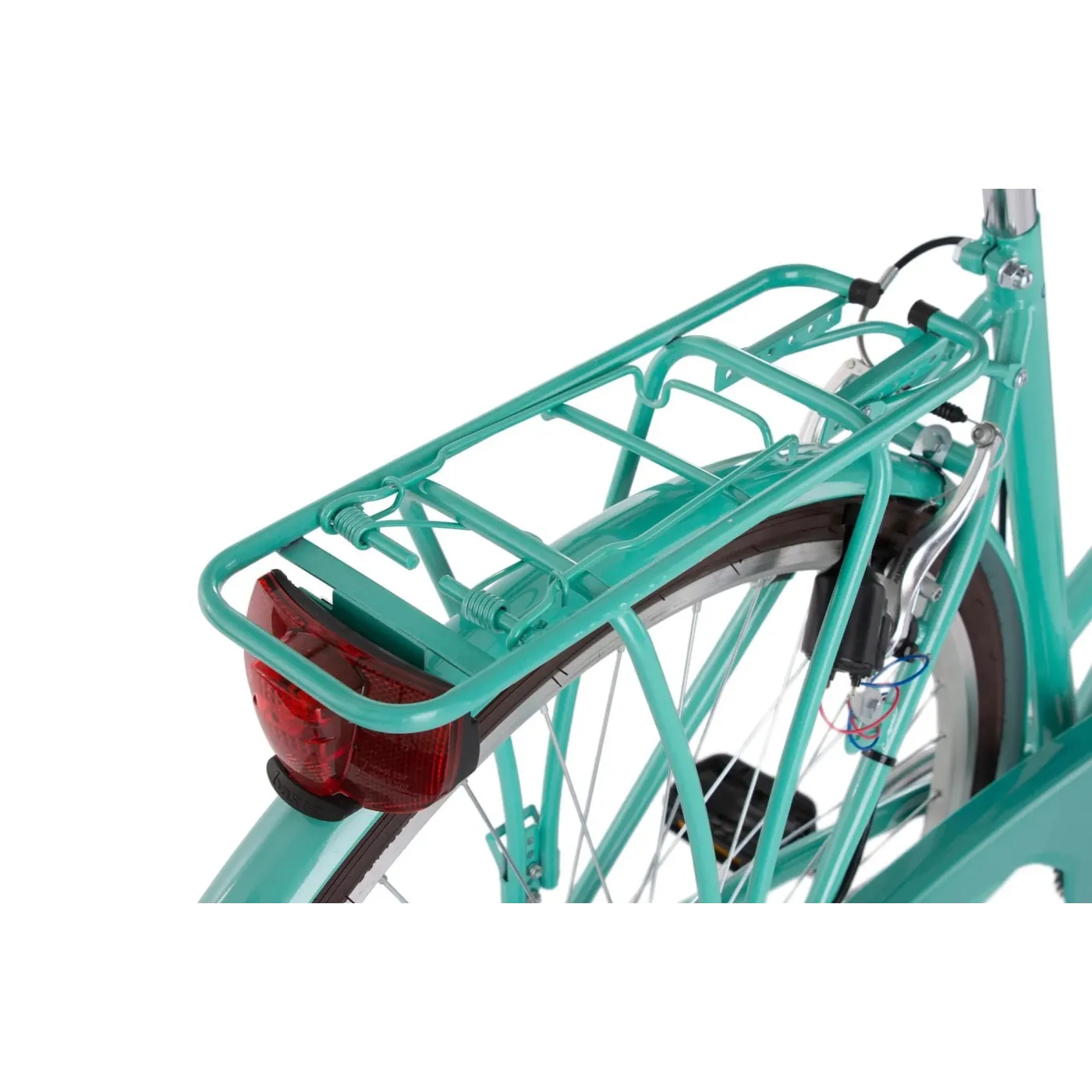 Jego świeży, wyjątkowy miętowy kolor dodaje mu niepowtarzalnego uroku, zaś odpowiednio wyprofilowana kierownica zapewnia wysoki komfort jazdy. Rower wyposażony został w bagażnik, koszyk, nóżkę oraz reflektory zasilane dynamo, czyli we wszystko, co jest potrzebne do odbywania zarówno dłuższych, jak i krótszych wycieczek.