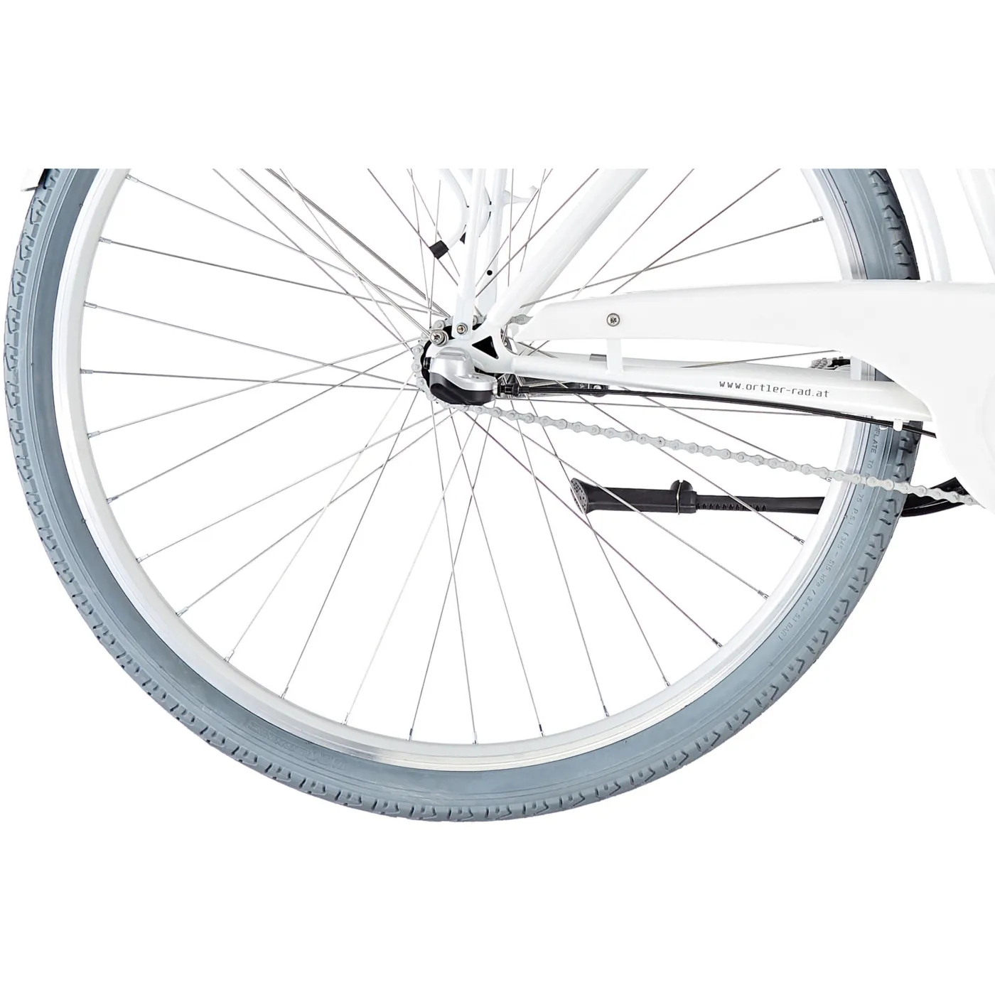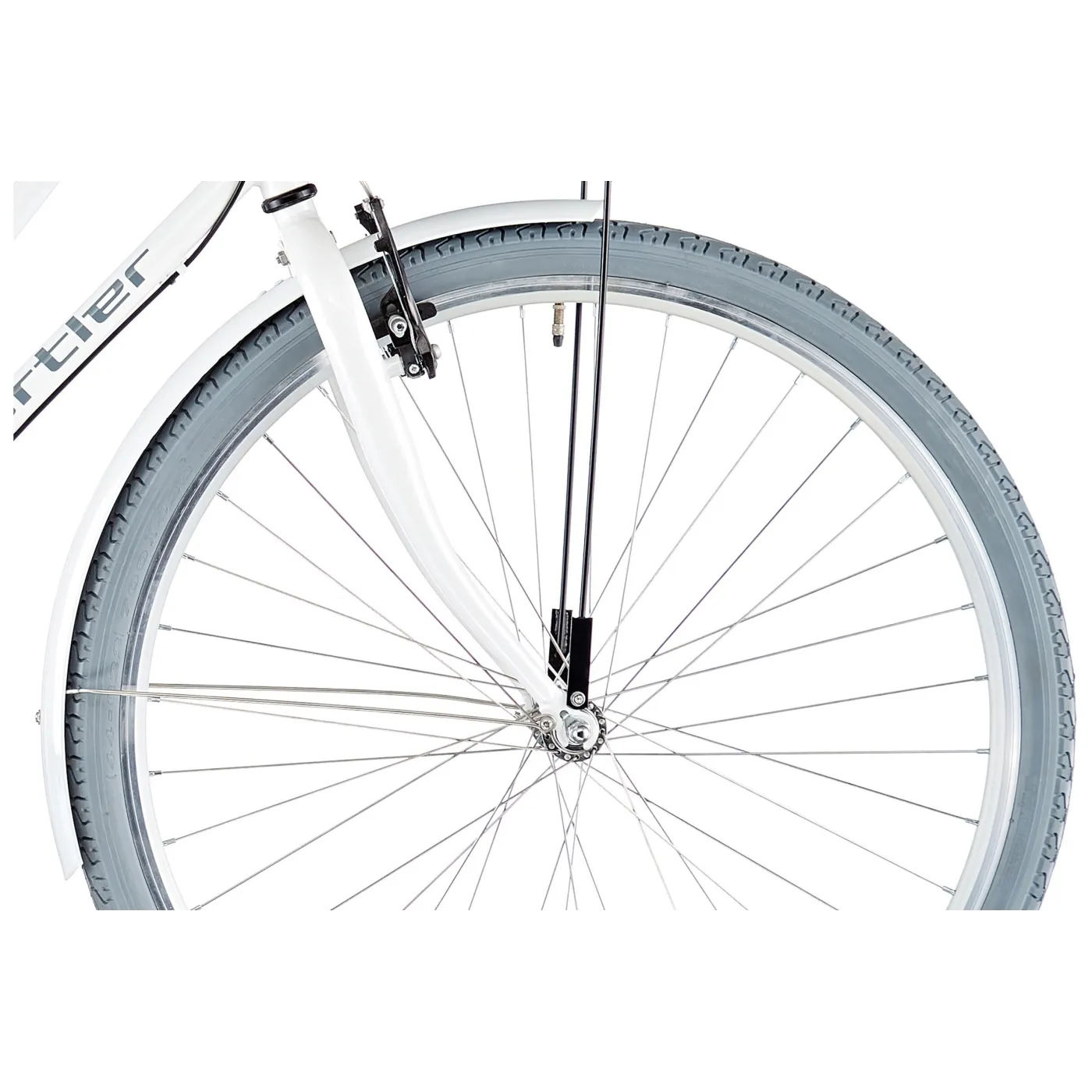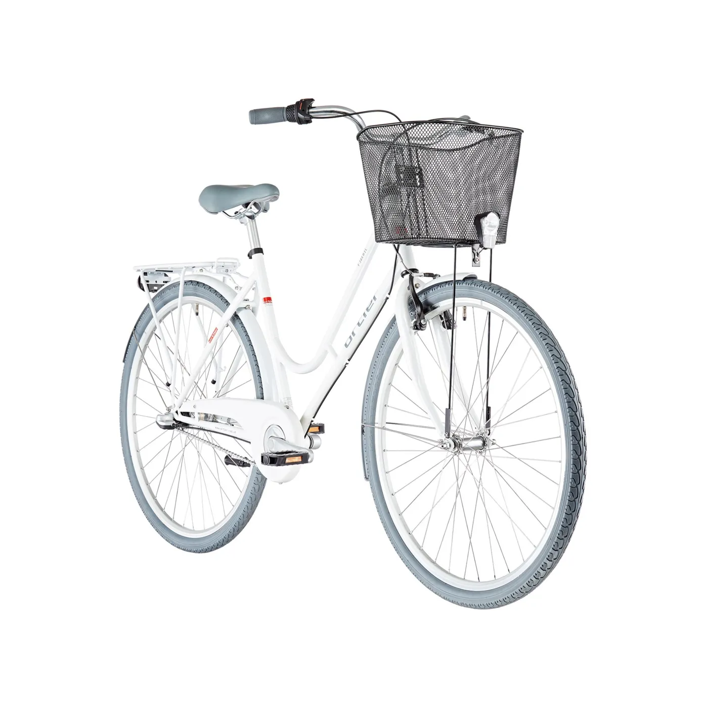 Biały i stylowy rower miejski z 3-biegową przerzutką w piaście to niezawodny towarzysz codziennych przejażdżek. Nisko opuszczona, zaokrąglona stalowa rama zapewnia komfort i elegancki wygląd całości. Idealnym wykończeniem estetycznej formy są dopasowane błotniki, osłona łańcucha oraz równie przydatny bagażnik. Komfortową pozycję zapewnia wygodne, szerokie siodełko oraz szeroka, miejska kierownica oraz profil roweru. Dodatkowymi atutami dopełniającymi całości jest kosz na zakupy oraz oświetlenie przydatne podczas jazdy po zmroku.