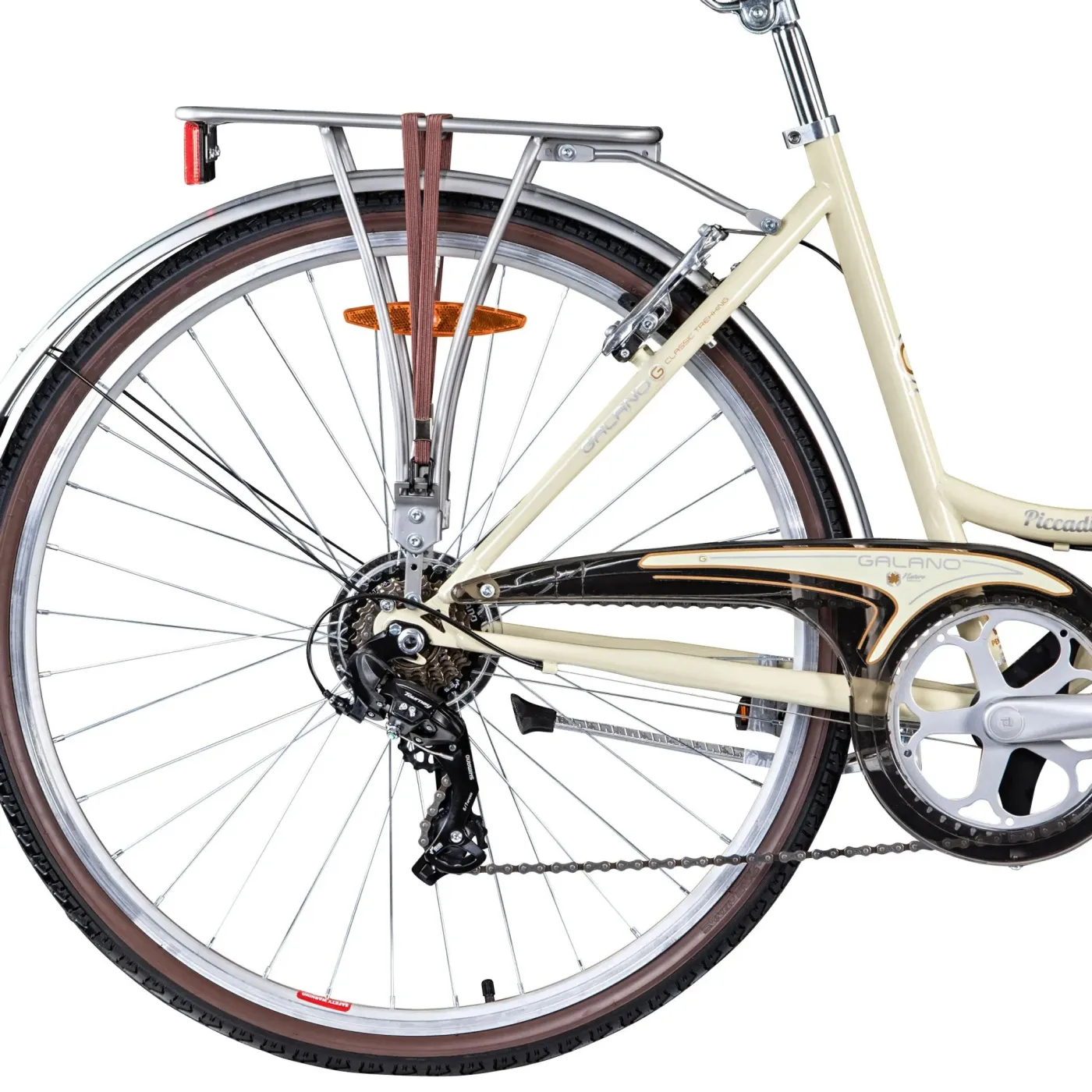 Opracowany jako rower na co dzień i do miasta, Piccadilly z przednim koszem i bagażnikiem z elastycznymi paskami zapewnia wystarczająco dużo miejsca na bagaż i zakupy. Dzięki nisko położonemu środkowi ciężkości stalowa rama sprawia, że z łatwością utrzymasz równowagę roweru, nawet przy większym obciążeniu. Niskie wejście ułatwia wsiadanie i wysiadanie. Kierownica, która jest odchylona do tyłu, automatycznie ustawia cię w wyprostowanej pozycji siedzącej, co jest przyjazne dla pleców i stawów. Jednocześnie masz również dobry przegląd ruchu drogowego.