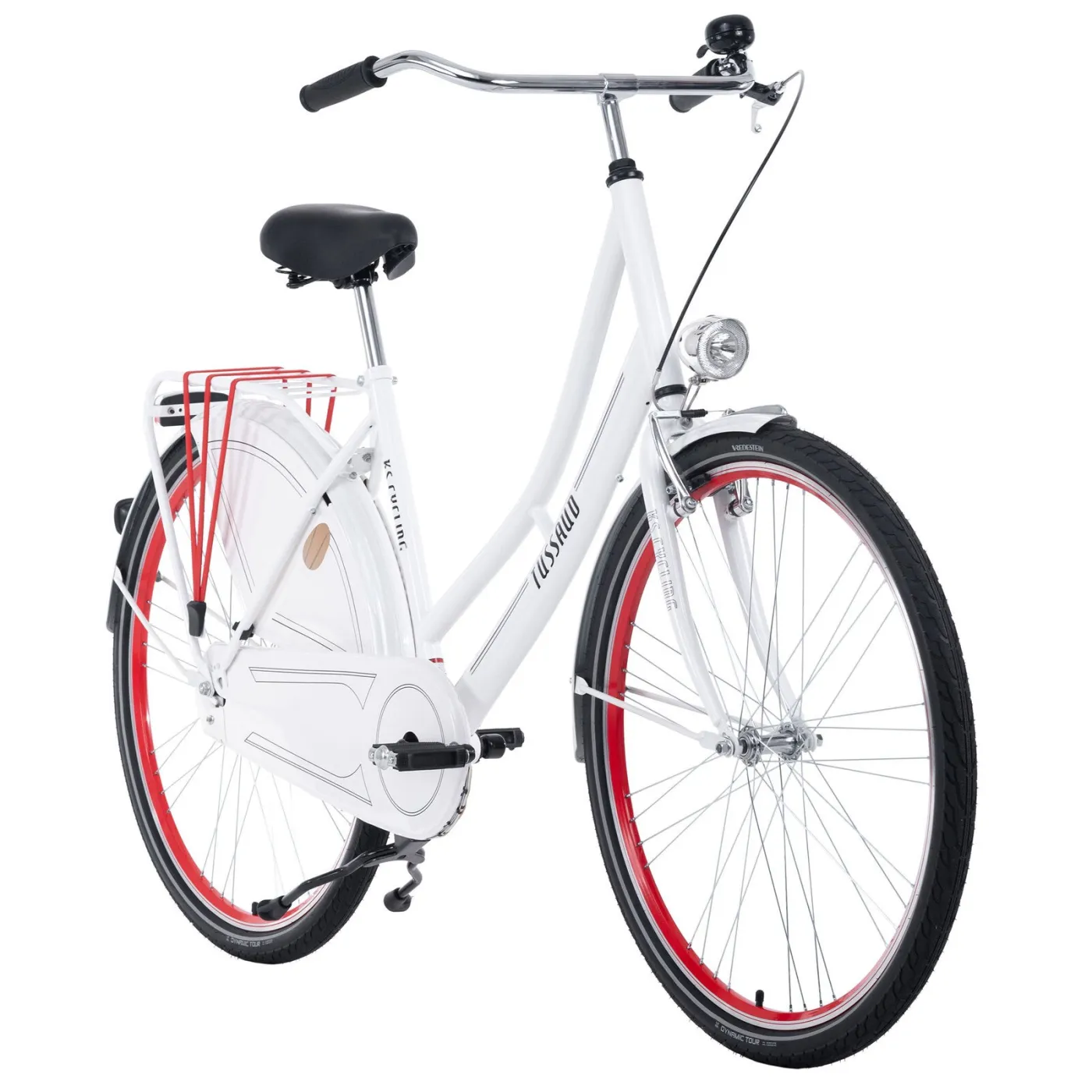 Rower wyposażony jest w niezbędne akcesoria, takie jak bagażnik, błotniki, osłonę łańcucha oraz oświetlenie, które pozwolą na bezpieczną jazdę nawet po zmroku. Pełny pakiet akcesoriów sprawia, że jest to idealny partner na codzienne wycieczki.