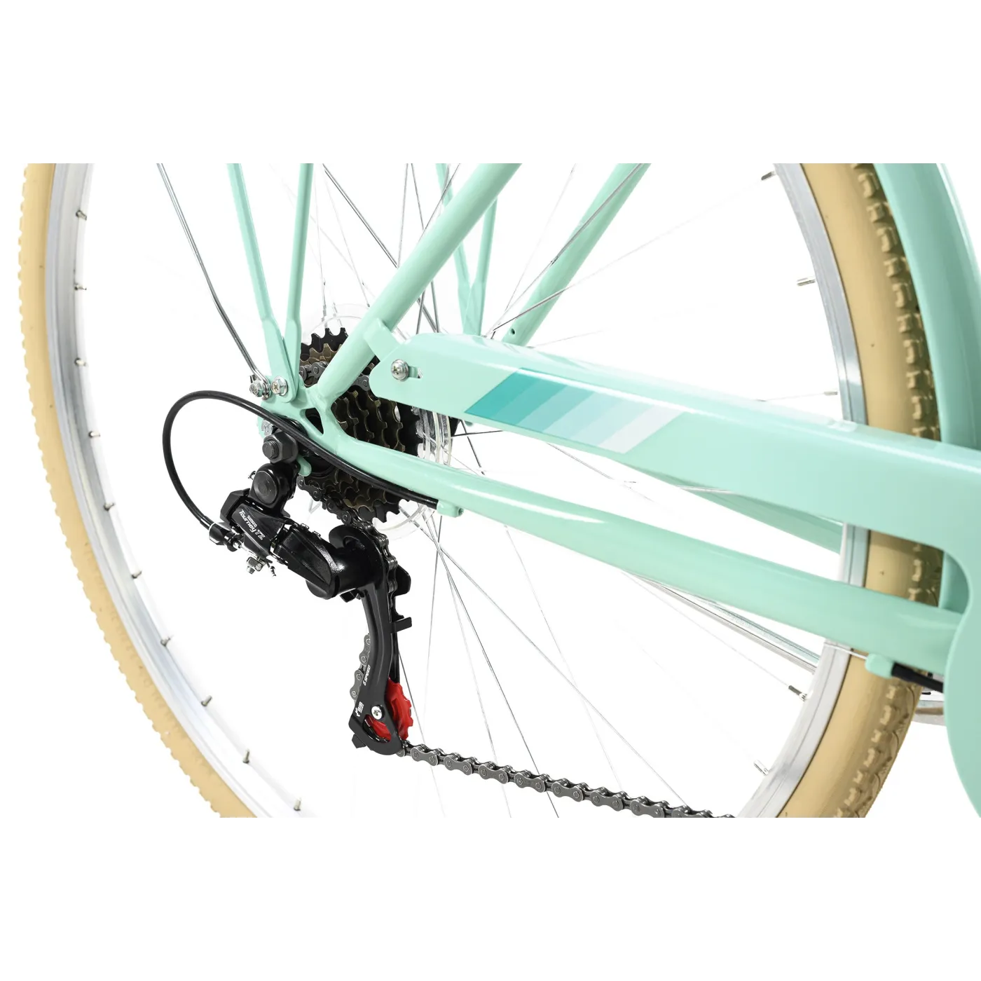 Rama w modnych kolorach i jasne dodatki sprawiają, że rower przyciąga wzrok. Dzięki 6-biegowej przerzutce możesz spokojnie jeździć po mieście - osprzęt marki Shimano to niezawodność i płynność jazdy.