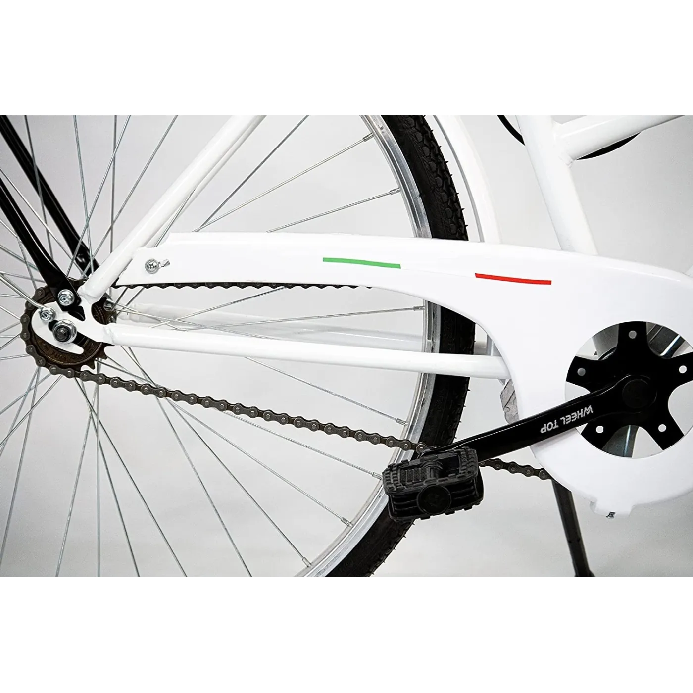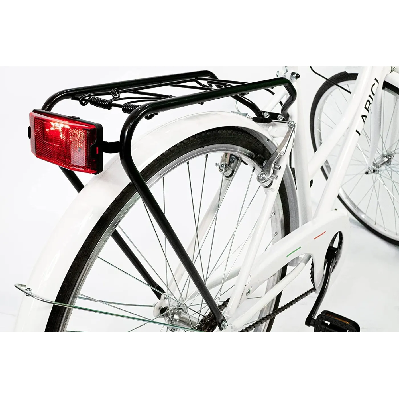 Idealnie dopracowane detale, sprawiają, że Labici zauroczy wszystkich. Rower posiada dwa hamulce V-brake, profilowaną kierownicę w stylu retro, szerokie, wygodne siodełko oraz dwa bagażniki. Wyposażony w światła zasilane bateryjnie zapewnia bezpieczeństwo podróży nawet po zmroku. Całość utrzymana jest w klasycznym, białym kolorze z czarnymi akcentami.