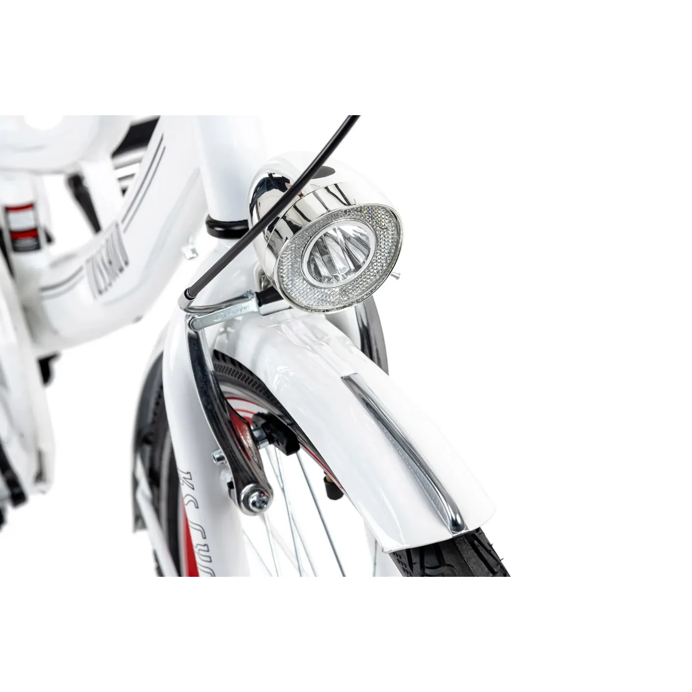 Rower wyposażony jest w niezbędne akcesoria, takie jak bagażnik, błotniki, osłonę łańcucha oraz oświetlenie, które pozwolą na bezpieczną jazdę nawet po zmroku. Pełny pakiet akcesoriów sprawia, że jest to idealny partner na codzienne wycieczki.