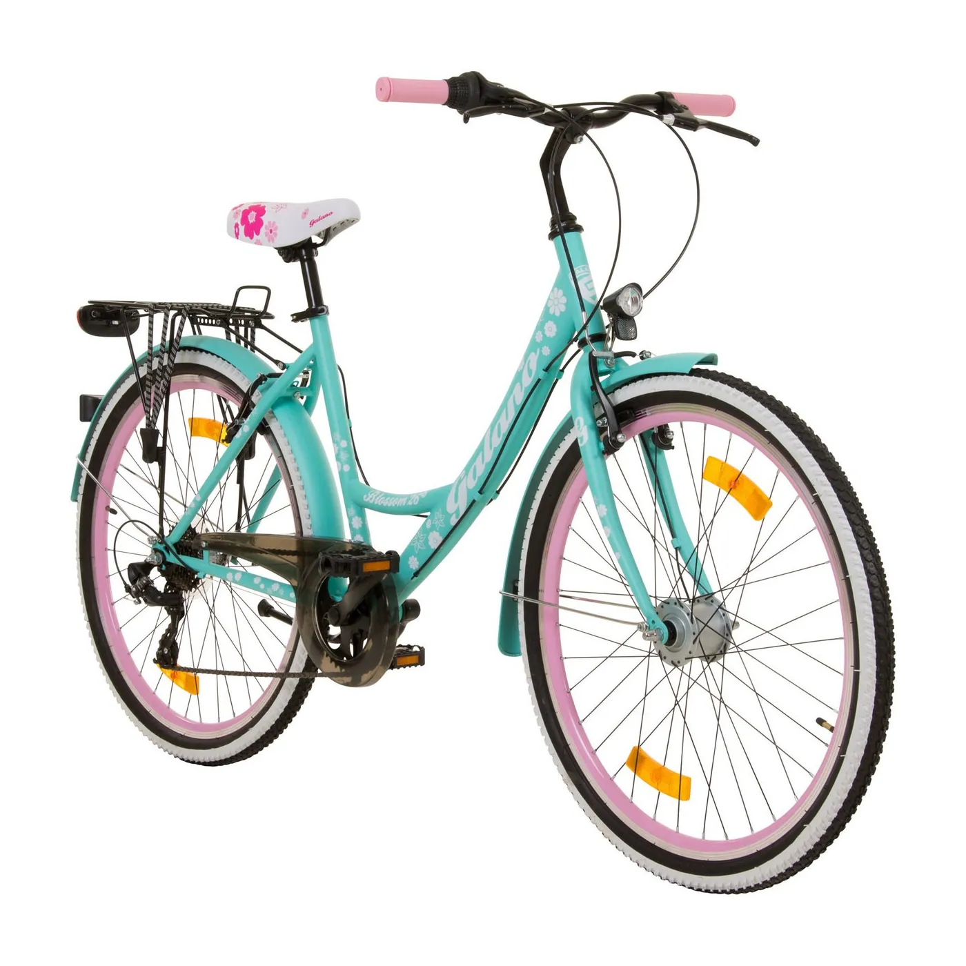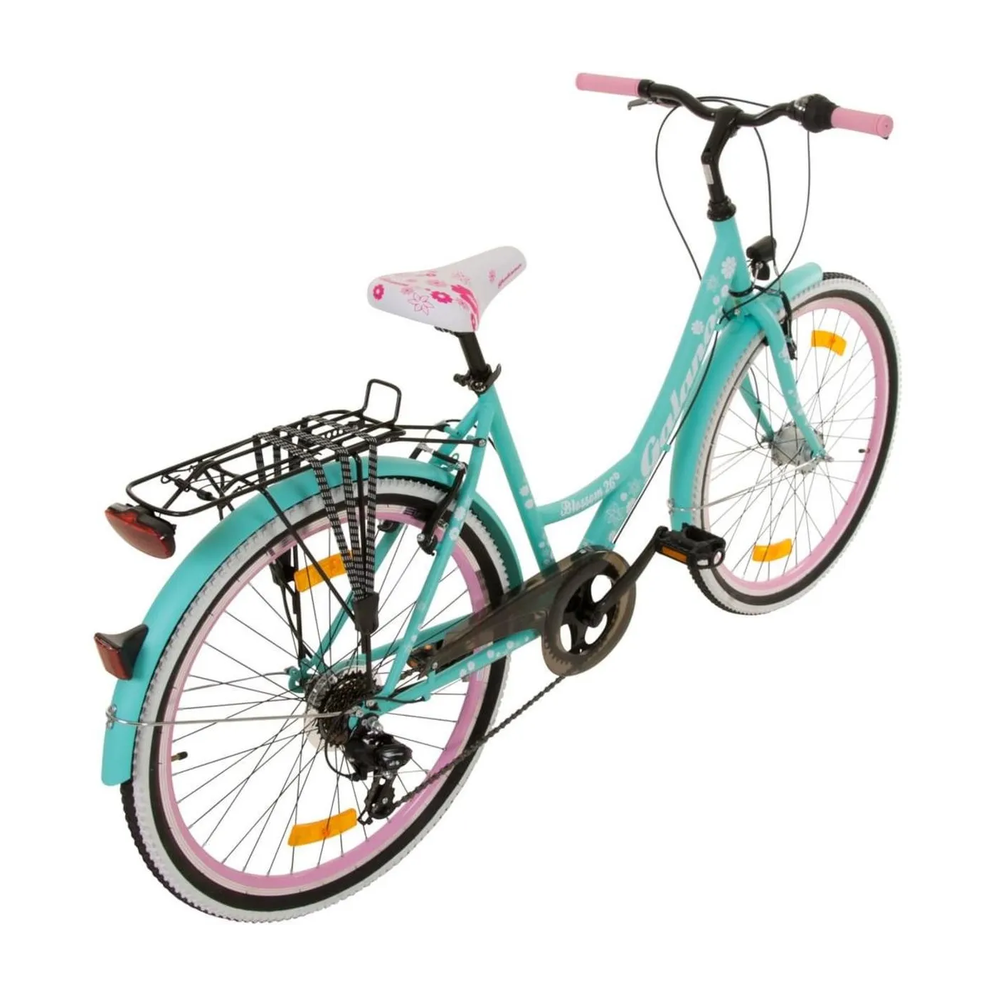 Galano Blossom o kołach 26" ma piękny kwiatowy wzór w pastelowych kolorach. Siedmiobiegowy system przełożeń składa się z wytrzymałych, łatwych w utrzymaniu komponentów, które zapewniają płynną zmianę biegów. Dzięki temu rower nadaje się na każdą codzienną jazdę. Koła są hamowane precyzyjnie hamulcami V-brake. Zakupy lub inny bagaż można przewozić na półce bagażowej, a ponadto posiada również błotniki, osłonę łańcucha i stopkę boczną.