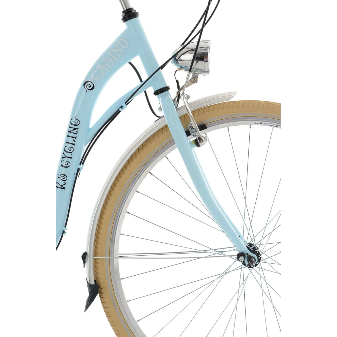 To piękny rower miejski z dużymi 28-calowymi kołami oraz ze świetnym wyposażeniem. Kobieca kolorystyka ramy, kremowy kolor opon, poręczny bagażnik - to tylko niektóre zalety modelu Casino. Dodatkowo model ten zapewnia wyjątkowo komfortową pozycję podczas jazdy, stopkę, szerokie siodełko i niezawodne przerzutki Shimano uzupełniają świetną specyfikację tego roweru miejskiego.