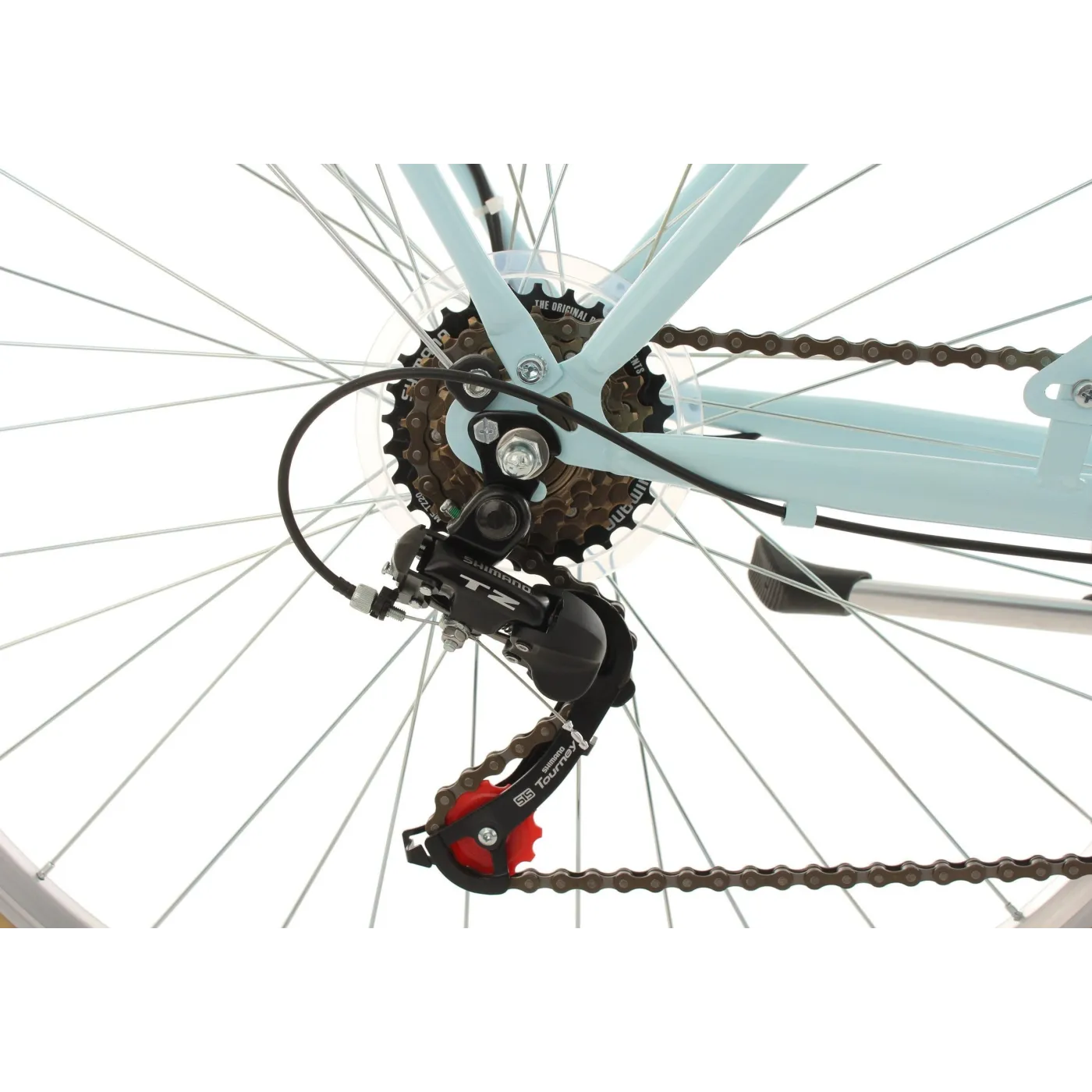 Jasne akcenty kolorystyczne w postaci opon, siodełka i chwytów kierownicy nadają mu elegancki wygląd i świetnie komponują się z błękitną ramą. Dopełnieniem całości jest stylowa i praktyczna przednia lampka w stylu retro. 6-biegowa przerzutka SHIMANO Tourney oferuje wygodną i płynną jazdę dostosowaną do Twoich potrzeb, a biegi możesz łatwo zmieniać dzięki intuicyjnej manetce obrotowej.