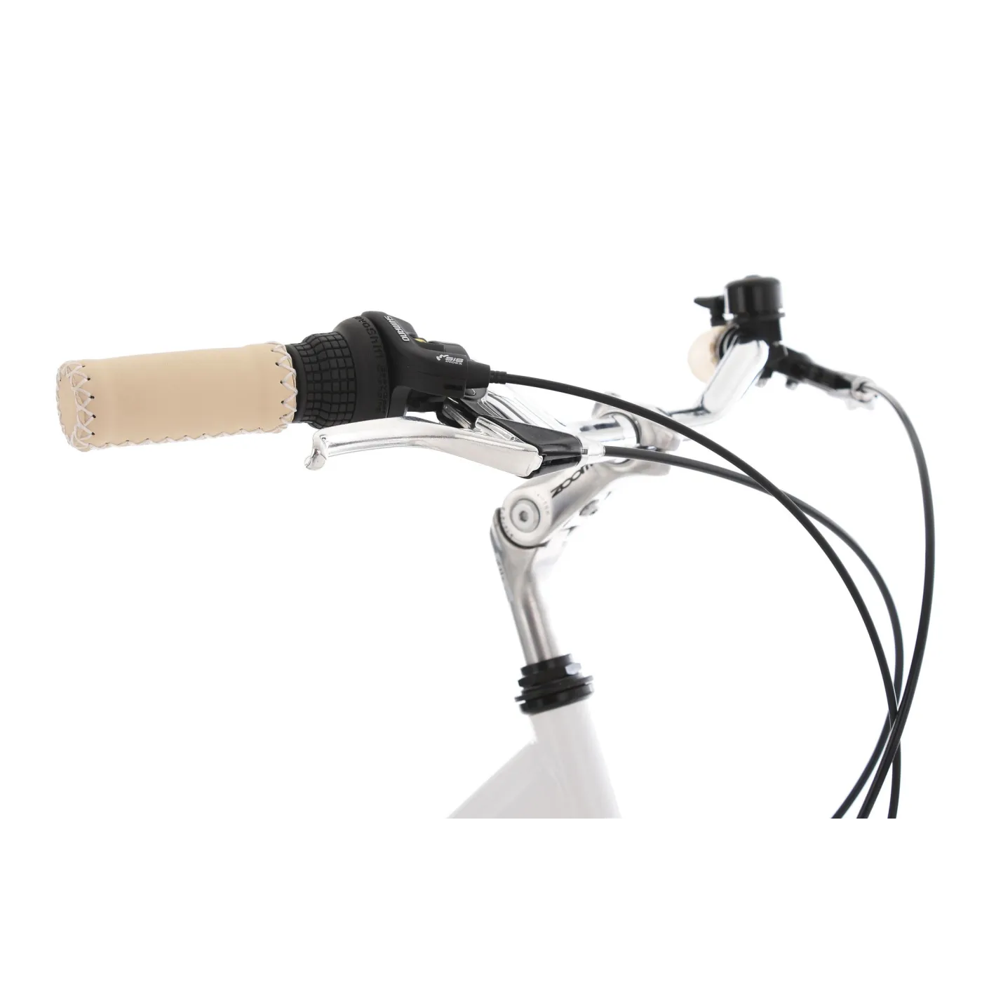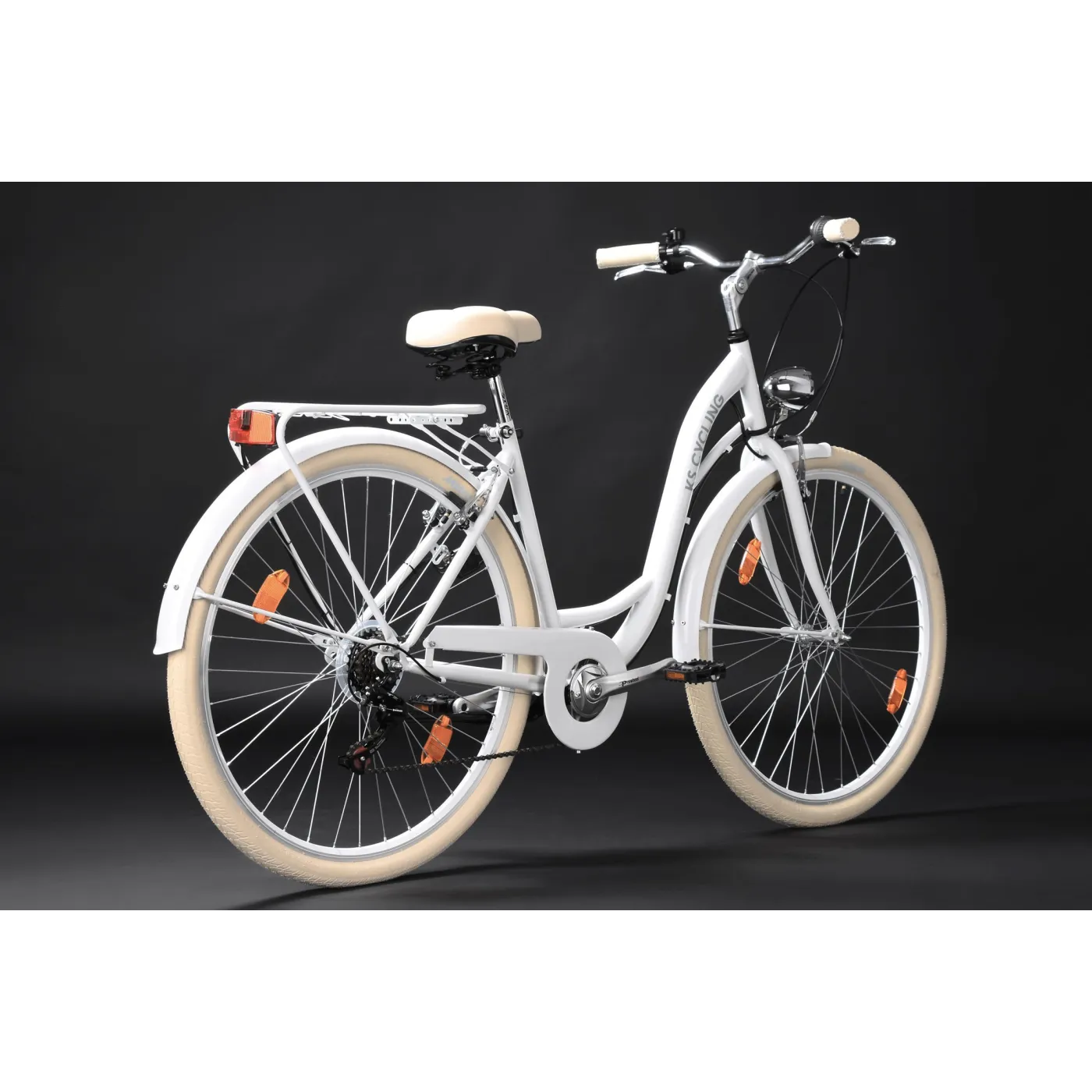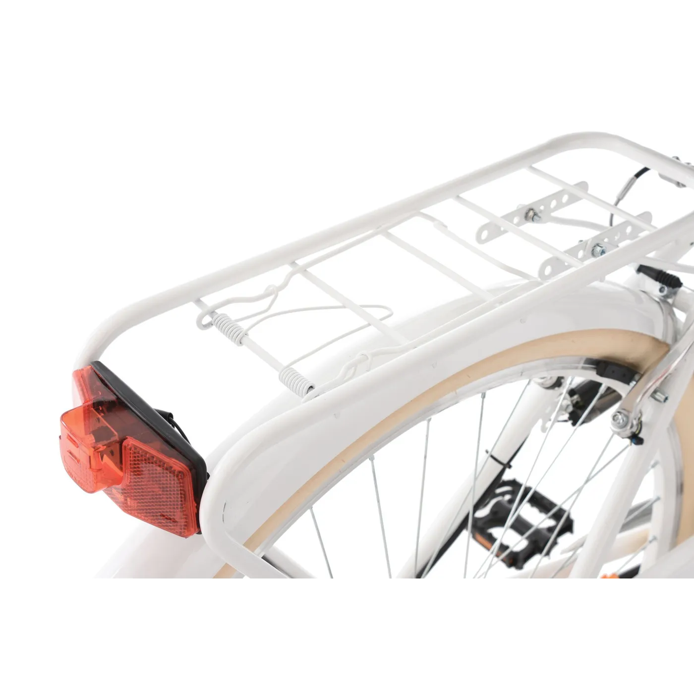 Elegancki, biały kolor nadaje mu kobiecego charakteru, a jasne opony, siodełko i chwyty kierownicy dopełniają całość. Na sporym bagażniku bez problemu przewieziesz swoje torbę lub zakupy. Dla Twojej wygody rower jest wyposażony w grube “balonowe” opony, które świetnie amortyzują wszelkie wstrząsy, co zwiększa komfort jazdy. 6-biegowa przerzutka SHIMANO Tourney oferuje wygodną i płynną jazdę dostosowaną do Twoich potrzeb. Dzięki oświetleniu napędzanemu za pomocą dynamo możesz bezpiecznie jeździć również po zmroku.