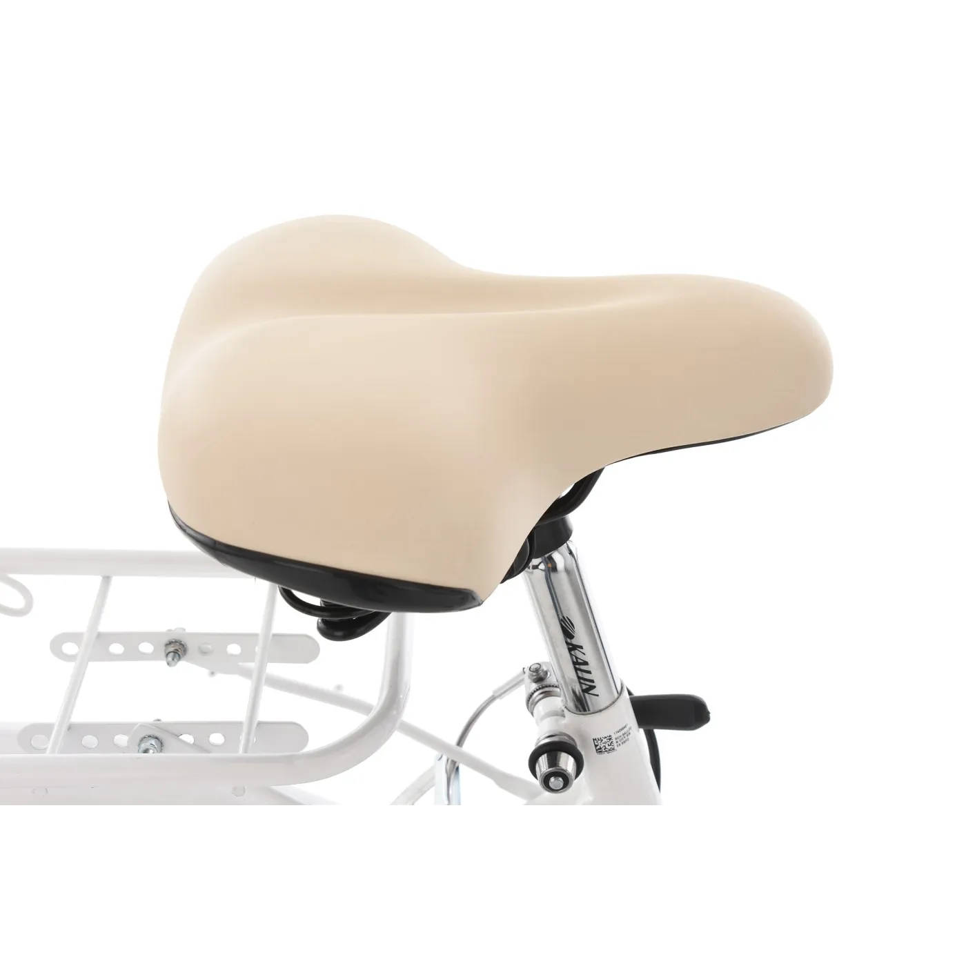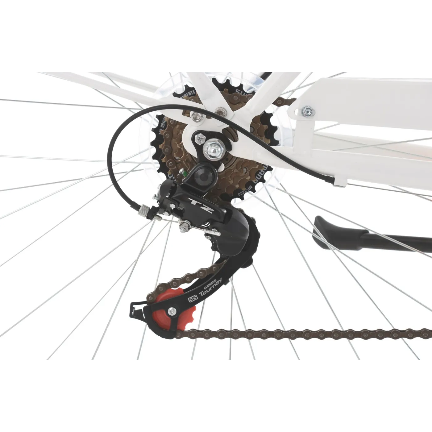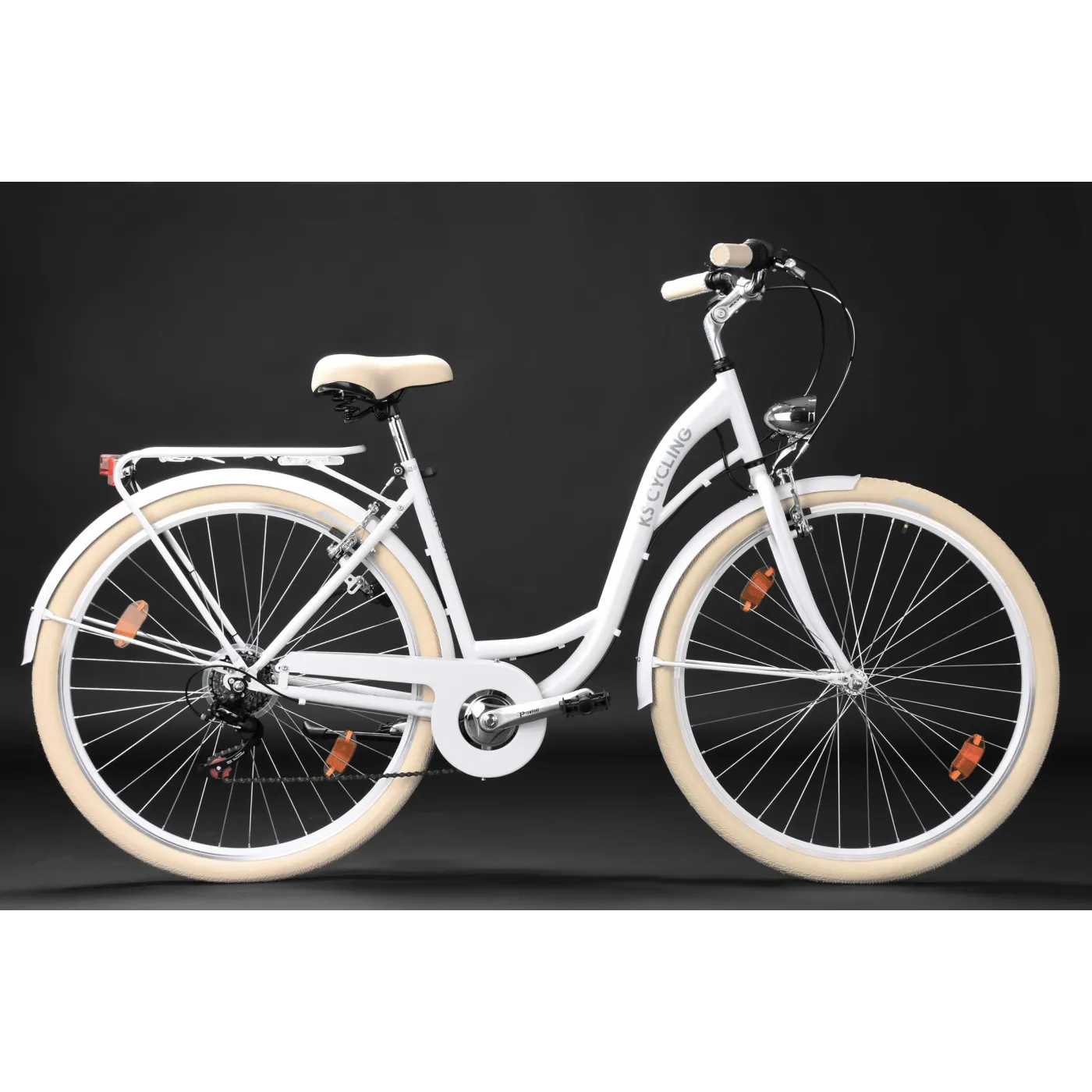 Elegancki, biały kolor nadaje mu kobiecego charakteru, a jasne opony, siodełko i chwyty kierownicy dopełniają całość. Na sporym bagażniku bez problemu przewieziesz swoje torbę lub zakupy. Dla Twojej wygody rower jest wyposażony w grube “balonowe” opony, które świetnie amortyzują wszelkie wstrząsy, co zwiększa komfort jazdy. 6-biegowa przerzutka SHIMANO Tourney oferuje wygodną i płynną jazdę dostosowaną do Twoich potrzeb. Dzięki oświetleniu napędzanemu za pomocą dynamo możesz bezpiecznie jeździć również po zmroku.