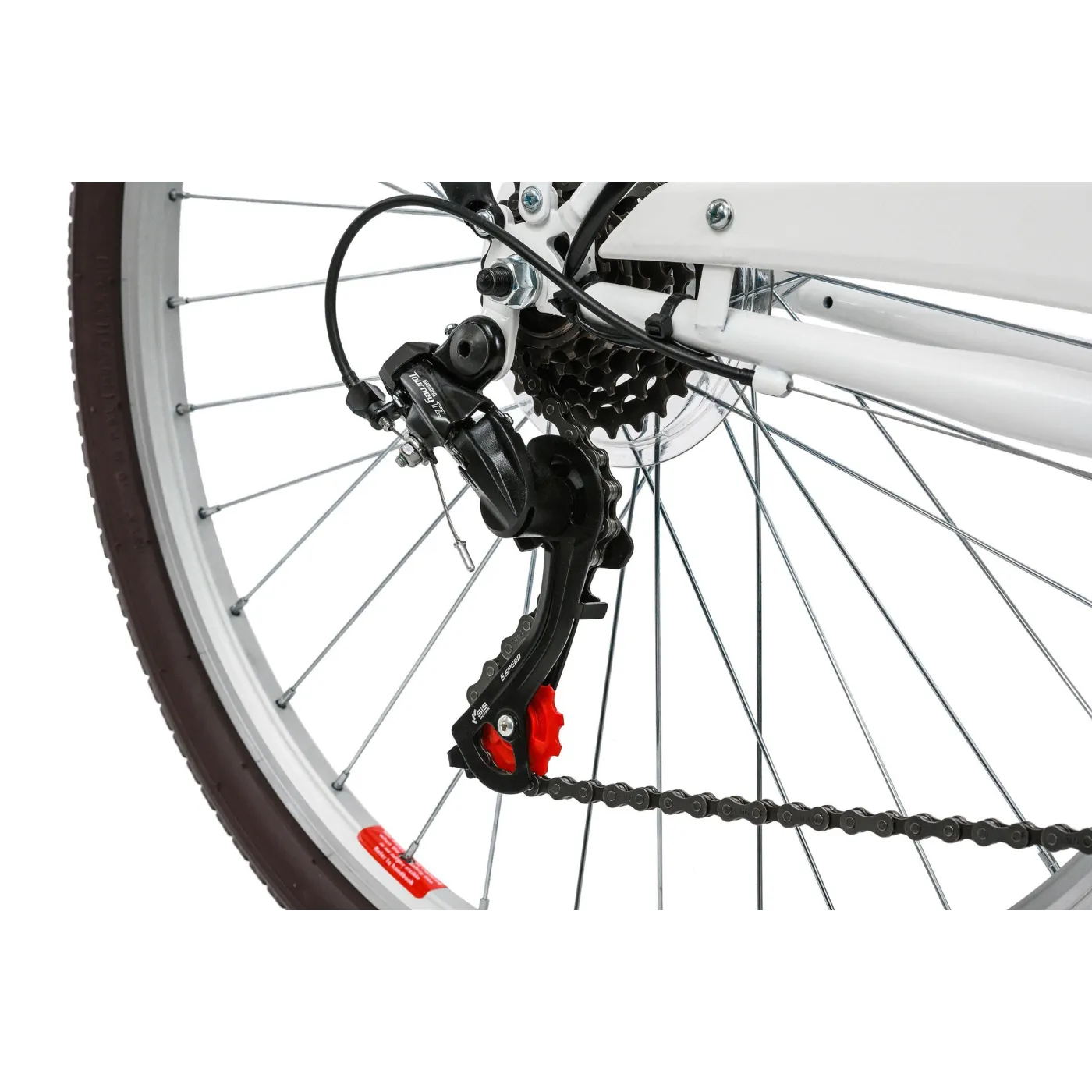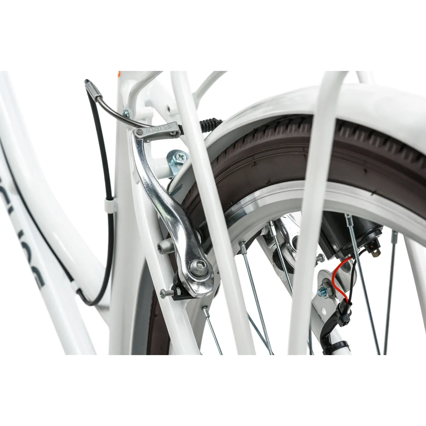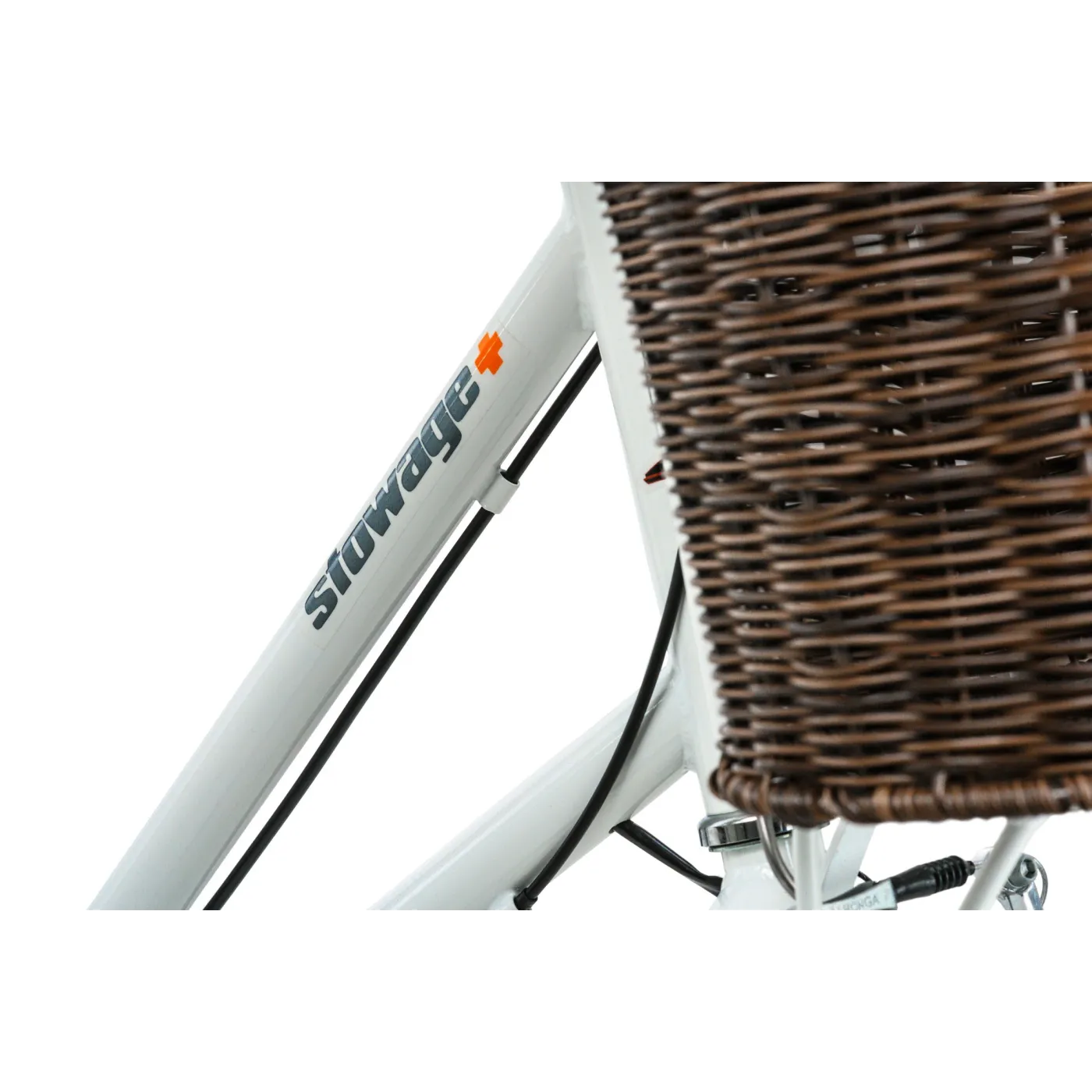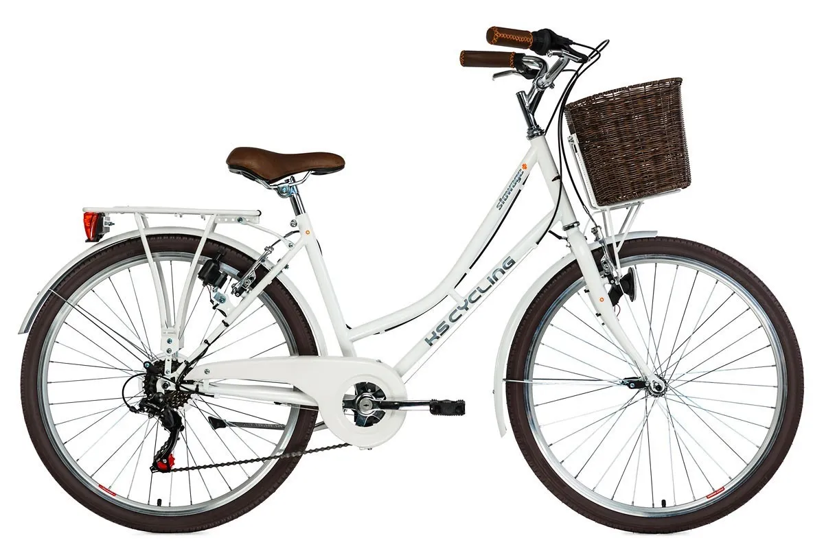Klasyczny rower miejski w kolorze białym dla kobiet, które na co dzień funkcjonują w mieście. Stowage jest praktyczny i stylowy. Wysoka kierownica i wygodne siodełko zapewnią komfort jazdy, a szyte gripy i brązowe wykończenie dodają uroku. Rower wyposażony jest w hamulce V-brake oraz 6 biegów, dzięki którym dopasuje się do warunków miejskich. Oświetlenie zasilane przez dynamo pozwoli na podróżowanie nawet po zmroku!