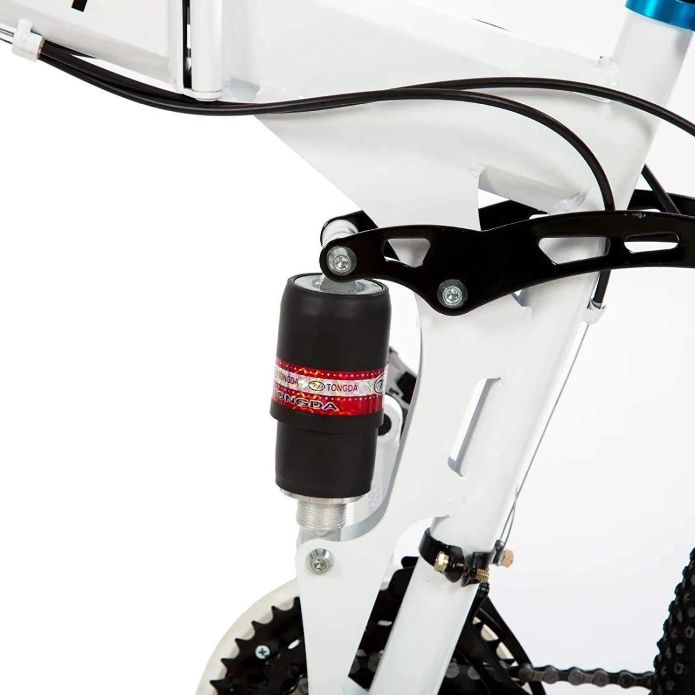 Stalowa rama, z trójwartstwowym kryciem, odporna na rdzę, jest solidna i trwała. Konstrukcja systemu podwójnych amortyzatorów, elastyczny przedni widelec oraz funkcja amortyzacji widelca zapewniają maksymalny komfort jazdy. Podwójne hamulce tarczowe z przodu i z tyłu oraz 21 biegów od Shimano sprawią, że jazda będzie wygodna w każdym terenie. Dodatkowym atutem jest to, że rower jest składany, dlatego można go transportować nawet w bagażniku.