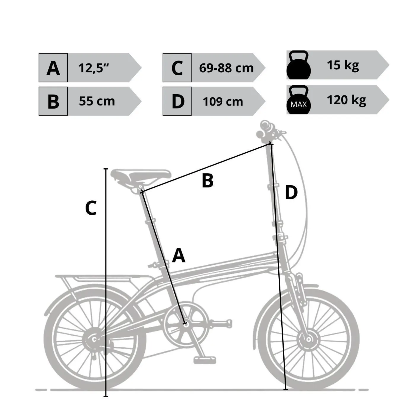 ✔️ Siodło można regulować od 69 cm do 88 cm od podłoża. Rowerzyści o wzroście od 150 cm do 185 cm mogą wygodnie przemieszczać się na ZF20 City Folder.