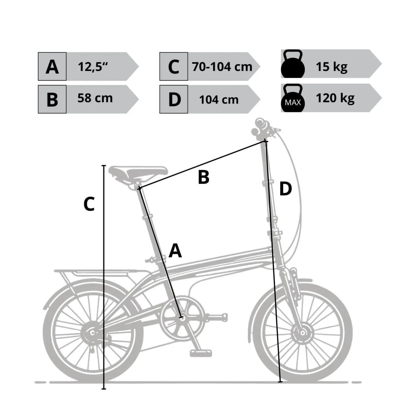 ✔️ Siodło można regulować od 70 cm do 104 cm od podłoża. Rowerzyści o wzroście od 150 cm do 185 cm mogą wygodnie przemieszczać się na ZF20 City Folder.