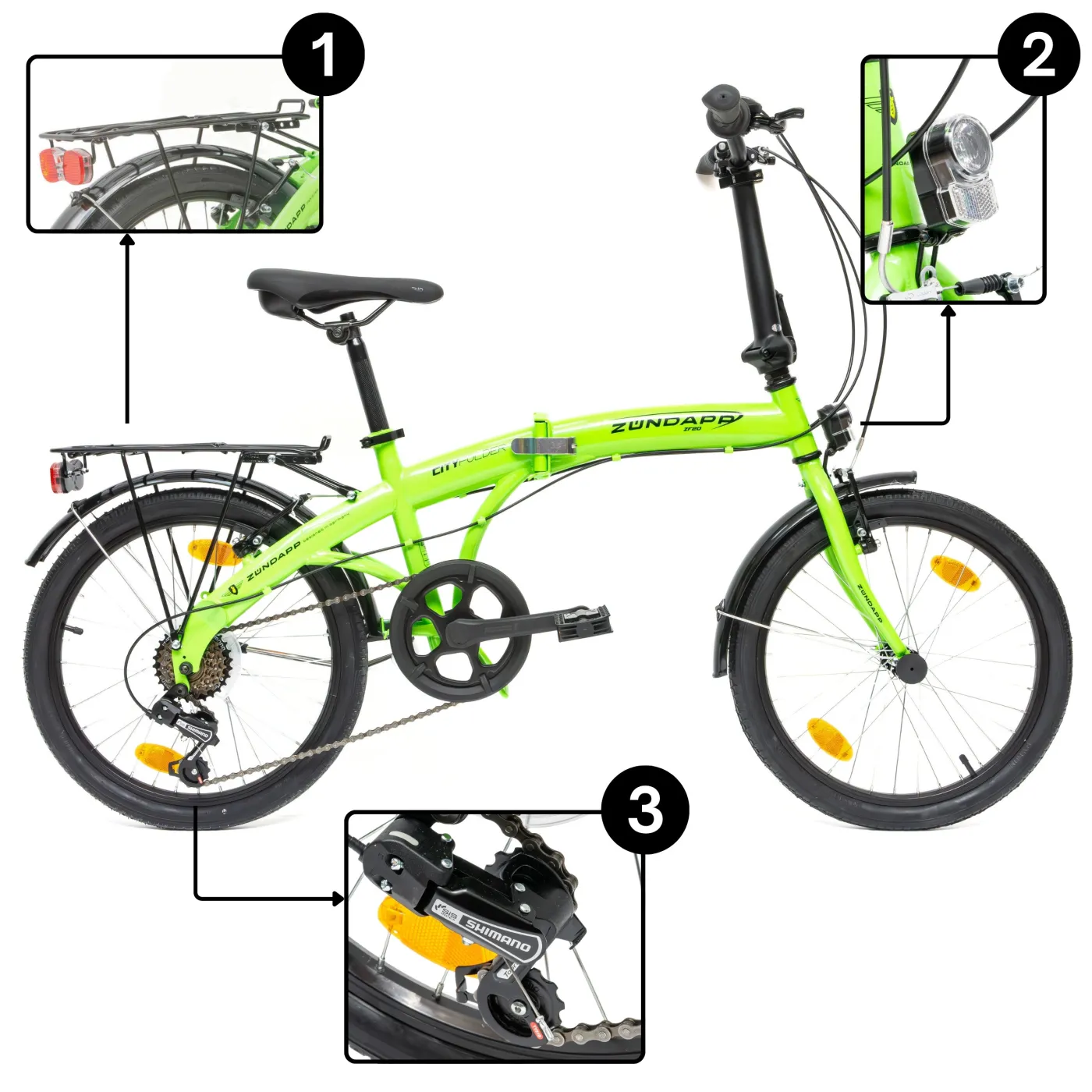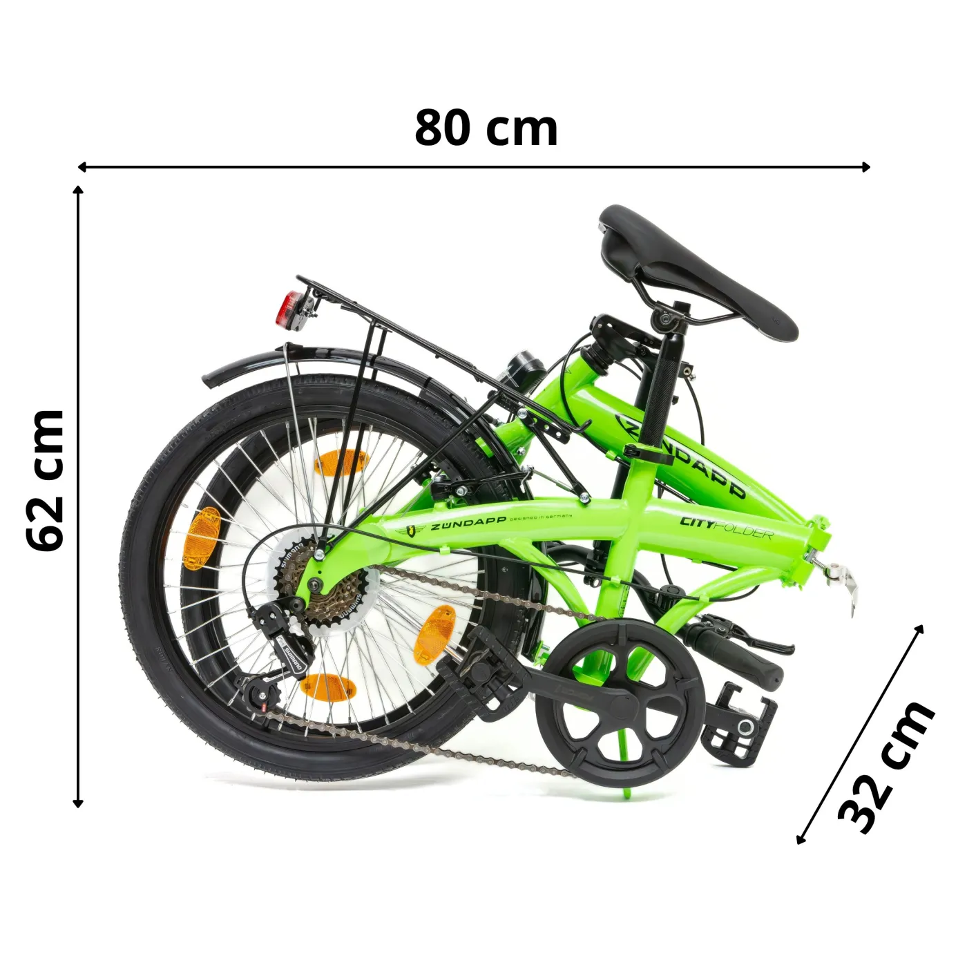 ▍ Zündapp ZF20 City Folder to kompaktowy rower miejski zaprojektowany z myślą o maksymalnej mobilności i wygodzie. Zielony połysk nadaje mu świeżego i nowoczesnego wyglądu.