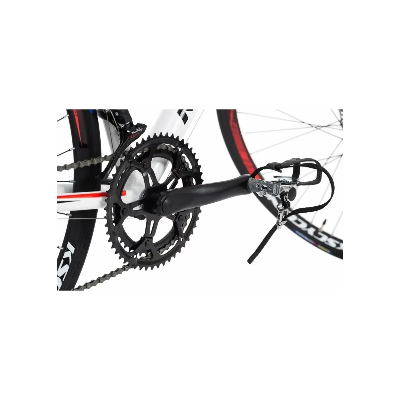 W pogoni za następnym etapem! Rower wyścigowy KS Cycling Euphoria to wręcz idealna maszyna wyścigowa dla początkujących, rekreacyjnych rowerzystów lub tych powracających. Na tym rowerze wyścigowym oderwiesz się od wszystkich: biała rama ozdobiona jest sportowym wzorem w czerwono-czarnych kolorach. Do dyspozycji użytkownik otrzymuje 14 biegów, które są regulowane za pomocą dźwigniowej manetki Shimano. O bezpieczeństwo podczas hamowania dbają podwójne hamulce tarczowe.