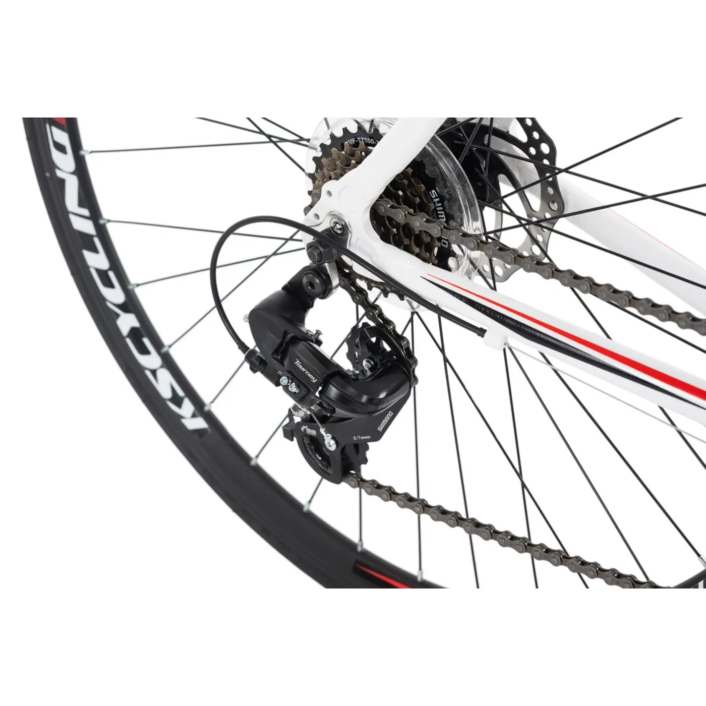 W pogoni za następnym etapem! Rower wyścigowy KS Cycling Euphoria to wręcz idealna maszyna wyścigowa dla początkujących, rekreacyjnych rowerzystów lub tych powracających. Na tym rowerze wyścigowym oderwiesz się od wszystkich: biała rama ozdobiona jest sportowym wzorem w czarno-srebrnych kolorach. Do dyspozycji użytkownik otrzymuje 14 biegów, które są regulowane za pomocą dźwigniowej manetki. O bezpieczeństwo podczas hamowania dbają podwójne hamulce typu Dual Pivot.