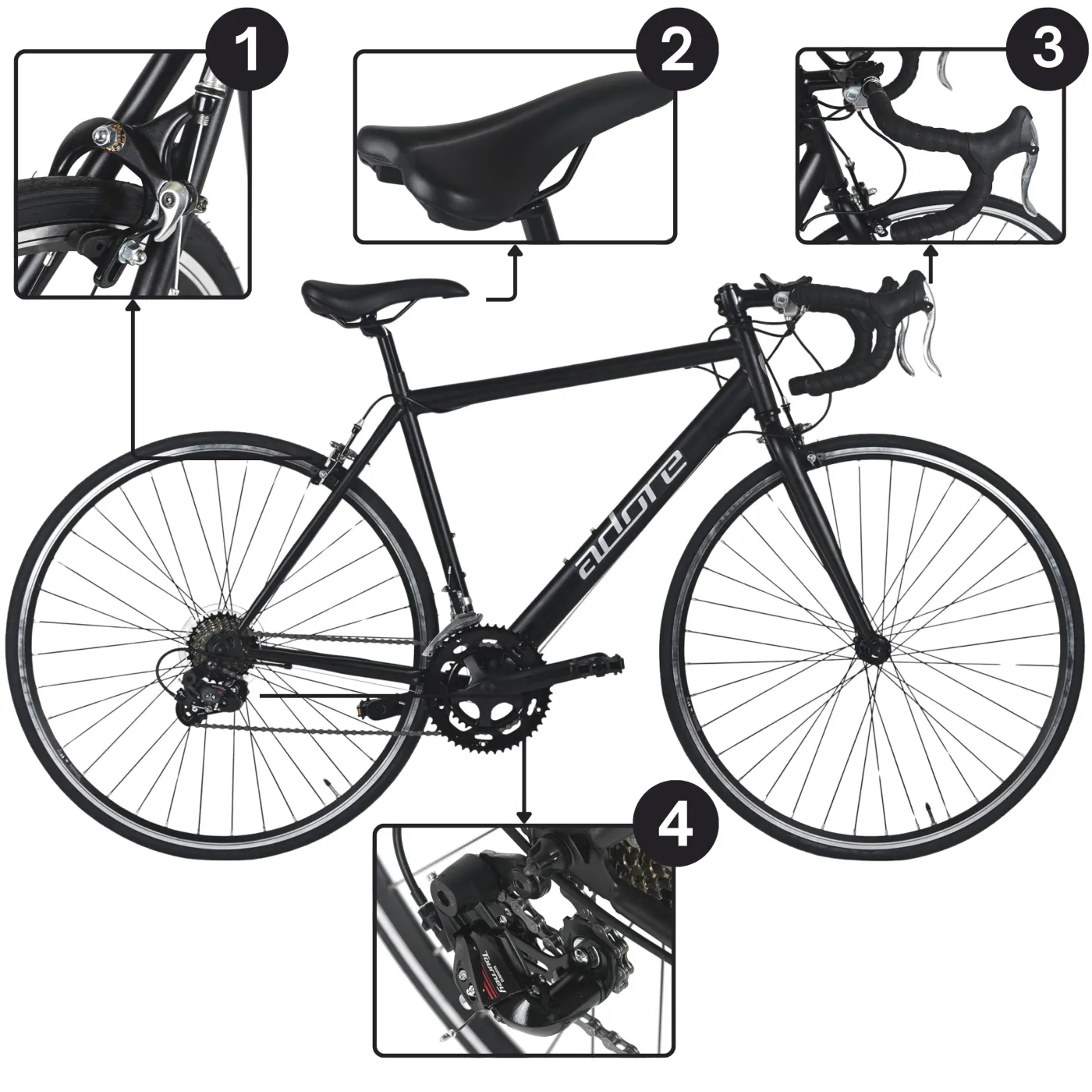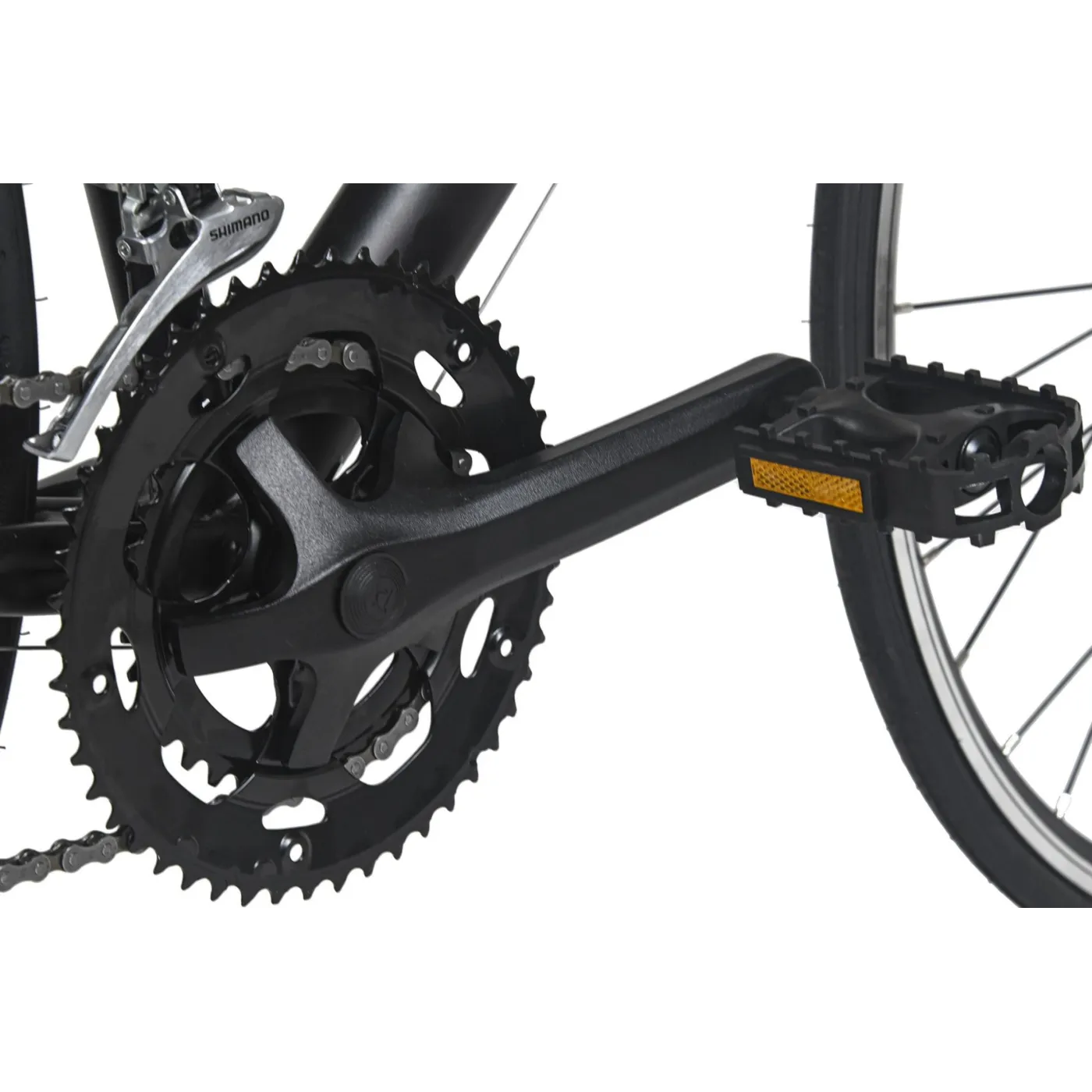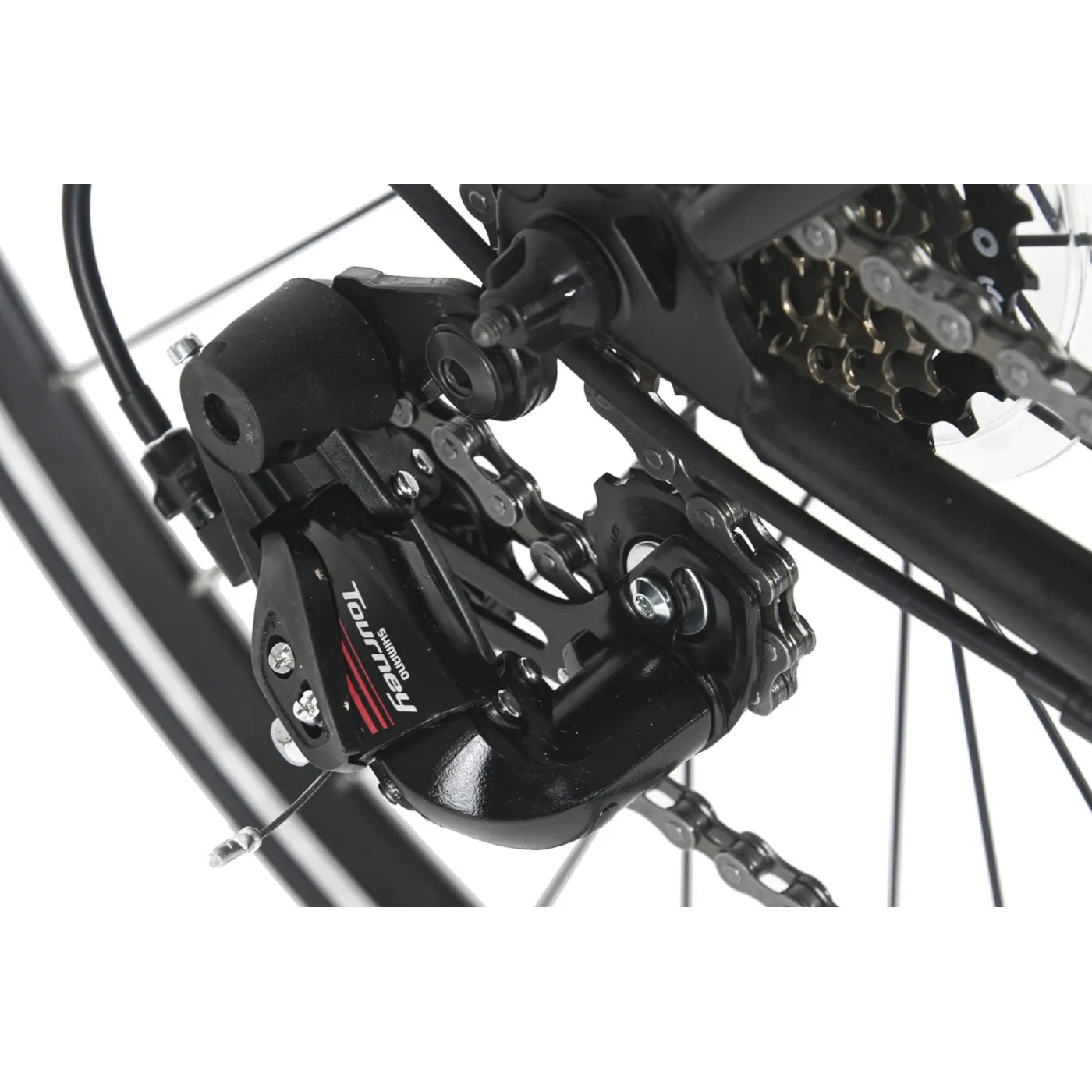 4️⃣ Przerzutka tylna SHIMANO Tourney (7-biegowa) – umożliwia płynną zmianę przełożeń, co ułatwia dopasowanie tempa jazdy do różnych warunków.