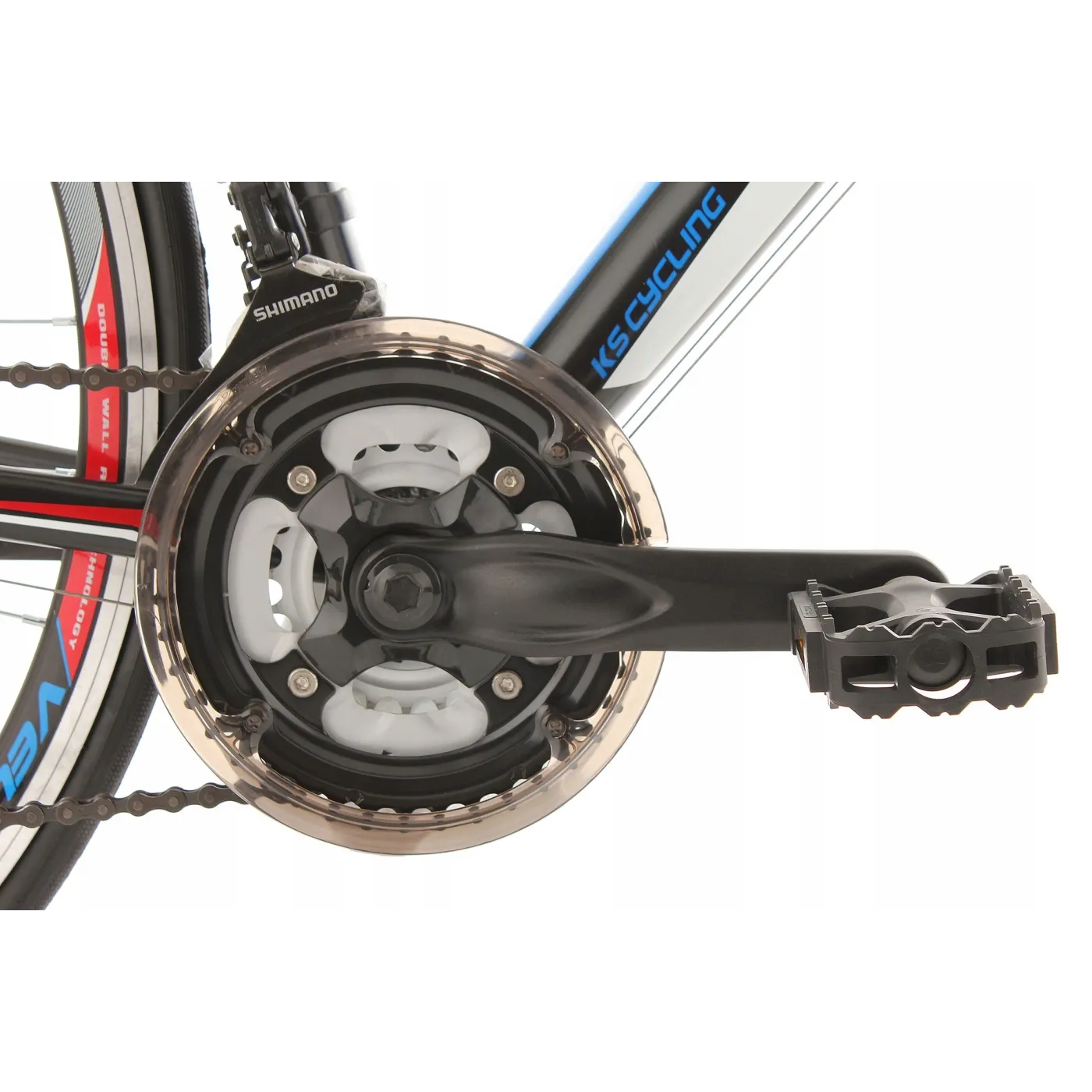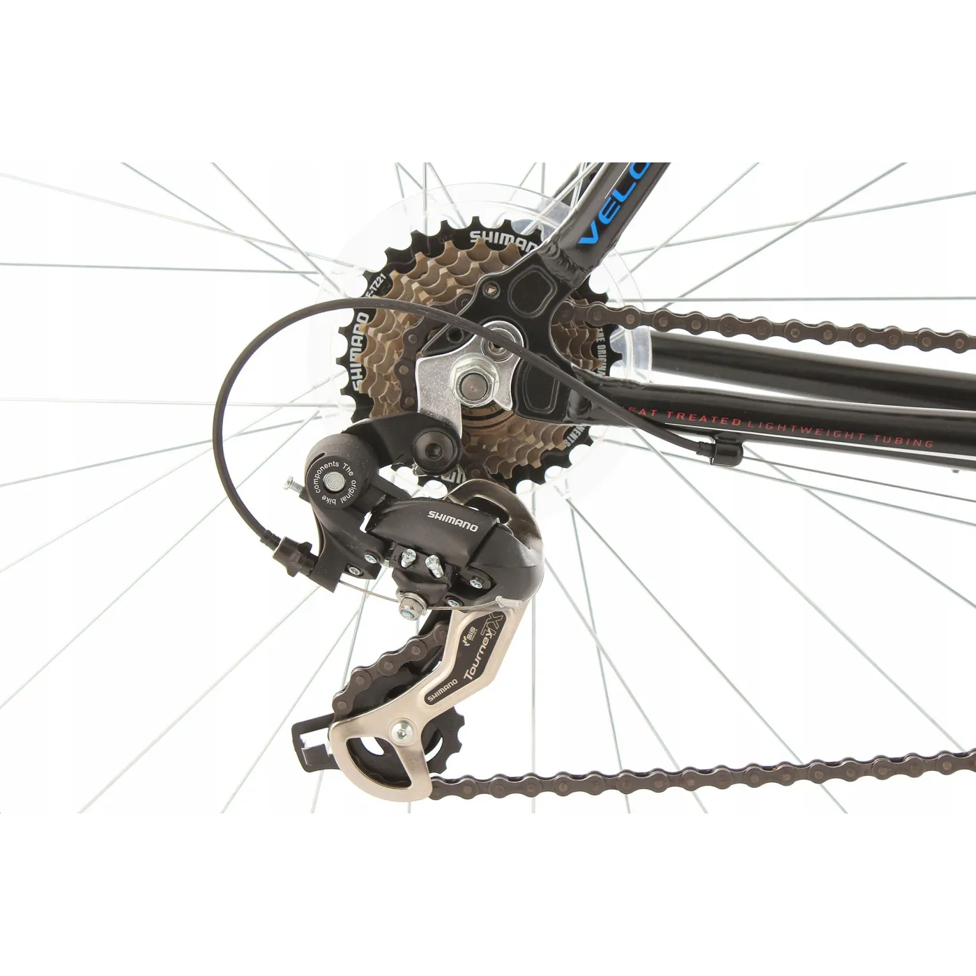 Czarny rower Velocity z detalami w kolorze białym, czerwonym i niebieskim nie tylko wygląda sportowo, ale również dzięki swojemu wyposażeniu technicznemu zapewnia maksymalną wydajność. Ergonomiczne siodełko idealnie sprawdza się zarówno podczas tych dłuższych jak i krótszych dystansów, dając odpowiednią wygodę jazdy. Model jest również bardzo lekki co zawdzięcza swojej aluminiowej budowie.
