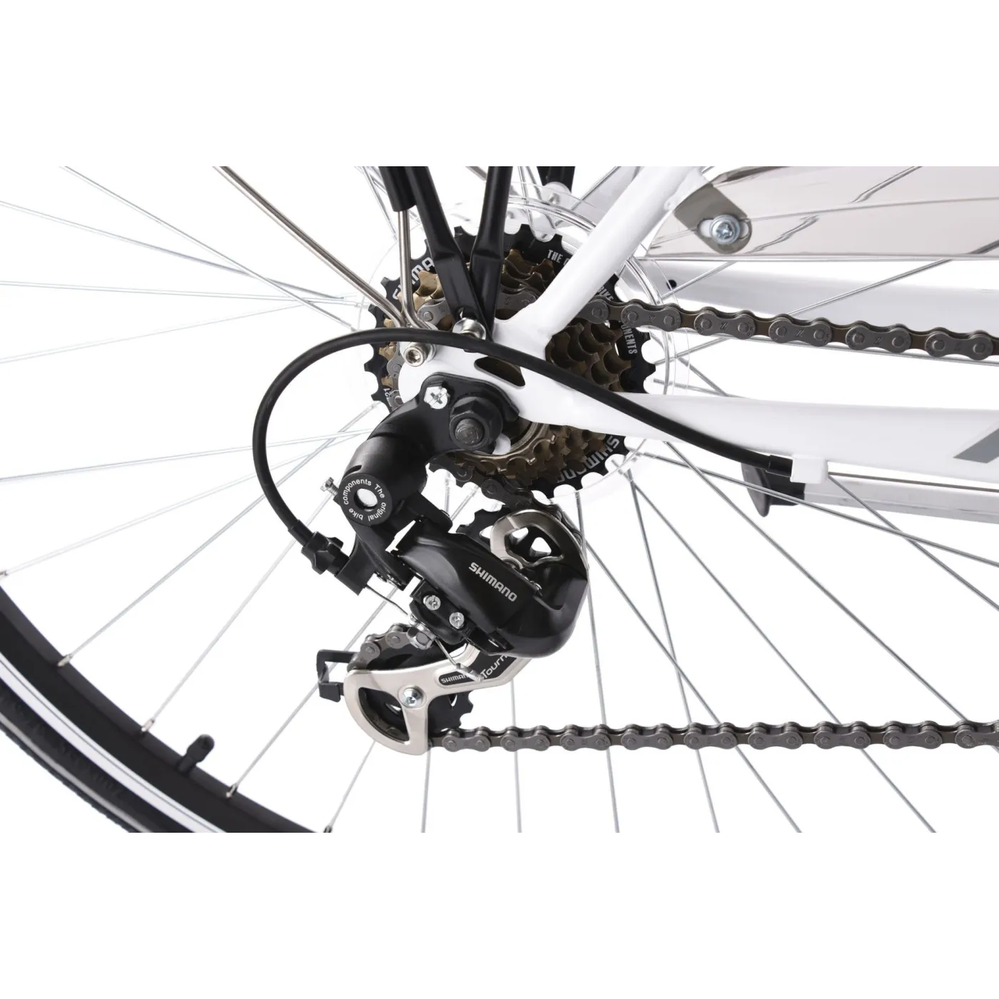 ⚙️ Sercem układu napędowego są sprawdzone komponenty marki Shimano. Przerzutka przednia i tylna z serii Tourney w połączeniu z 21 przełożeniami umożliwiają dostosowanie biegu do każdego terenu, niezależnie od tego, czy trasa wiedzie przez miejskie ulice, czy przez leśne ścieżki. Zmiana biegów odbywa się przy pomocy obrotowej manetki Revoshift, która zapewnia szybkie i intuicyjne przełączanie bez konieczności odrywania dłoni od kierownicy. To rozwiązanie szczególnie dobrze sprawdza się podczas codziennego użytkowania i jazdy w zmiennych warunkach.