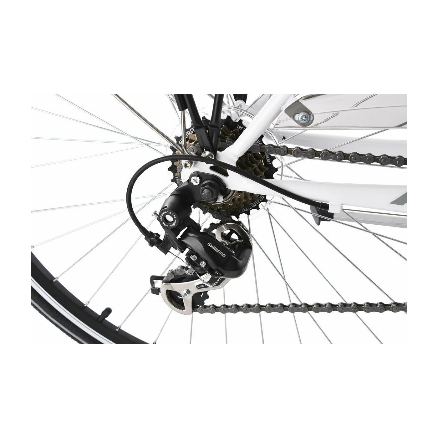 Biała, stalowa rama połączona z szarymi szczegółami, przezroczysta osłona łańcucha i płaska kierownica tworzą wyjątkowy projekt. 21 biegów Shimano pozwoli wygodnie podróżować, a lekko profilowana kierownica pozwala na odpowiednią kontrolę nad rowerem podczas jazdy. Dzięki oświetleniu napędzanemu za pomocą dynamo możesz bezpiecznie jeździć również po zmroku.