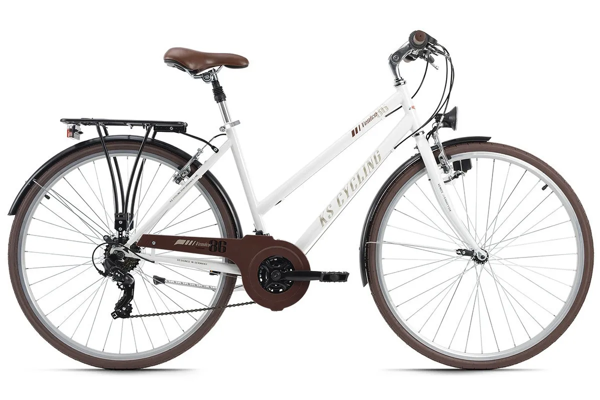 Niezależnie od tego, czy chcesz wygodnie jeździć po mieście, czy planujesz dłuższą wycieczkę: 28-calowy trekkingowy damski rower VENICE firmy KS Cycling jest zawsze z Tobą! Rower ma białą ramę z eleganckimi detalami. Zawiera również opony, osłonę łańcucha, siodełko i uchwyty w tym samym kolorze i dopełniają wzór.