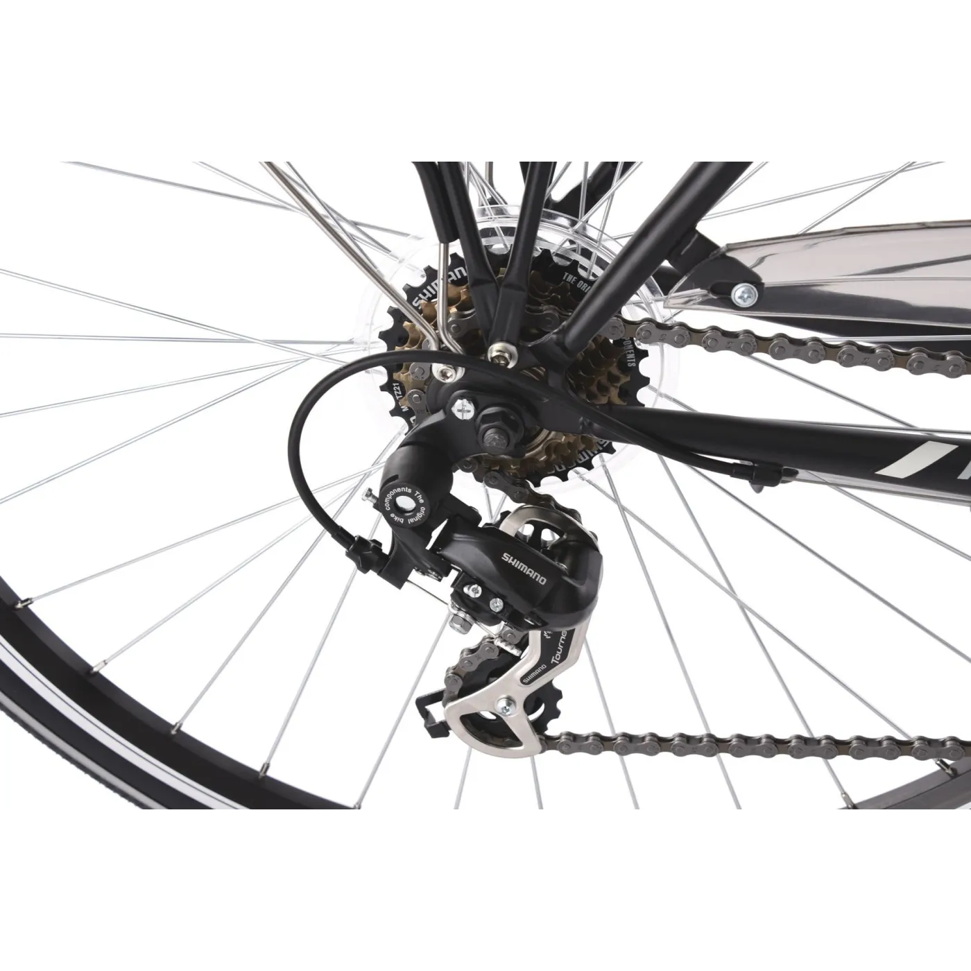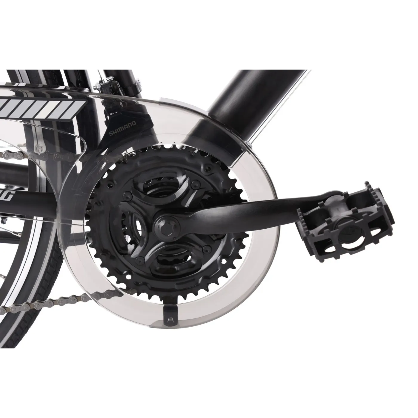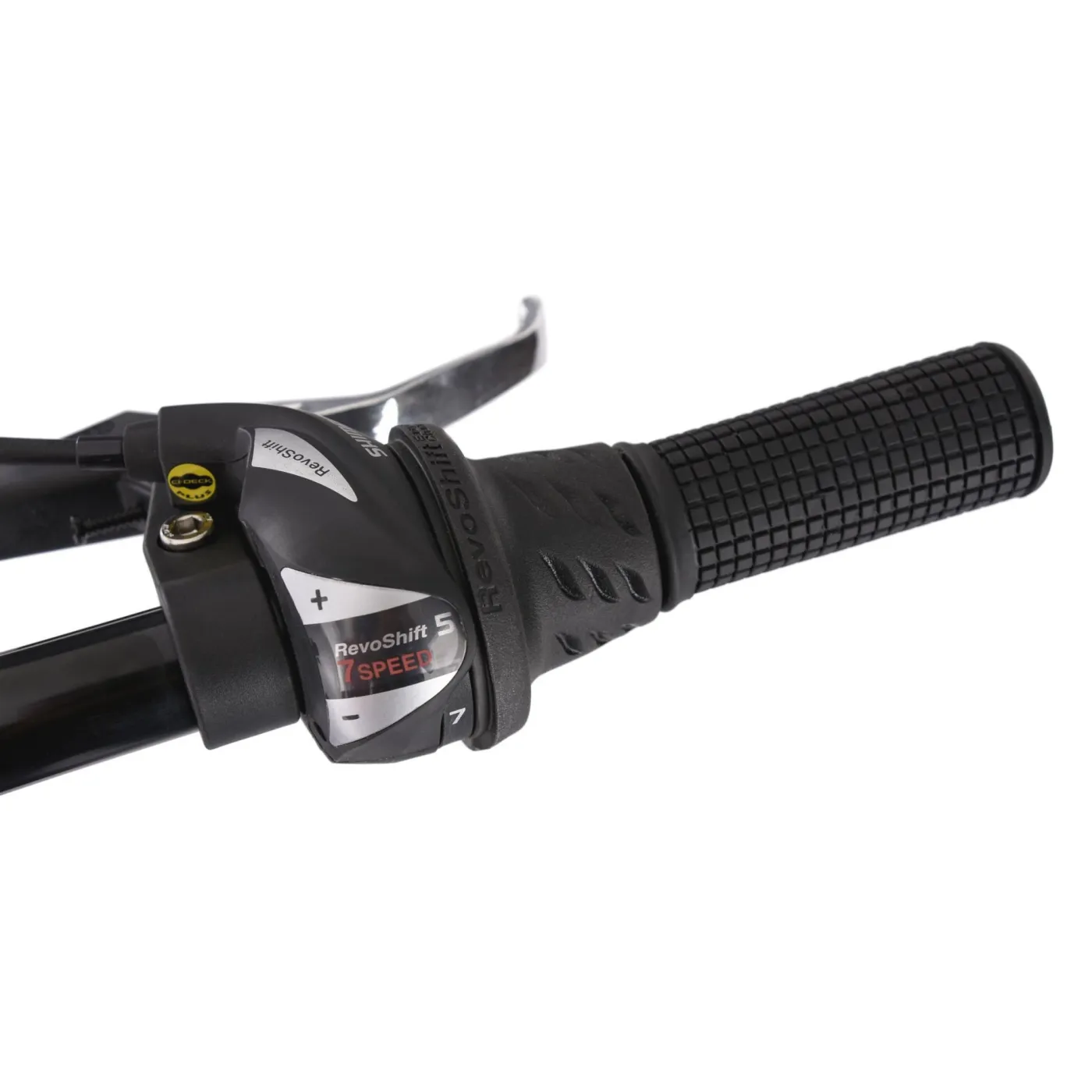 ⚙️ Napęd roweru oparto na sprawdzonym i niezawodnym zestawie. System 21 przełożeń oparty o przerzutkę przednią Shimano oraz przerzutkę tylną Shimano Tourney pozwala na wygodne i płynne dostosowanie tempa jazdy do warunków terenu. W połączeniu z prostą w obsłudze manetką RevoShift, zmiana biegów jest intuicyjna, a obsługa układu napędowego nie sprawia trudności nawet osobom mniej doświadczonym. Dzięki temu rower sprawdzi się zarówno podczas jazdy po mieście, jak i na nieco bardziej wymagających trasach rekreacyjnych.