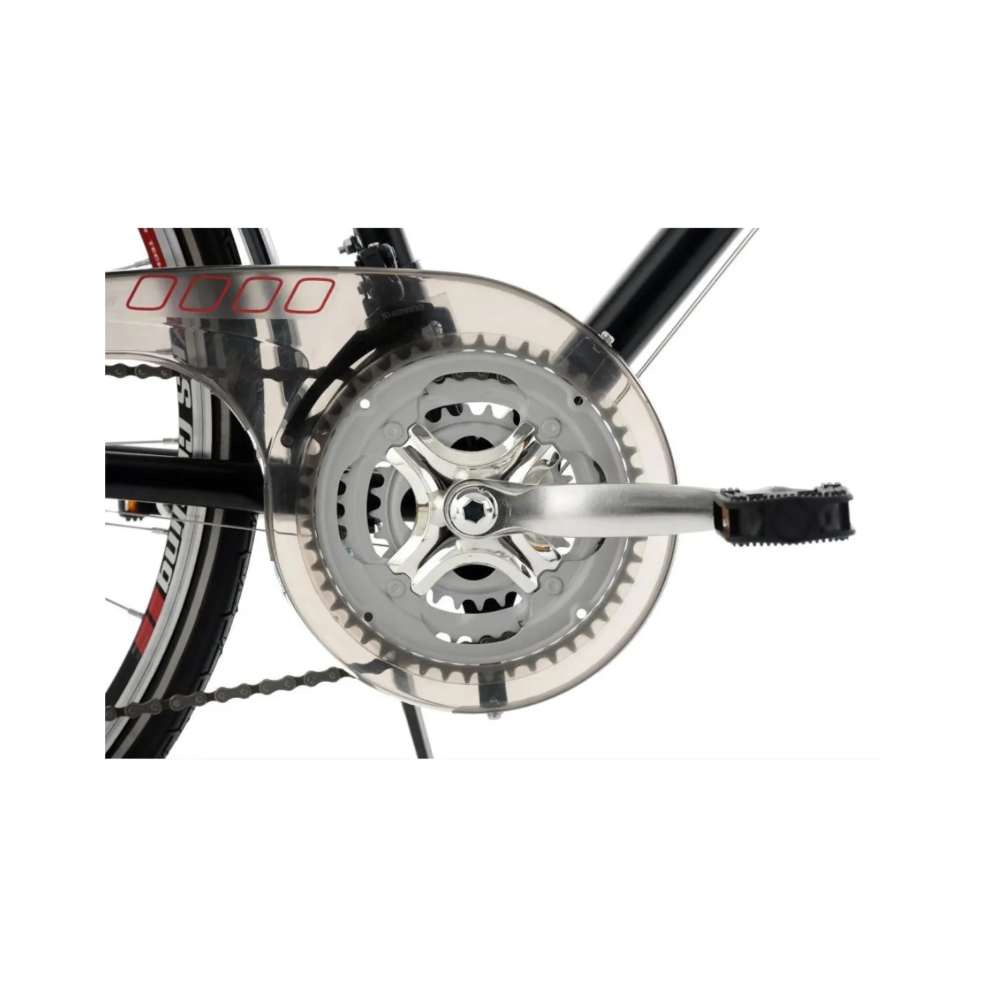 Rower ma czarną ramę z eleganckimi białymi detalami. Przezroczysta osłona łańcucha i wielopozycyjna kierownica jest idealnym dopełnieniem kompozycji projektu. Żadne wzniesienia nie będą stanowić już żadnych problemów dzięki zamontowanym przerzutką SHIMANO z 21 biegami. Wielopozycyjna kierownica umożliwia poruszanie rękami, co również umożliwia zmienianie pozycji siedzącej. Dzięki widelcowi amortyzowanemu małe nierówności na trasie są prawie niezauważalne, więc każda jazda na rowerze trekkingowym jest przyjemna dla przyjemności.